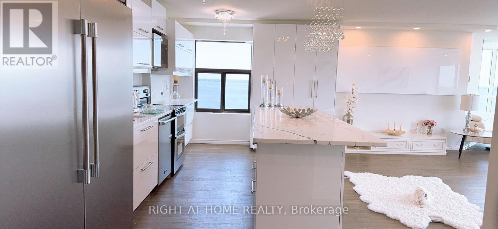 Experience luxury waterfront living in this rare 13th-floor, ~1,816 sq. ft. open-concept suite at the iconic Harbour Place Condominium, located in the heart of downtown Kingston. This fully renovated residence (2025) features brand-new windows installed in 2026, providing breathtaking, unobstructed views of Lake Ontario, Confederation Basin, and Kingston's historic shoreline from every room. Interior Features: 2 spacious bedrooms + den/office and 2 full bathrooms, offering a flexible and functional layout ideal for both everyday living and entertaining. In-suite laundry, generous closets, and a welcoming foyer. Modern, fully renovated interior with elegant finishes, bright open living areas, and floor-to-ceiling window walls framing the waterfront. 1 underground parking space included. $135,000 in special assessments already paid (new roof 2025; building envelope upgrades underway). All utilities included in monthly fees (heat, hydro, water, A/C, common elements, building insurance). Harbour Place is known for its premium resort-style amenities, including: Indoor pool, sauna, fitness centre, squash court, car wash, party room, library and hobby rooms. Residents also enjoy easy access to the marina and the city's exceptional waterfront trail network. Unmatched Location steps from Kingston City Hall, Market Square, waterfront parks, dining, shops, and cultural landmarks, Harbour Place is one of Kingston's most coveted addresses. Your suite directly overlooks the burgeoning Confederation Basin Promenade, a major waterfront enhancement project adding accessible walkways, seating, viewing points, and upgraded public spaces extending along the breakwall. When complete, the promenade will include enhanced swimming access, expanded public areas, and a new waterfront experience-making your view even more valuable (42004970)