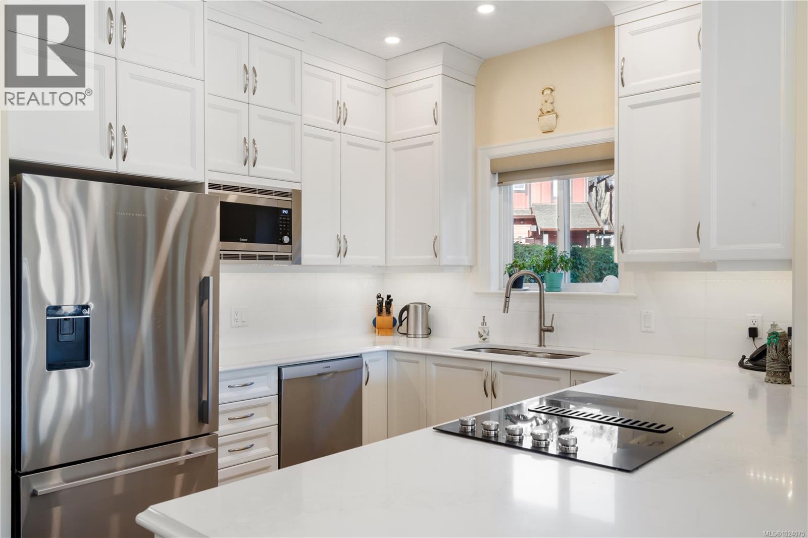 Beautifully renovated kitchen offering high-quality stainless steel appliances, highlighted by a Fisher & Paykel counter-depth refrigerator.