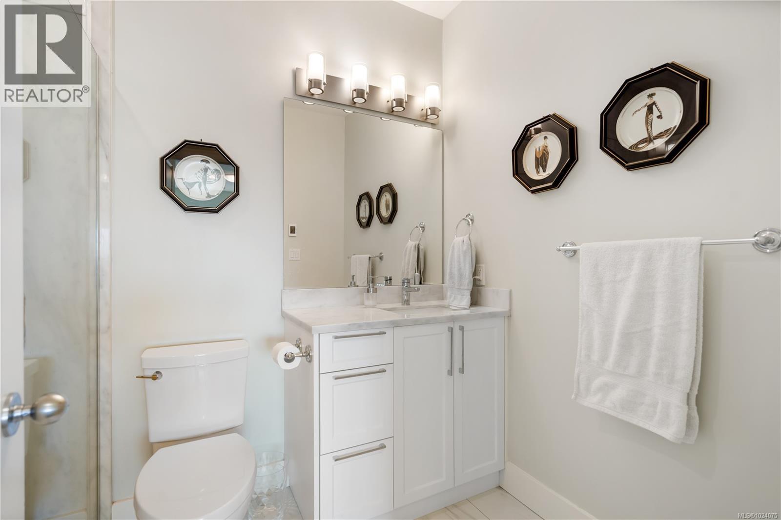Stylish, newly updated ensuite boasting porcelain tile floors with in-floor heating, a marble countertop vanity, and a comfort-height toilet for modern convenience