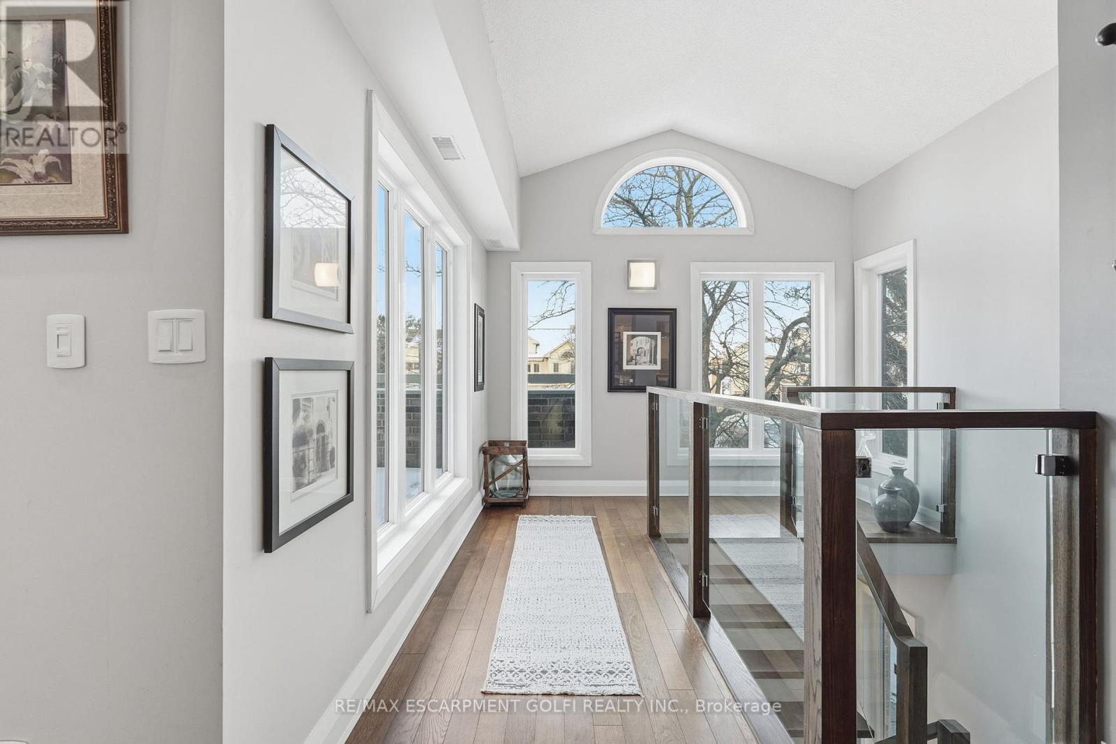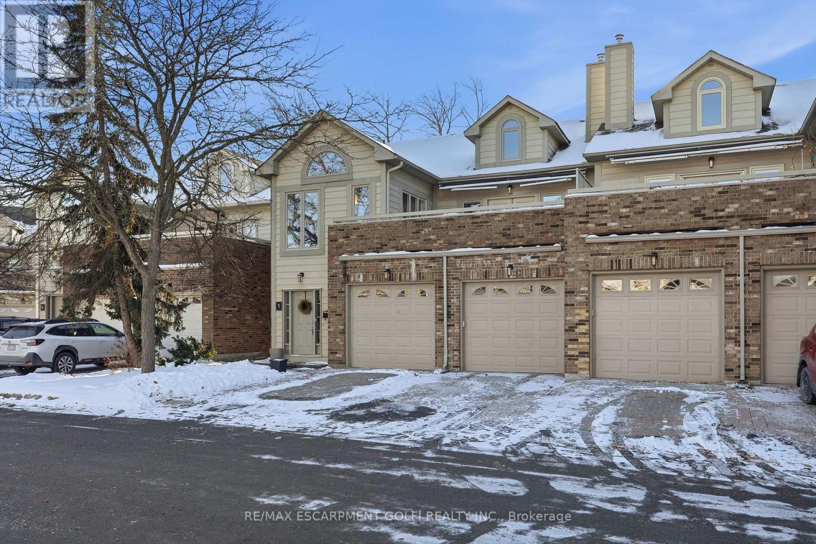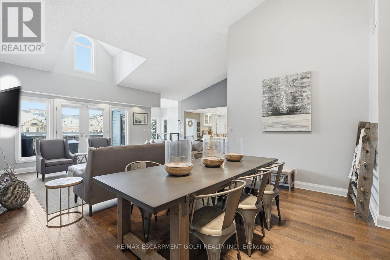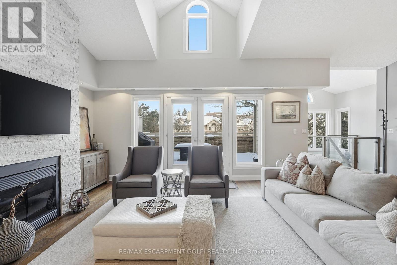 Exceptional executive townhome in The Terraces on New Street. Sun-filled great room with soaring 15.5' cathedral ceilings and gas fireplace. Rich hardwood flooring throughout. Chef-inspired kitchen with quartz counters and generous peninsula. East-facing terrace perfect for morning coffee or entertaining. Two main floor bedrooms, each with full bath. Primary suite features a spa-like 5pc ensuite, walk-in and walk-through closets. Second bedroom with ensuite privilege to 4pc bath. Convenient main-floor laundry. Fully finished lower level with full bath, additional walk-in closet with built-ins, multiple storage closets, and versatile space ideal for gym, office, or guest suite. All new windows replaced in 2024. Inside garage entry, ample storage, and maintenance-free living. Steps to downtown Burlington, the lake, schools, parks, and shopping. A rare turnkey opportunity in a sought-after location. (42007367)