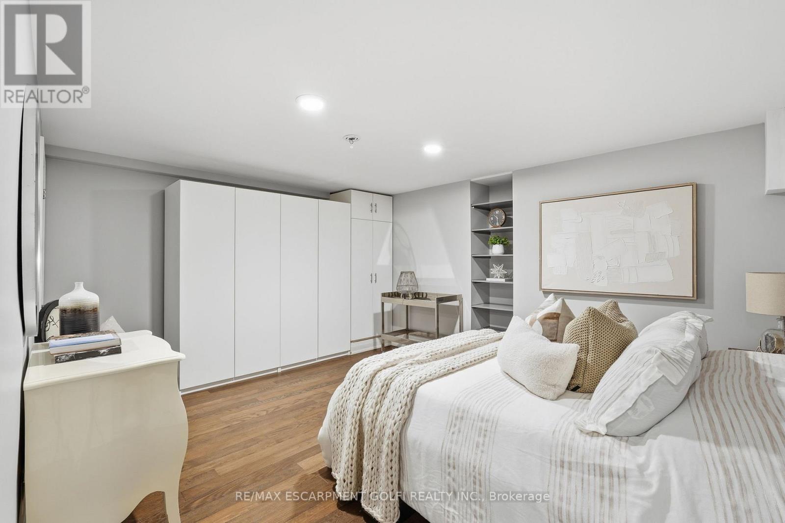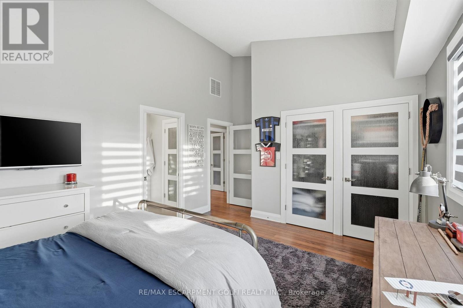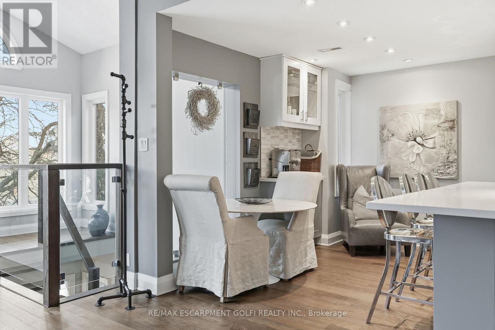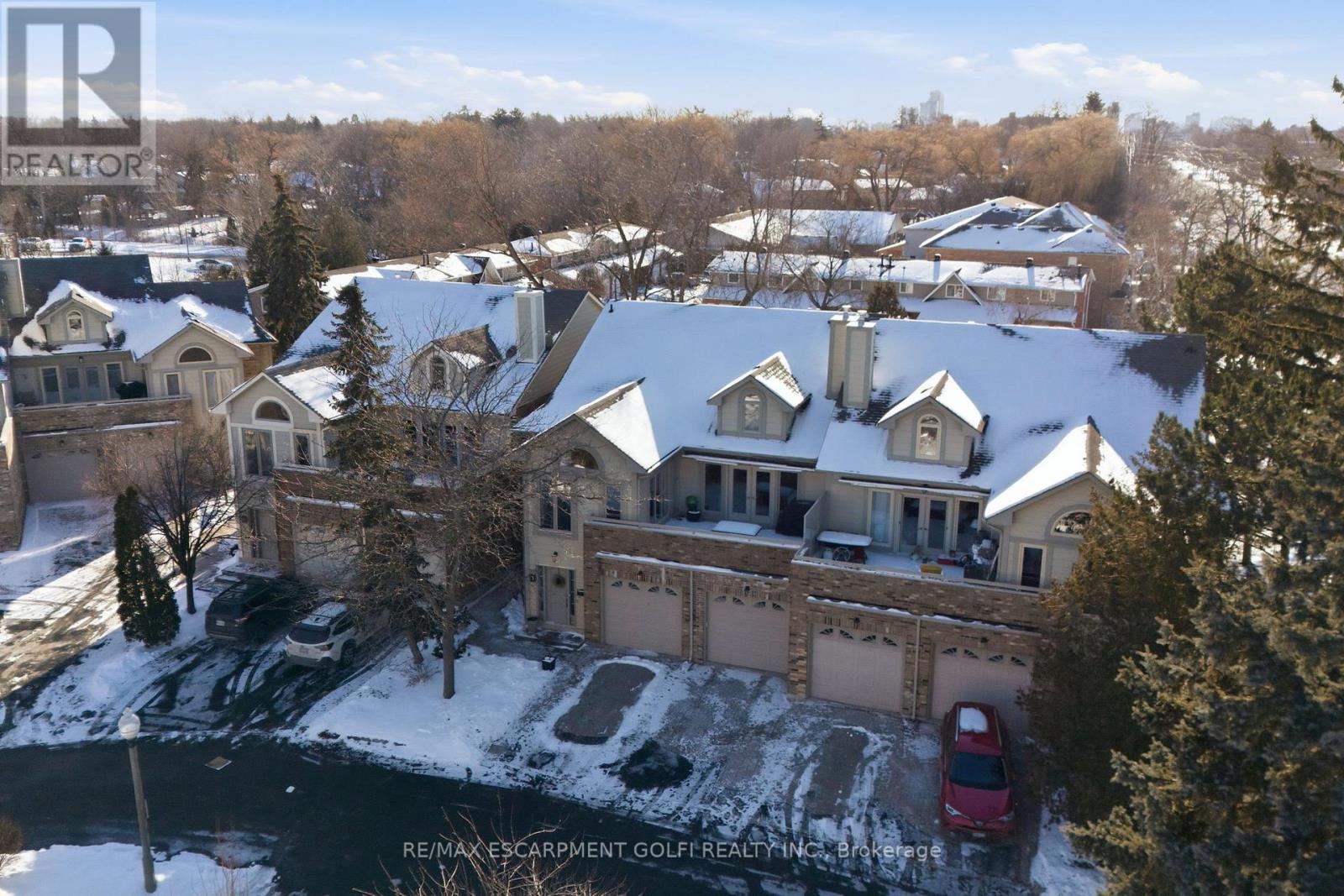 Exceptional executive townhome in The Terraces on New Street. Sun-filled great room with soaring 15.5' cathedral ceilings and gas fireplace. Rich hardwood flooring throughout. Chef-inspired kitchen with quartz counters and generous peninsula. East-facing terrace perfect for morning coffee or entertaining. Two main floor bedrooms, each with full bath. Primary suite features a spa-like 5pc ensuite, walk-in and walk-through closets. Second bedroom with ensuite privilege to 4pc bath. Convenient main-floor laundry. Fully finished lower level with full bath, additional walk-in closet with built-ins, multiple storage closets, and versatile space ideal for gym, office, or guest suite. All new windows replaced in 2024. Inside garage entry, ample storage, and maintenance-free living. Steps to downtown Burlington, the lake, schools, parks, and shopping. A rare turnkey opportunity in a sought-after location. (42007367)