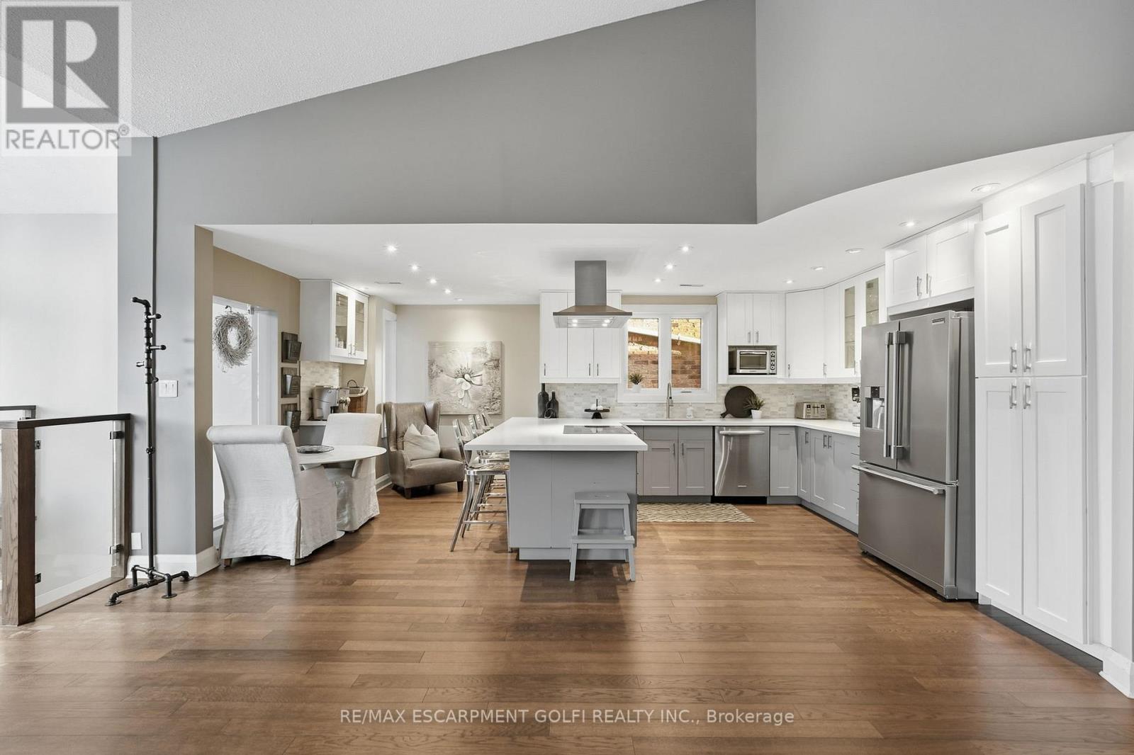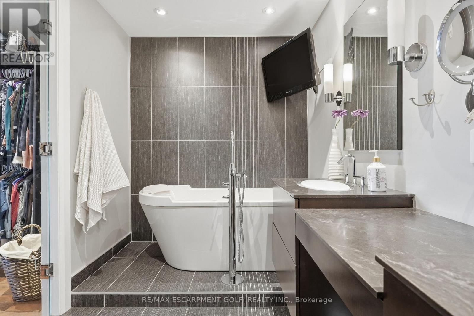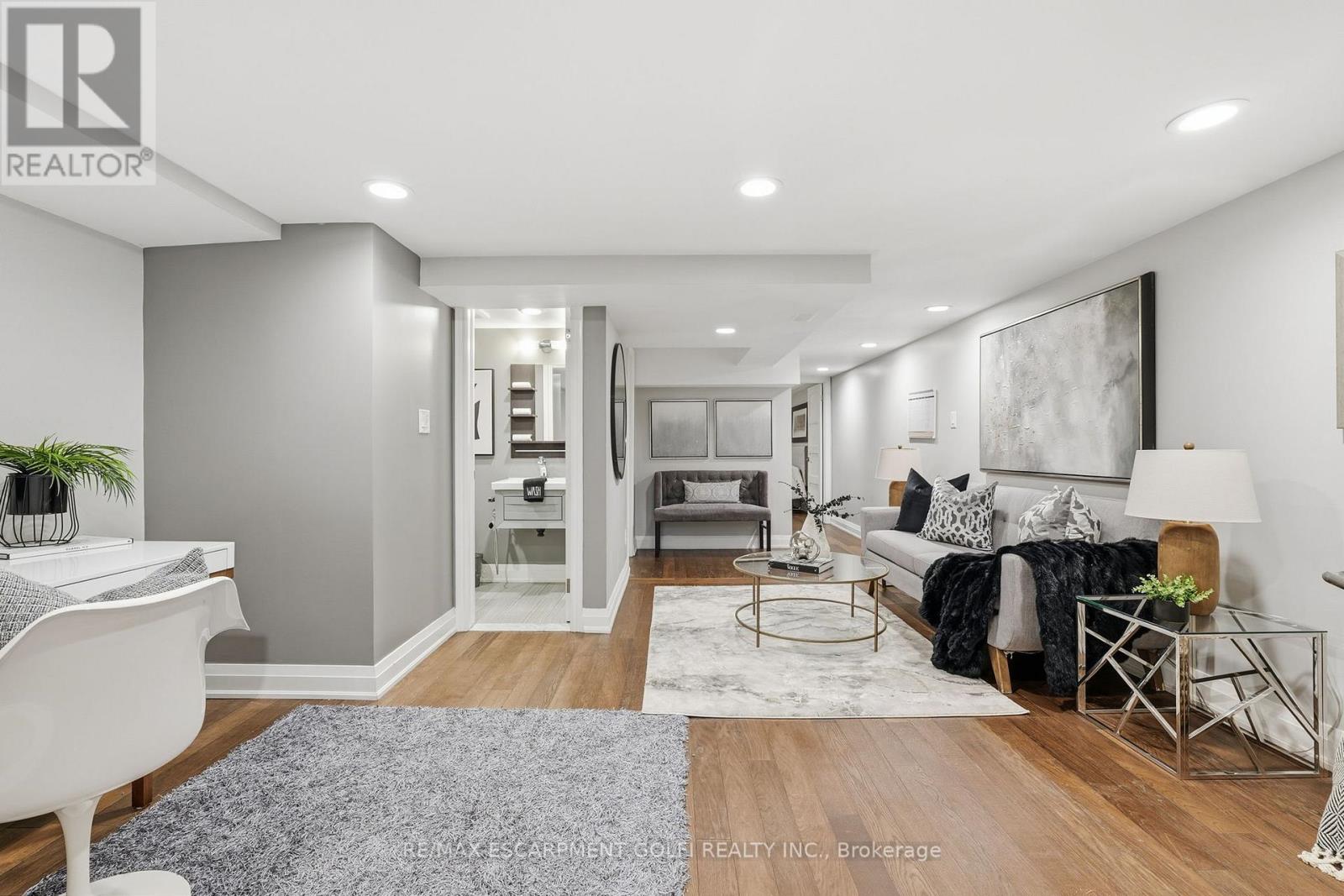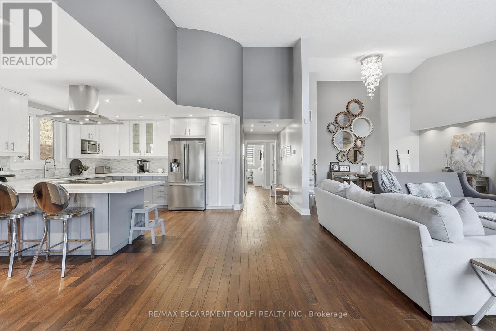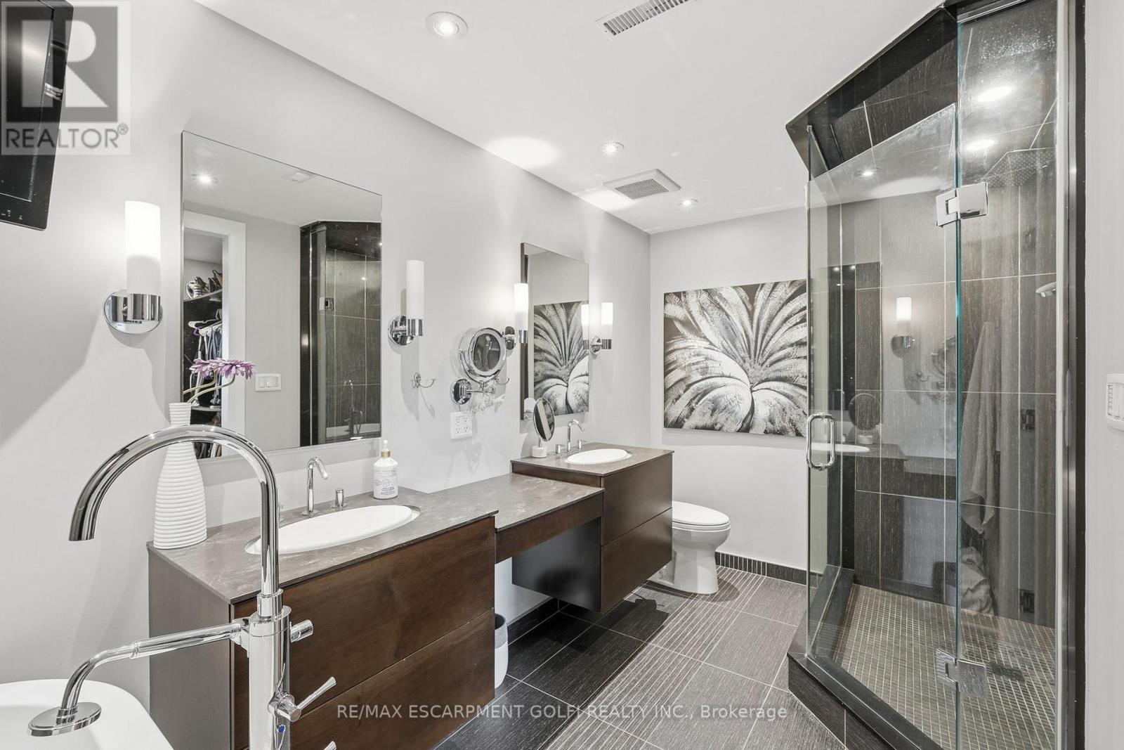 Exceptional executive townhome in The Terraces on New Street. Sun-filled great room with soaring 15.5' cathedral ceilings and gas fireplace. Rich hardwood flooring throughout. Chef-inspired kitchen with quartz counters and generous peninsula. East-facing terrace perfect for morning coffee or entertaining. Two main floor bedrooms, each with full bath. Primary suite features a spa-like 5pc ensuite, walk-in and walk-through closets. Second bedroom with ensuite privilege to 4pc bath. Convenient main-floor laundry. Fully finished lower level with full bath, additional walk-in closet with built-ins, multiple storage closets, and versatile space ideal for gym, office, or guest suite. All new windows replaced in 2024. Inside garage entry, ample storage, and maintenance-free living. Steps to downtown Burlington, the lake, schools, parks, and shopping. A rare turnkey opportunity in a sought-after location. (42007367)