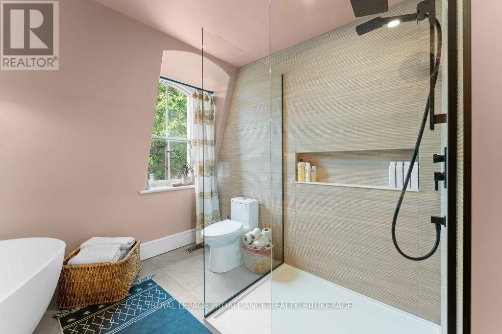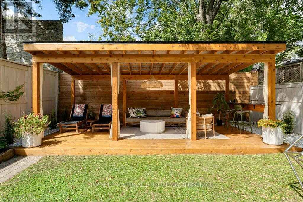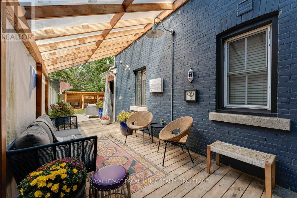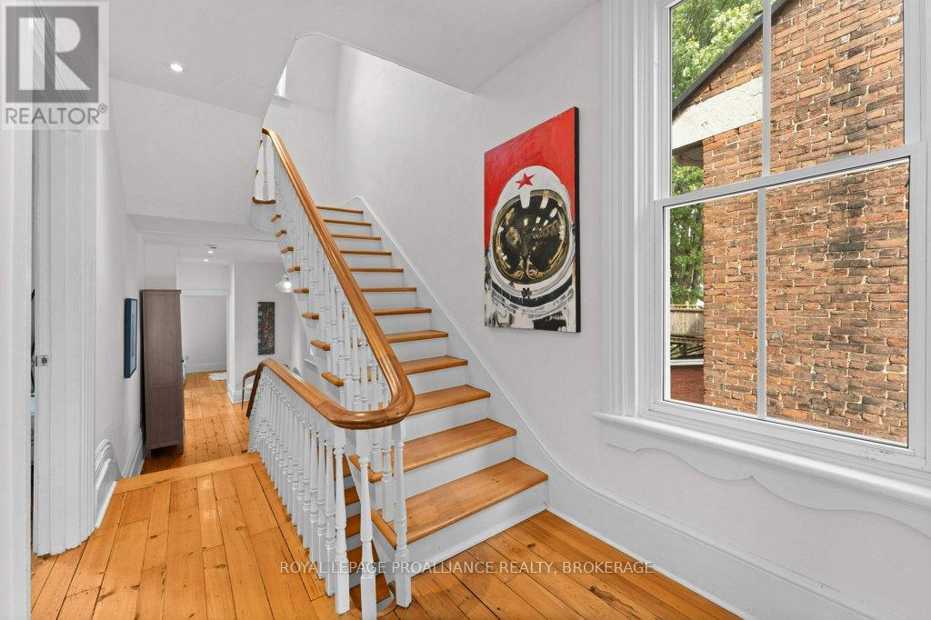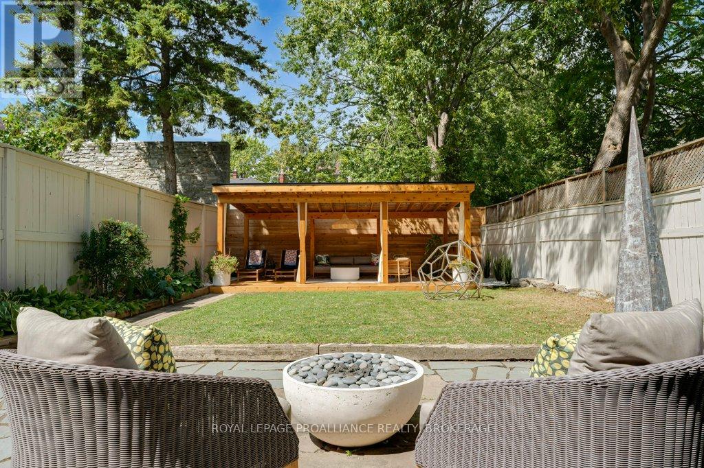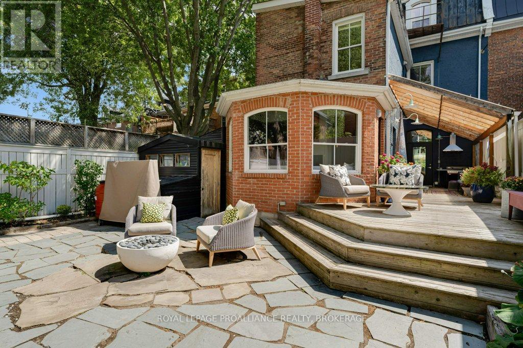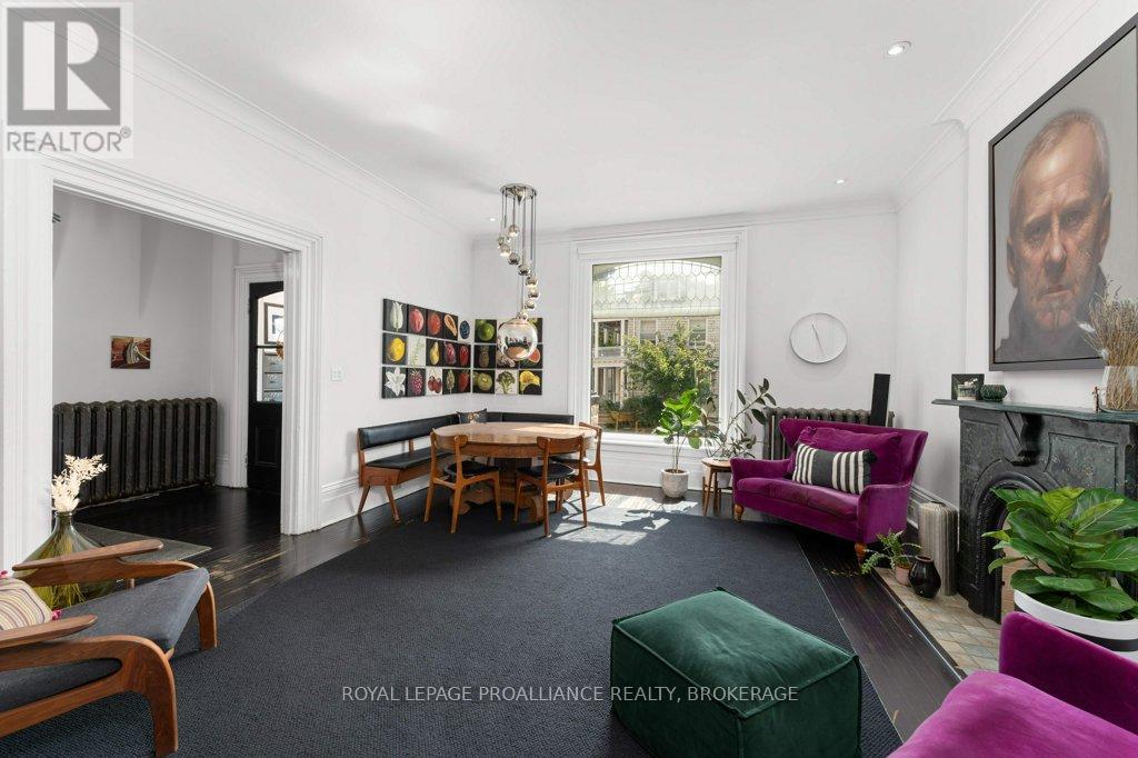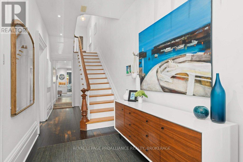 Rare opportunity to take over a piece of history with this classic and delightful five-bedroom family home, in the heart of the coveted Sydenham Ward in downtown Kingston. This charming residence was meticulously designed by renowned architect Jonathan Power in 1878, and benefits from a remarkably large garden, difficult ever to find in this central location, just steps from Market Square, KGH and Queens .Enjoy the comforts of modern living with a recent full renovation (designed by the interior designer owner) which included a new kitchen, luxurious bathrooms, and an elegantly finished basement equipped with 8 high ceilings and ample natural light. The expansive rear garden is a true gem, featuring a stylish deck and a European-style gazebo(just built), providing an idyllic space for relaxation and entertainment. Plus a gas fire piton the terrace to enjoy on cooler evenings. This home harmoniously blends classic architecture(both inside and out) with contemporary amenities. Enjoy the original restored radiators for character, alongside modern air conditioning on the top three storeys and efficient radiant heat from a new gas-fired boiler. From the fully restored front porch and balcony crafted with cedar and ipe wood to the inline parking accommodating up to three vehicles with a carport, every detail has been considered. With five generously sized bedrooms and three baths, there is plenty of room for the entire family to live and thrive. This is a unique opportunity to own a stunning home that offers both historic charm and modern convenience in the heart of Sydenham Ward. (42007921)