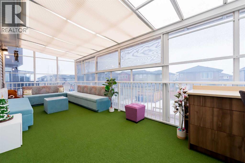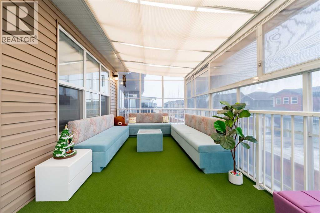 **Fully developed with a walkout basement, approximately 3,300 sq. ft. of total developed living space, two three-season sunrooms (approx. 450 sq. ft.), a 6.4 kW solar panel system (16 panels), a 200-amp electrical panel, epoxy flooring in the garage, and low-maintenance artificial turf in the backyard—features like these are rarely found at this price point**. Welcome to this beautifully upgraded home in the highly sought-after community of Evanston, situated on a traditional 35-ft-wide lot and offering approximately 3,300 sq. ft. of fully developed living space. The main floor features a private office/den, a spacious, sun-filled living area with large windows, a dining area with custom seating, and elegant high-end laminate flooring, complemented by 9-foot ceilings. The chef’s kitchen is designed to impress, featuring quartz countertops, under-cabinet lighting, ceiling-height cabinetry, and premium stainless-steel appliances, including a Bosch built-in oven and microwave. A walk-through pantry with durable titanium wire shelving adds everyday convenience. A convenient half bath (with potential to convert to a full bath) and a three-season sunroom just off the living room complete the main level. Upstairs, a large bonus room sits centrally, thoughtfully separating the primary bedroom from the two additional bedrooms. This bonus space includes custom seating—perfect for movie nights or family gatherings. The primary bedroom offers a walk-in closet, a luxurious 5-piece ensuite with dual sinks, a custom standing shower, and a soaker tub. Two additional well-sized bedrooms, an upper-floor laundry room, and a second full bathroom featuring dual sinks and a standing shower with a custom tile base complete the upper level. The fully developed walkout basement offers a wet bar, a four-piece bathroom, and a spacious recreation area ideal for a home theatre, gym, or playroom. A SONOS 7.1 home theatre speaker system and an electric fireplace add comfort and entertainment val ue. The walkout layout also provides excellent potential to convert the basement into a legal suite (subject to City approval). Located in the vibrant, family-friendly community of Evanston, this home offers easy access to Stoney Trail, top-rated public and Catholic schools (including a new middle school opening soon), parks, walking paths, and nearby shopping centres. Recent updates include: roof and siding (2024), new carpet (2025), and fresh interior paint (2025). A water purifier, water softener, and home theatre system are included in the sale. This home stands out not only for its luxury finishes but also for its energy-efficient upgrades. The 6.4 kW solar panel system (16 panels) significantly reduces electricity costs, offering long-term savings and protection against rising energy prices—an increasingly valuable feature for today’s discerning buyers. Don’t miss this exceptional opportunity—book your private showing today! (31565010)