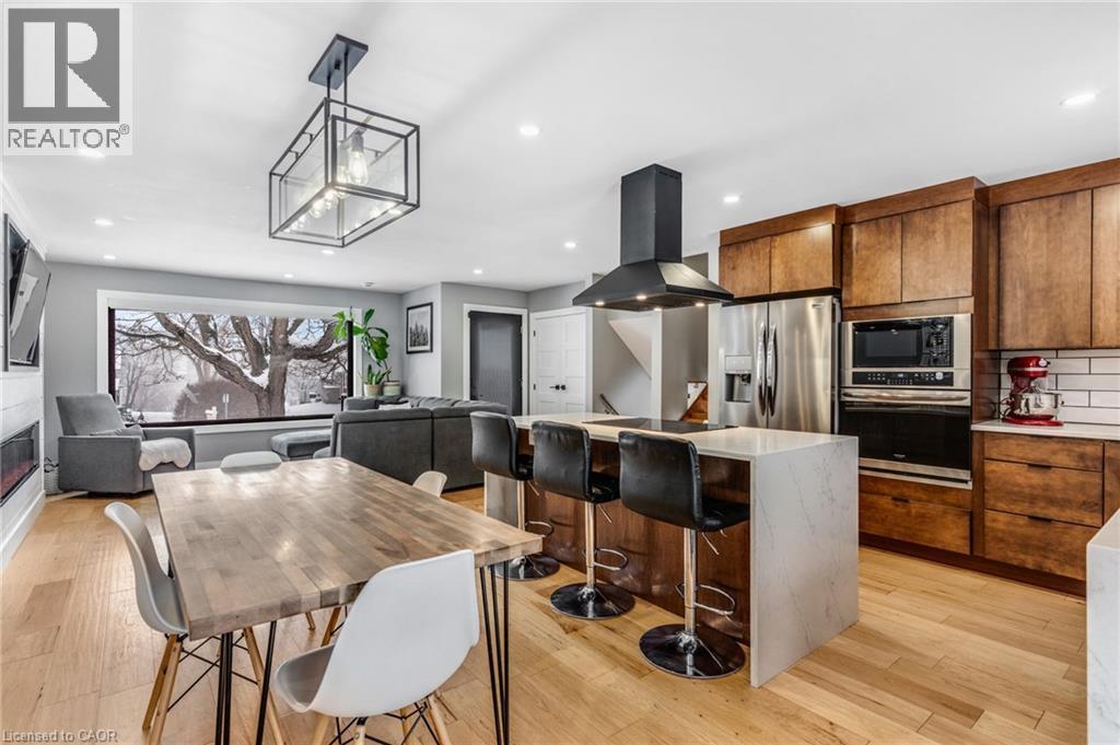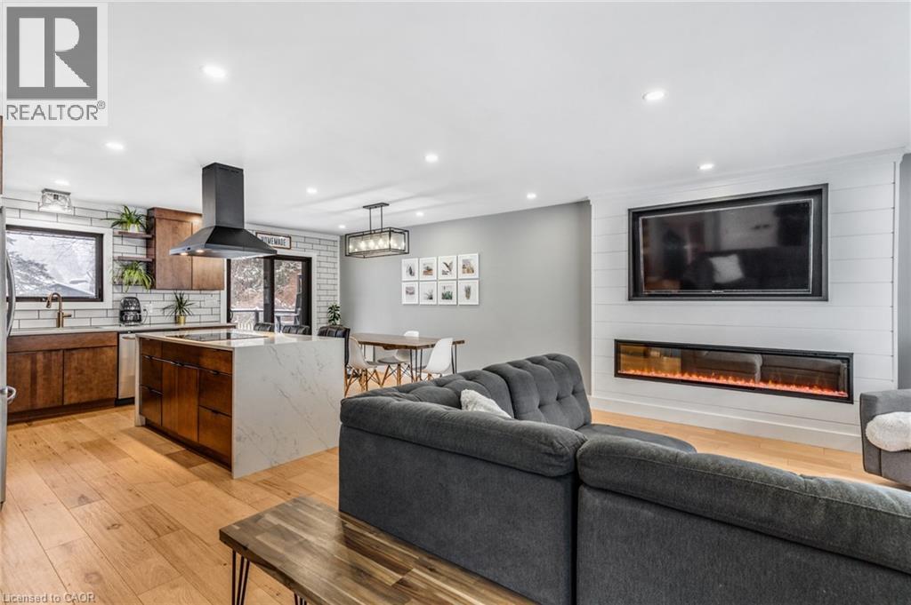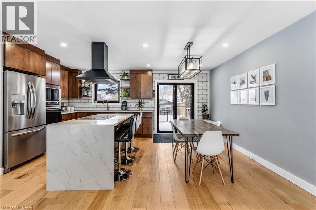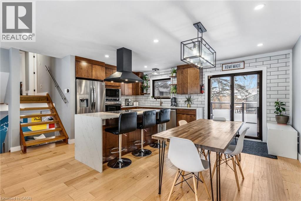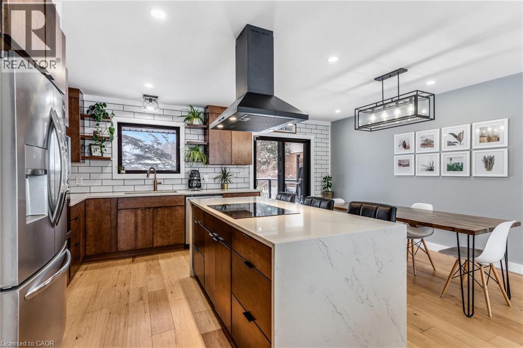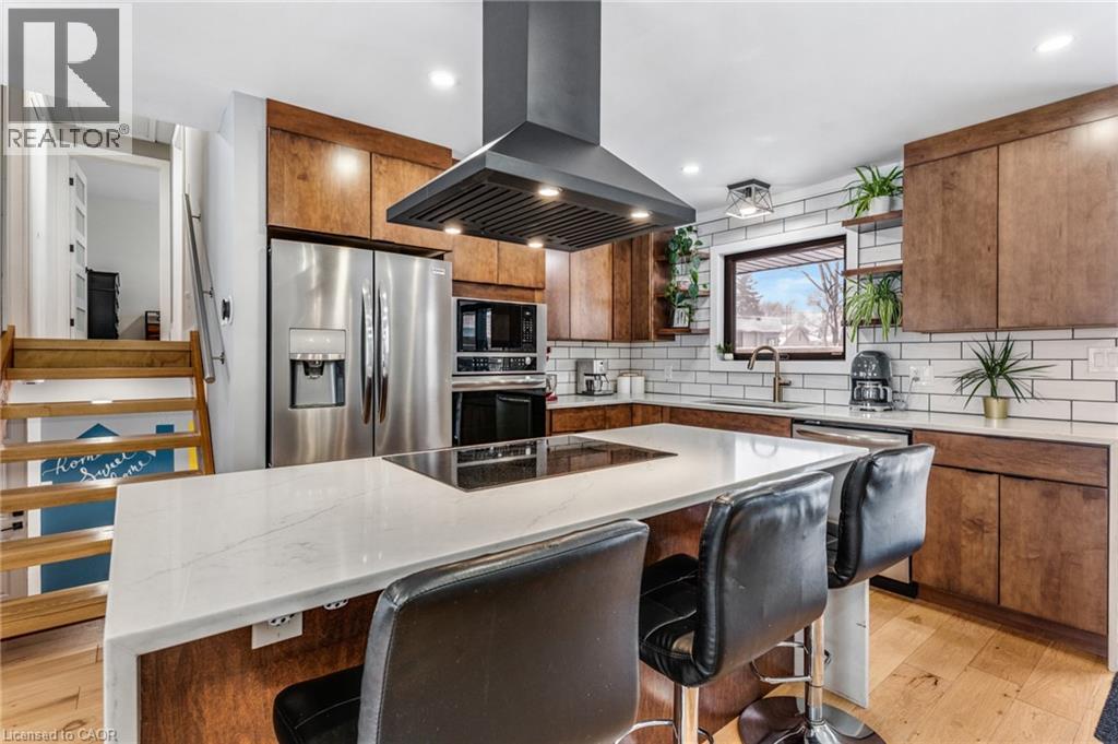 FULLY UPDATED PRESTON HOME STEPS FROM THE GRAND RIVER. 1735 Queenston Road, a beautifully reimagined detached side split in the heart of Preston, just steps from the scenic Grand River and nearby trails. Thoughtfully renovated from top to bottom, this home blends modern design with warmth, function, and an inviting sense of space, perfect for families, entertainers, and those who appreciate quality finishes throughout. The main level features a bright, open-concept layout anchored by a stunning chef-inspired kitchen. With stainless steel appliances, a striking oversized island with cooktop, sleek cabinetry, and a stylish tile backsplash, this space is as practical as it is beautiful. Flowing seamlessly into the dining and living areas, it’s ideal for everyday living and hosting alike. A walkout from the kitchen leads to the backyard deck—perfect for morning coffee, summer BBQs, or quiet evenings outdoors. Upstairs, you’ll find 3 comfortable bedrooms and a beautifully finished 5-pc family bathroom with dual sinks. The lower level adds exceptional versatility with a cozy family room featuring a walkout to the yard, a modern 3-pc bathroom, and flexible space ideal for movie nights, a home office, or play area. The basement level continues to impress with a spacious rec room, generous laundry and mudroom area, and a charming wine cellar—an unexpected and thoughtful touch. Outside, the property truly shines. The large, private yard offers endless potential for outdoor enjoyment, complete with a patio for dining, a deck for relaxing, and a handy garden shed for storage. Nature lovers will appreciate being just a short walk to Grand River trails, while commuters will love the quick access to Highway 401 and nearby amenities.(roof 2020, furnace & AC 2016). (70085076)