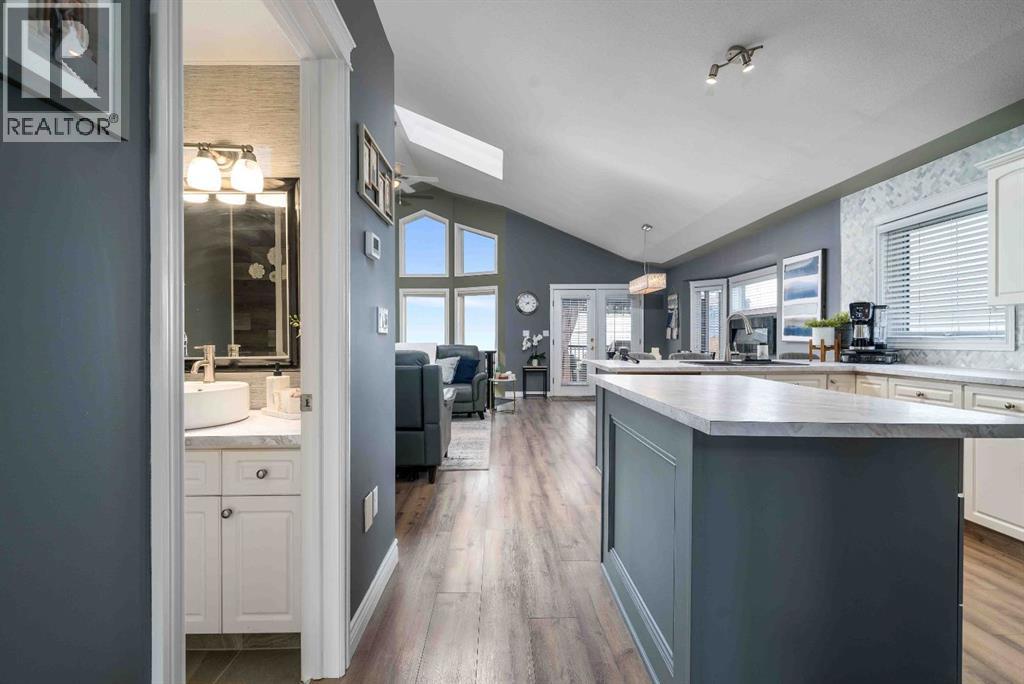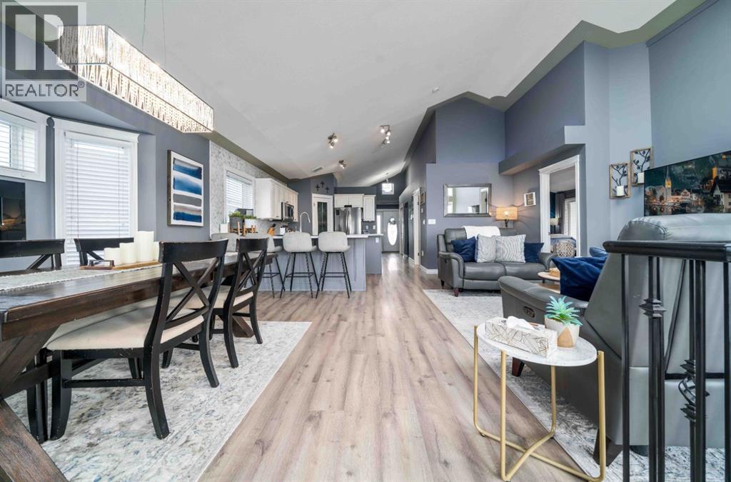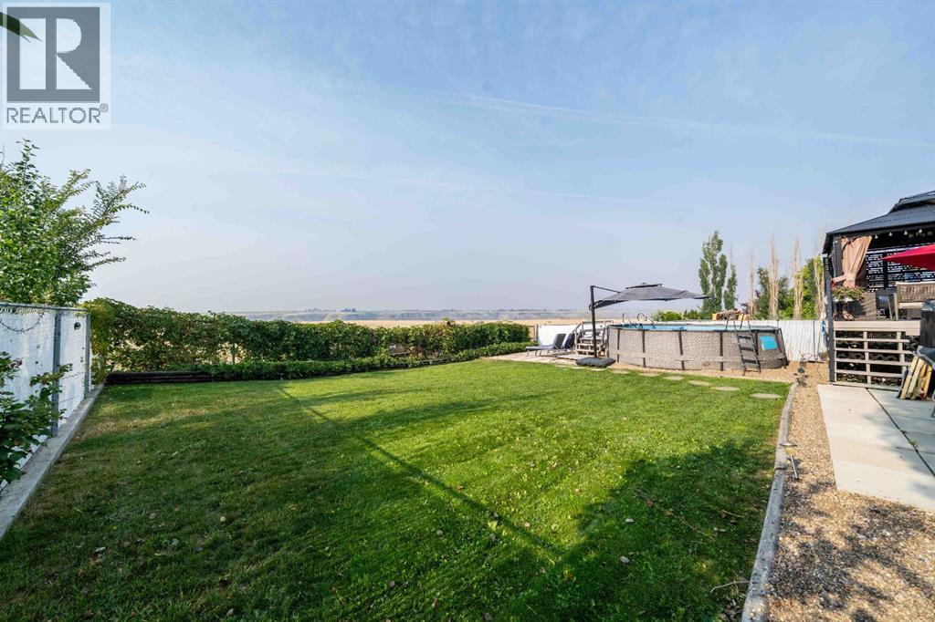 Welcome to 110 Redcliff Way SW, a bright and inviting walkout bungalow just six houses from the edge of the Redcliff Golf & Country Club, and only a one-minute drive to the clubhouse. With vaulted ceilings, skylights, and large windows framing stunning panoramic views of the coulees, this home blends peaceful living with thoughtful functionality. At the front of the home, a flexible room currently used as a butler’s pantry offers extra prep space, cabinets, and a second fridge — but could also serve as a home office, sitting area, or den. Just off the heated and insulated double garage, you'll find a boot room with closet for storing all your outdoor gear. The main living area opens into a bright, open-concept kitchen/dining/living space. Enjoy crisp white cabinetry, newer laminate countertops, stainless steel appliances, a corner pantry, breakfast bar, and island — perfect for family meals and entertaining. A 2pc guest bathroom is conveniently located just off the kitchen. From the spacious dining area, step out onto your deck with a built-in gazebo, ideal for soaking in the expansive prairie skies and coulee views. Watch summer storms roll in or unwind in the hot tub after a long day. The large backyard includes a sprawling grassed area, paved patio, above ground pool and underground sprinklers for easy lawn maintenance. The primary bedroom retreat features a vaulted ceiling, walk-in closet, plus a 4pc ensuite with a jetted tub, shower, oversized vanity, and large mirror. Downstairs, the fully finished basement boasts 9-foot ceilings, a cozy living area with fireplace, double-door bedroom (currently a music room), two additional large bedrooms, a 4-piece bathroom, and a fifth bedroom currently used as a home gym. A separate laundry room and utility/storage space add even more function. This home checks all the boxes for relaxed living just steps from the golf course, with room for guests, hobbies, and hosting — both indoors and out. 110 Redcliff Way SW — Lifestyle , space, and scenery, all in one. (31565796)