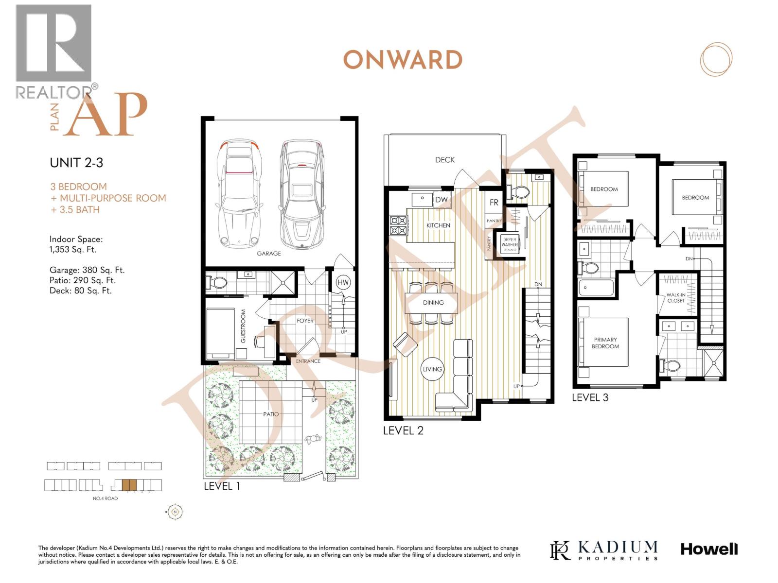 Onward by Kadium Properties, located in the serene area of South Richmond, offers 19 townhomes, featuring 13 three-story townhomes, 4 two-story duplexes, and 2 two-story single detached homes-all showcasing the sought-after West Coast contemporary style popular in Richmond. Each unit includes a side-by-side two-car garage. The homes feature a European-style kitchen equipped with Italian appliances and German-brand cabinetry. Ceiling heights reach 10 ft in the living area and 11 ft in the primary bedroom. Plan AI, one of the final and most popular options, includes three bedrooms, a multipurpose room with an ensuite, and extra-high ceilings, along with a double side-by-side garage with an EV charging option. (32368157)
