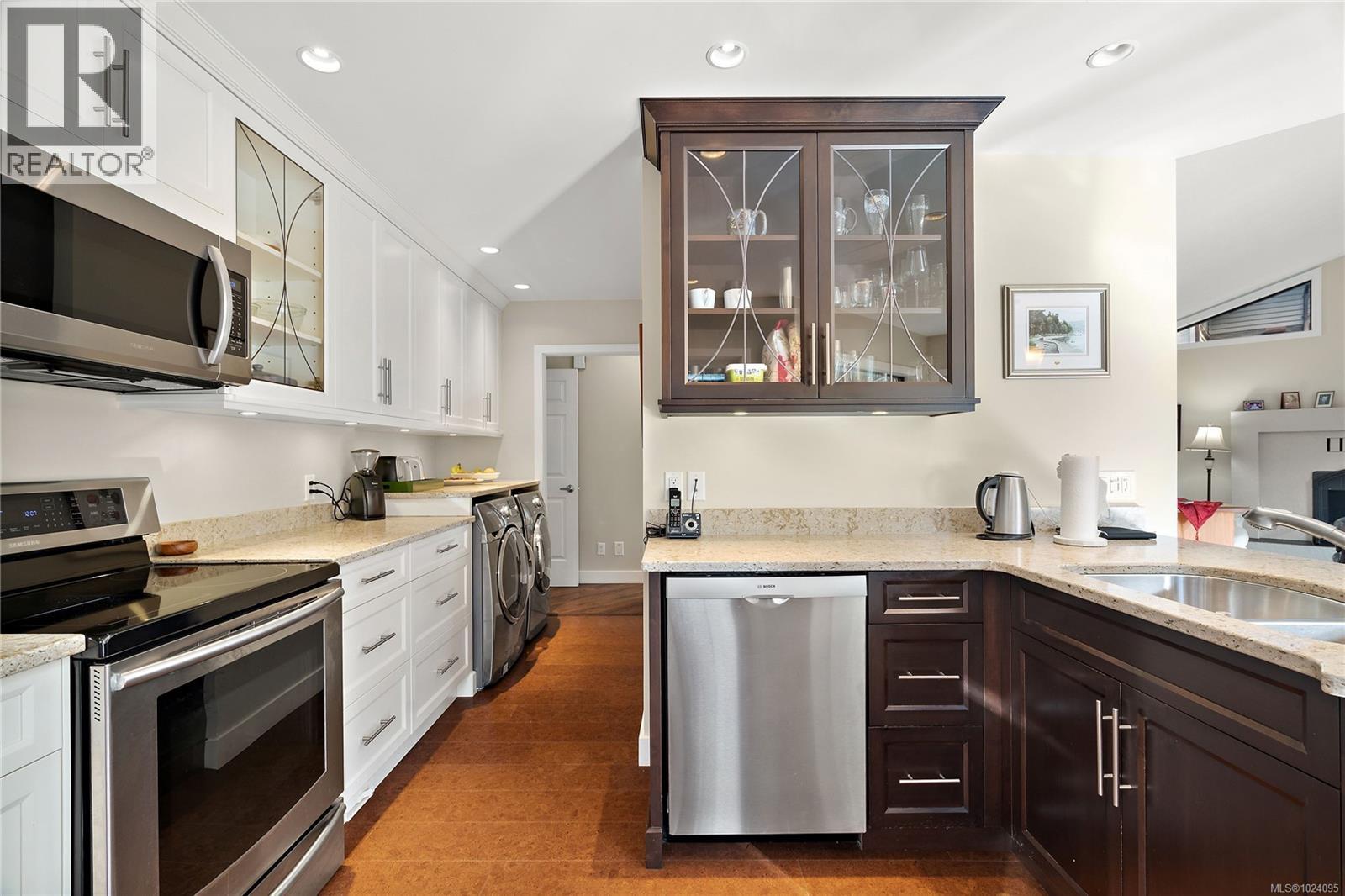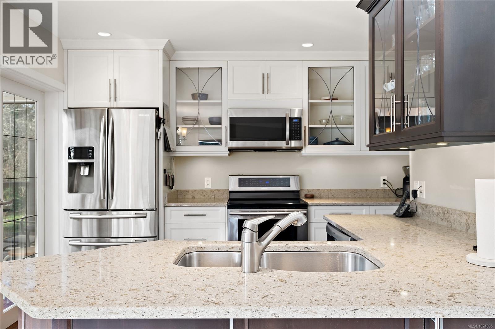 Welcome to Eagle Ridge Estates. Discover tranquil living in this beautifully updated 1,934 sq ft townhome nestled within 75 peaceful parkland acres in Eagle Ridge Estates in North Saanich. This exceptional 2-bedroom, 3-bathroom residence offers the perfect blend of comfort, style, and natural beauty. The main level captivates with wood floors and vaulted ceilings in the living and dining areas, complemented by a cozy wood-burning fireplace. Step out onto your expansive south-facing wrap-around deck and soak in serene park-like views. The updated open kitchen features solid surface countertops, cork flooring, and stainless steel appliances, flowing seamlessly into a bright sunroom that frames the stunning natural surroundings. Retreat to the updated primary suite on the main floor, boasting vaulted ceilings, a generous walk-in closet, and a luxurious 4-piece ensuite with a deep soaker tub and separate shower. Upstairs, you'll find a versatile family room, a spacious guest bedroom with sitting area, and another 4-piece bathroom—ideal for guests or family. Additional features include a double garage and the convenience of RV and boat parking available in this well-managed strata which includes kilometers of walking paths and a duck pond. Located minutes from BC Ferries, Airport, charming Sidney, local marinas, and Deep Cove, this home offers the ultimate Island lifestyle. Your peaceful sanctuary awaits! (30309625)