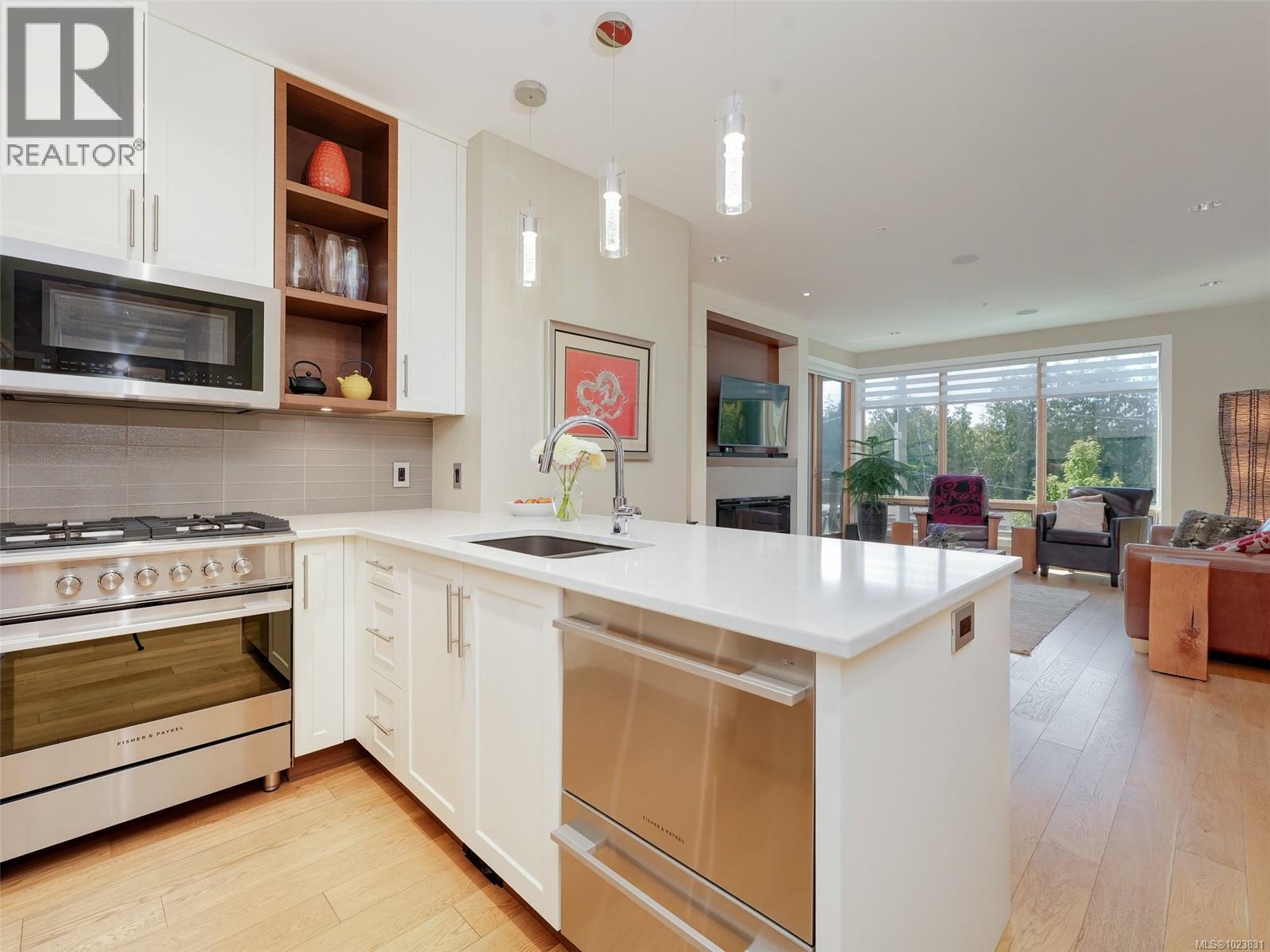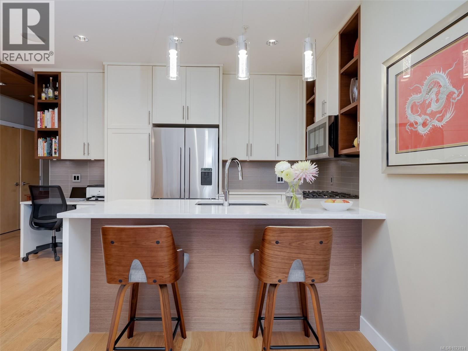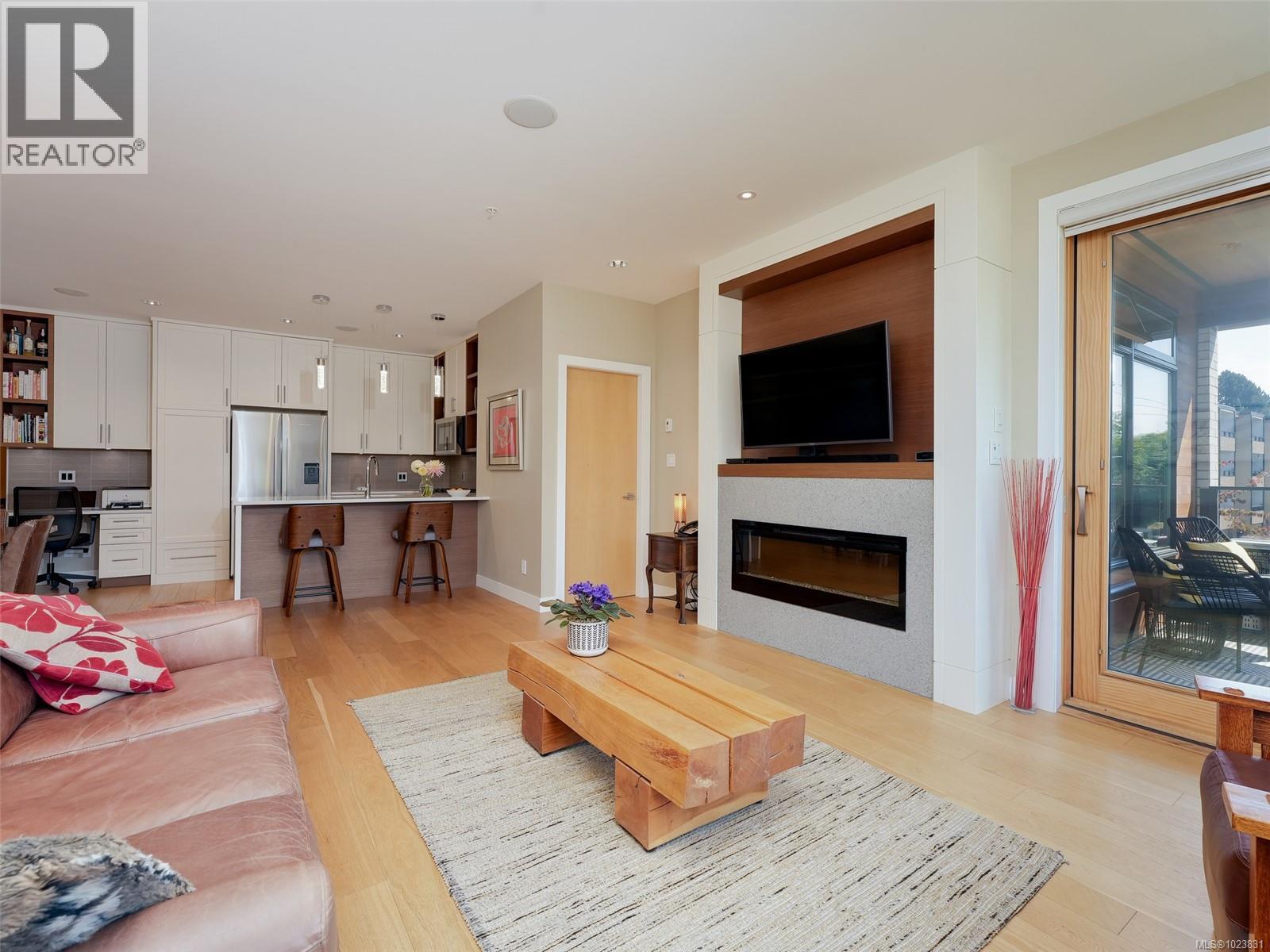 OPEN HOUSE SUNDAY FEB 1st 1-3 pm This lovely west-facing 2-bedroom, 2-bath condo is located on the Oak Bay border in Abstract’s “Village Walk” complex, renowned for its unmatched quality and design. The open-concept layout showcases a chef-inspired kitchen with tasteful updates & abundant natural light, complemented by textured feature walls, a built-in desk, in-floor heating, and triple-glazed Pella windows. The primary bedroom offers his-and-hers sinks, a spa-like ensuite & a dedicated heat pump for summer comfort. The second bedroom is ideal for guests, a home office, or hobby space. Since 2022, this home has received significant updates, including refurbished kitchen cabinets, new countertops, lighting, appliances, a hot water heater, fresh paint, and more. A private covered balcony offers year-round enjoyment, while a secure parking stall and generously sized storage locker add convenience. Enjoy the easy access to restaurants, shops, entertainment & banks. Stroll along the Beach Drive waterfront or take advantage of the nearby Oak Bay Recreation Centre. Immaculately maintained and truly move-in ready! Assessment has gone up by ~ $100K! (30309777)