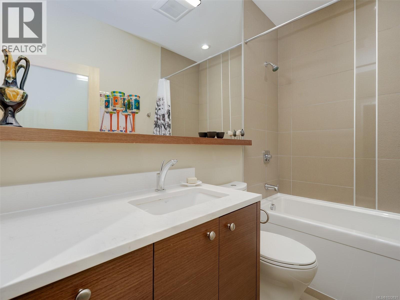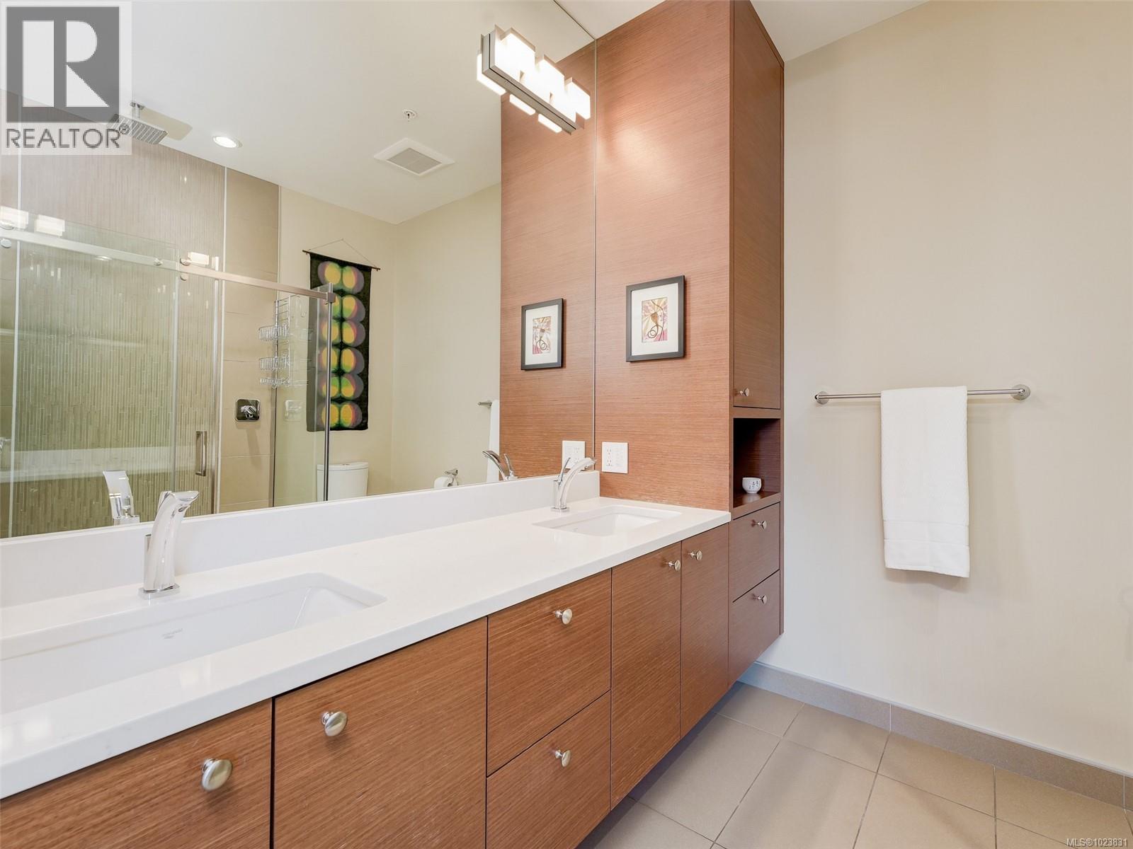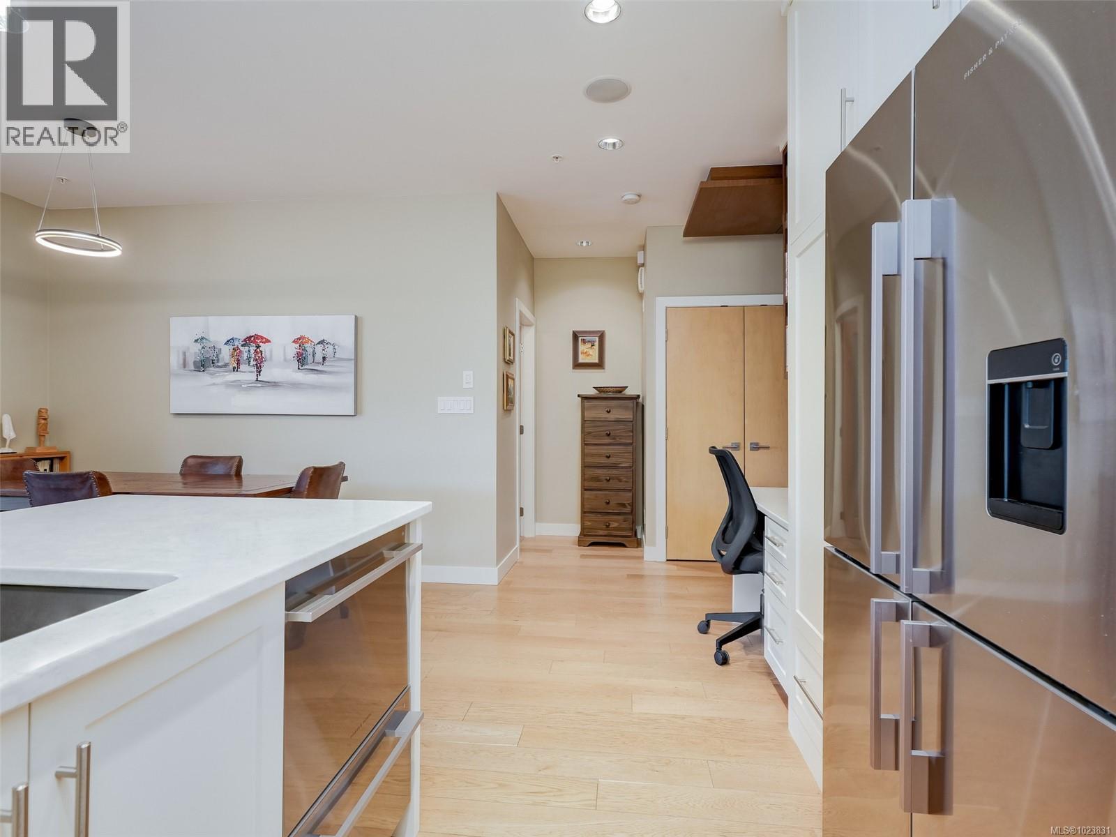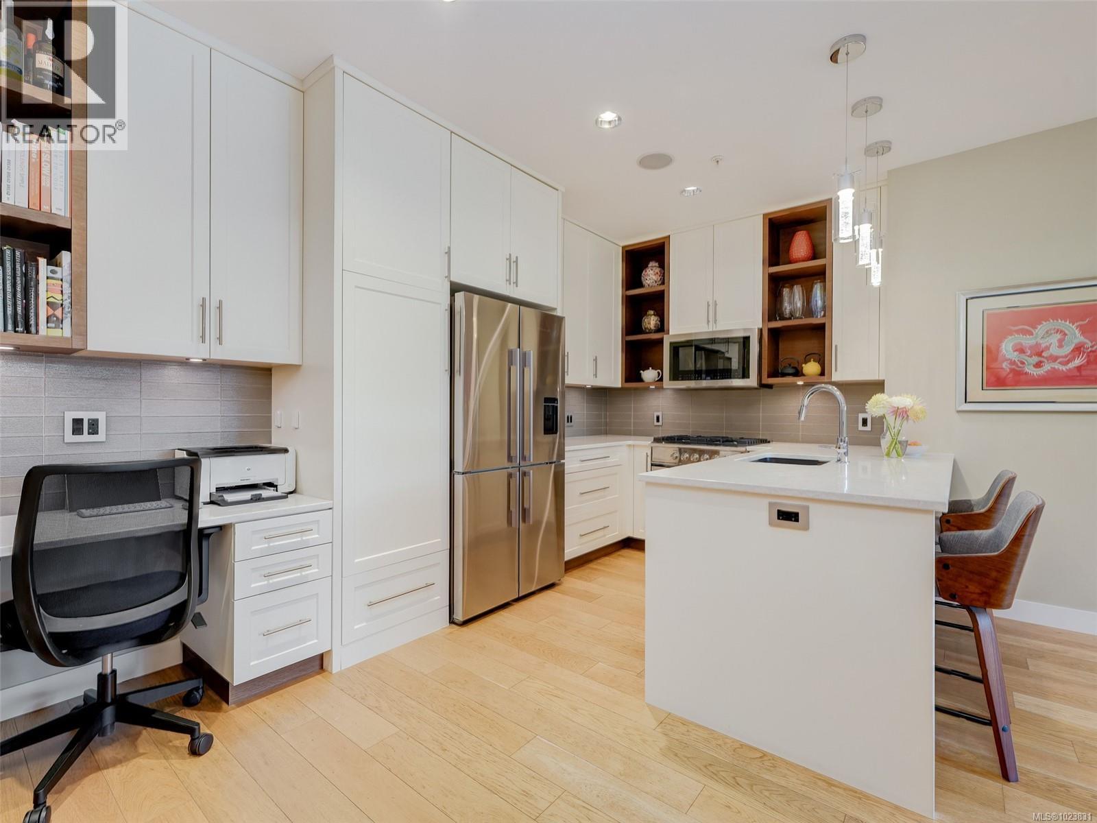 OPEN HOUSE SUNDAY FEB 1st 1-3 pm This lovely west-facing 2-bedroom, 2-bath condo is located on the Oak Bay border in Abstract’s “Village Walk” complex, renowned for its unmatched quality and design. The open-concept layout showcases a chef-inspired kitchen with tasteful updates & abundant natural light, complemented by textured feature walls, a built-in desk, in-floor heating, and triple-glazed Pella windows. The primary bedroom offers his-and-hers sinks, a spa-like ensuite & a dedicated heat pump for summer comfort. The second bedroom is ideal for guests, a home office, or hobby space. Since 2022, this home has received significant updates, including refurbished kitchen cabinets, new countertops, lighting, appliances, a hot water heater, fresh paint, and more. A private covered balcony offers year-round enjoyment, while a secure parking stall and generously sized storage locker add convenience. Enjoy the easy access to restaurants, shops, entertainment & banks. Stroll along the Beach Drive waterfront or take advantage of the nearby Oak Bay Recreation Centre. Immaculately maintained and truly move-in ready! Assessment has gone up by ~ $100K! (30309777)