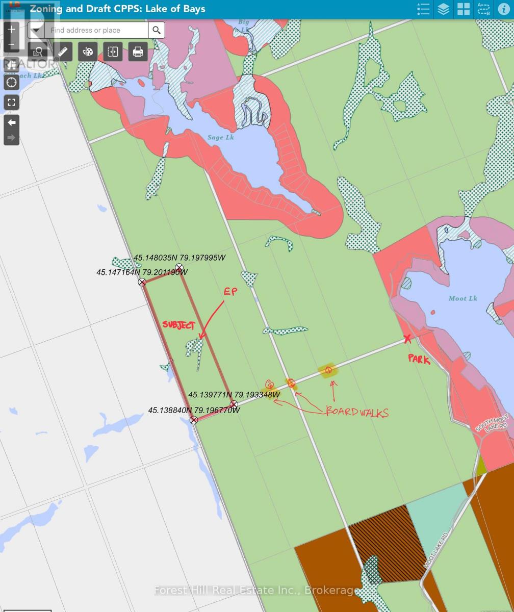 Wilderness & Wildlife Enthusiasts take note of this unique and special parcel of land in Muskoka, if you seek absolute tranquility and oneness with nature away from it all! This maturely forested 68-acre area of land is an off-grid sanctuary of serenity, located approximately .8 mile from Moot Lake Road, where access is by way of foot, ATV and/or snowmobile/snowshoe ...that results in a heavily discounted price. The trek over a man-made nature trail is quite scenic and adventuresome with short sections that cross marshy wetlands that use an ingenious log corduroy pathway. Evidence of wildlife abounds in all directions, including a vast variety of birds, white-tailed deer, beaver, pine martin moose and much more! The subject land's interior boasts a captivating water system that includes a large pond, enormous beaver dam, meandering stream (i.e. Sage Creek) and granite rock bluffs and outcrops of every imaginable kind, many sections of which are covered in smooth, vibrant green moss. The forest floor is covered in patches of flowers, mushrooms and flora & fauna of so many descriptions! This sort of opportunity doesn't come along often! An oasis of intrigue awaits to enliven your senses! Drive north to Muskoka, only 2 hours from the GTA, to embrace this mecca of Muskoka's finest wood lands, located off Muskoka Road 117 between Bracebridge and Baysville. There is also a groomed network of trails for ATVing and snowmobiling in the not-too-distant vicinity that goes for miles and miles in all directions. Keep your boat at a nearby marina on Lake of Bays or trailer it to a varierty of other lakes in the immediate area! Visit nearby towns for great restaurants, shopping and other cool amenities. It's all here, at a fraction of the cost of similar acreage parcels with 4-season road access! Come see for yourself why the likes of Indiana Jones would be envious! (42014527)