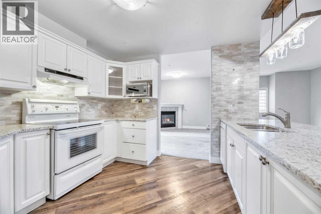 Welcome to this beautifully updated 2-bedroom plus den condo offering style, comfort, and convenience. The open floor plan is perfect for entertaining, featuring a bright living room with a cozy corner gas fireplace and access to the private balcony. The modern white kitchen boasts granite countertops and updated flooring, creating a fresh, contemporary feel throughout.The den with French doors provides the perfect space for a home office or reading nook. The spacious primary bedroom includes a walk-in closet and a 4-piece ensuite. A generous second bedroom, additional bathroom, and large laundry area add practicality and ease.This unit is immaculate and turn Key complete with A/C to add to comfort during the summer months!Enjoy the exceptional amenities this complex offers — including a library, recreation room, lounge, and gazebo — all designed to enhance your lifestyle. Large underground parking stall and a storage unit. Note-Building is 55+ a non smoking and no pet building-- (31568565)