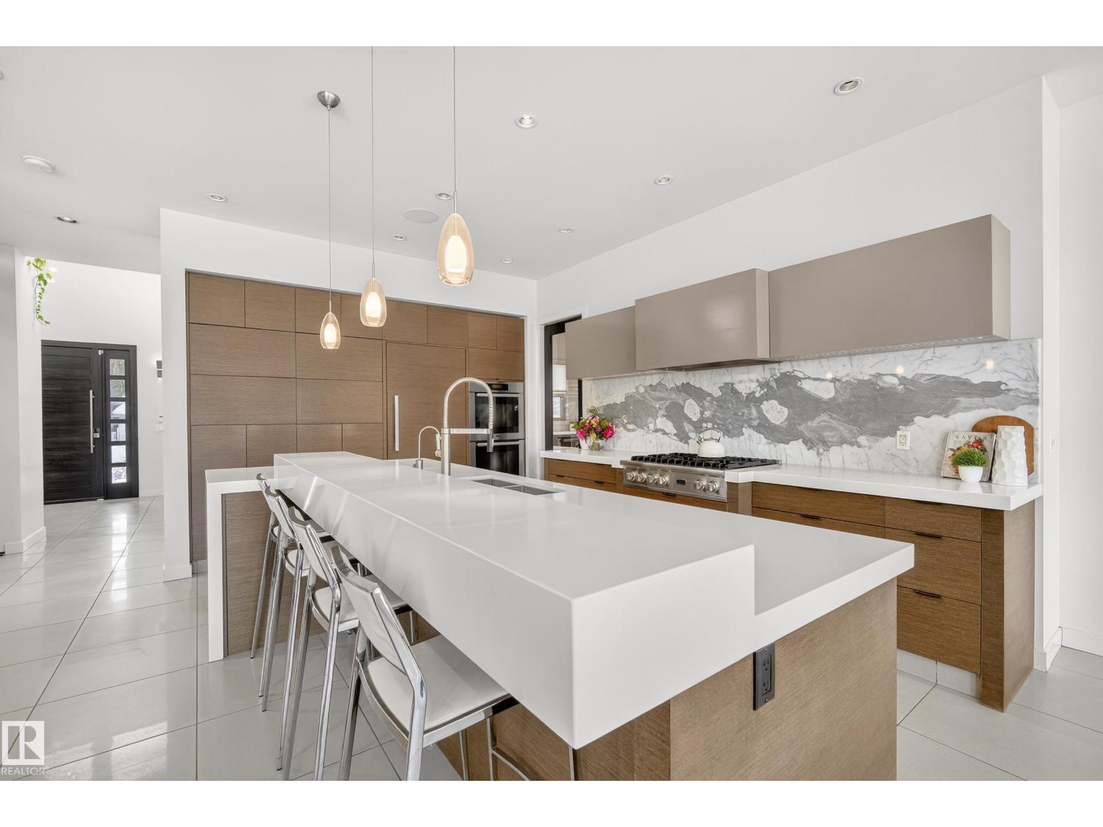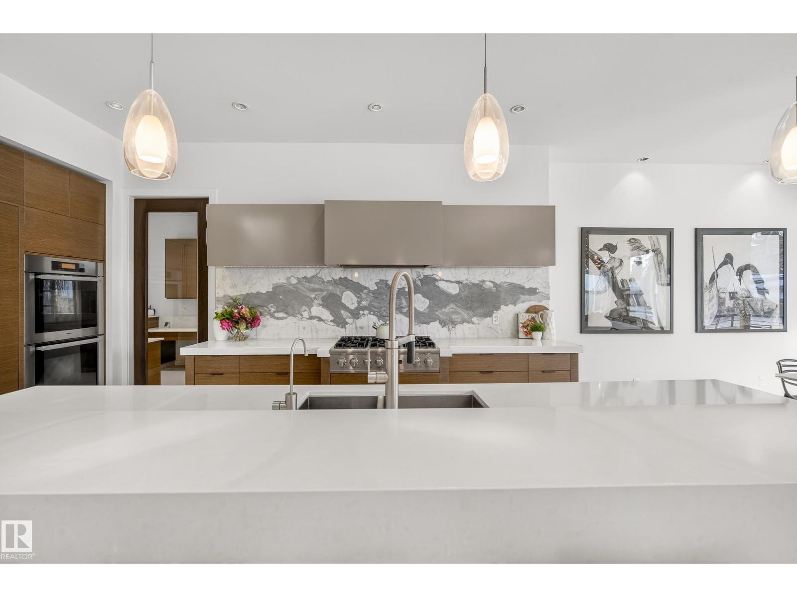 Ideally located in Crestwood near the Mackenzie Ravine, this stunning contemporary home delivers an exceptional layout for family & entertaining. The showpiece kitchen features a massive island, marble countertops & backsplash, sleek cabinetry, gas range, & double built-in ovens, flowing seamlessly into the dining nook and living room with 10-ft ceilings, & gas fireplace. The main floor offers an enclosed den, 2-piece bath, butler’s pantry, & a mudroom with abundant storage. Upstairs, the luxurious primary retreat includes a 5-piece ensuite with dual vanities, and walk-in closet, while two additional large bedrooms also each have their own ensuite & walk-in closets. The basement with in-floor heating & oversized windows includes a gym, rec room, wet bar, wine room, a guest bedroom, & full bath. Outside, enjoy a covered patio with heaters, plus a private sunken patio, and an oversized triple garage with 13-ft ceilings for travel van or a car lift. Close to schools, shopping, and amenities. (33759176)