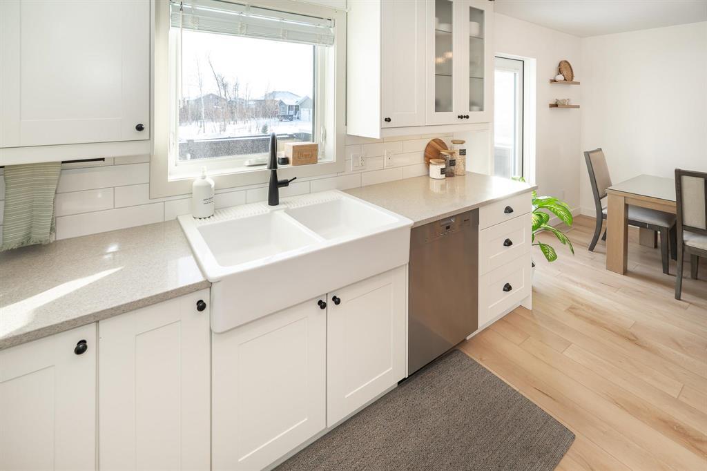 R16//Kleefeld/Open House Sat Feb 7, 1 to 3 PM Welcome to this beautiful 1175 sq ft, bi-level home in Kleefeld just steps from K-8 school, finished with Hardie board siding and stone veneer for great curb appeal. A paver-style walkway leads to the front, providing a polished welcoming approach. Inside, the foyer and stairs feature tile flooring, leading up to a bright main floor with vinyl plank flooring throughout. The living room offers tray ceilings and pot lights, while the kitchen features quartz countertops, white shaker-style cabinets with soft-close doors and drawers, farmhouse sink, stainless steel appliances and a corner pantry. The primary bedroom has direct access to a 4-piece Jack & Jill bathroom. With two additional main-floor rooms including Bedroom 2 and Bedroom 3. Bedroom 3 is currently used as a laundry room but easily converted back. Triple-pane windows and patio door lead to a large deck and fully fenced yard with an 8 x 12 shed. The partially finished basement offers a carpeted rec room, 4th bedroom, 4-piece bath, dual-pane windows, and potential for a 5th bedroom. (231890499)