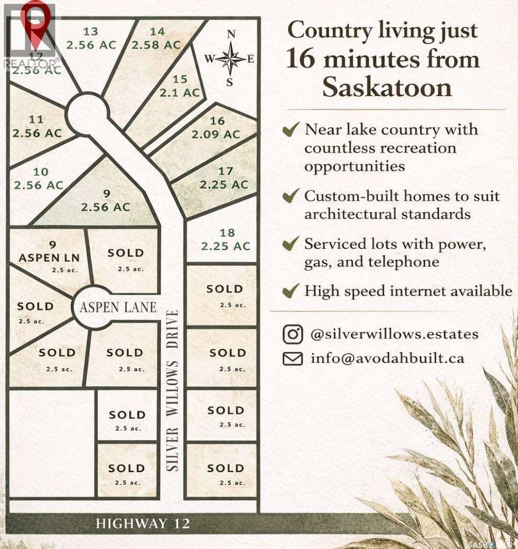 Looking for an acreage community with a close commute to the city? Welcome to Silver Willows Estates, a picturesque country living only 16 minutes from Saskatoon with architectural controls. Create your ideal lifestyle with plenty of space to build your dream home and have the acreage-style living room that you have always wanted. Imagine... Bonfires, open skies, and all things country life for you and your family to enjoy. Lake country is north on pavement, or city life is just a short drive away. K-12 schools are close by with small classroom sizes. This community-style development features 7 lots all 2.5 acres each. Silver Willows offers the lots fully serviced with power, gas, and phone to the property. Highspeed internet is available and many home owners have dug wells. The sky is the limit! Homes built to suit or build your own to our architectural standards. Create a space unique to you, that promotes individuality for a beautiful community. You can be living in the country, next to a paved road and just minutes from Saskatoon’s downtown and its northern work hub. Fall in love with a community-style development, neighbors that gather, all while still having your own unique space. Contact me today to find out more about this great development or hear about build options available. Builder willing to build to suit as an option. Acreage living can be yours for less than you pay for a new lot in the city. (29316493)
