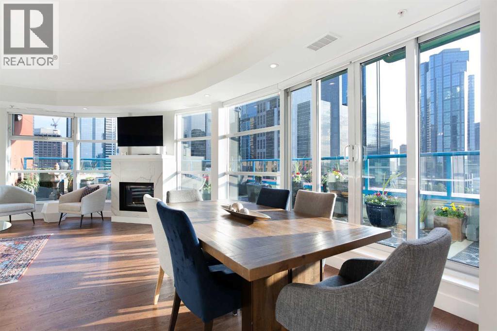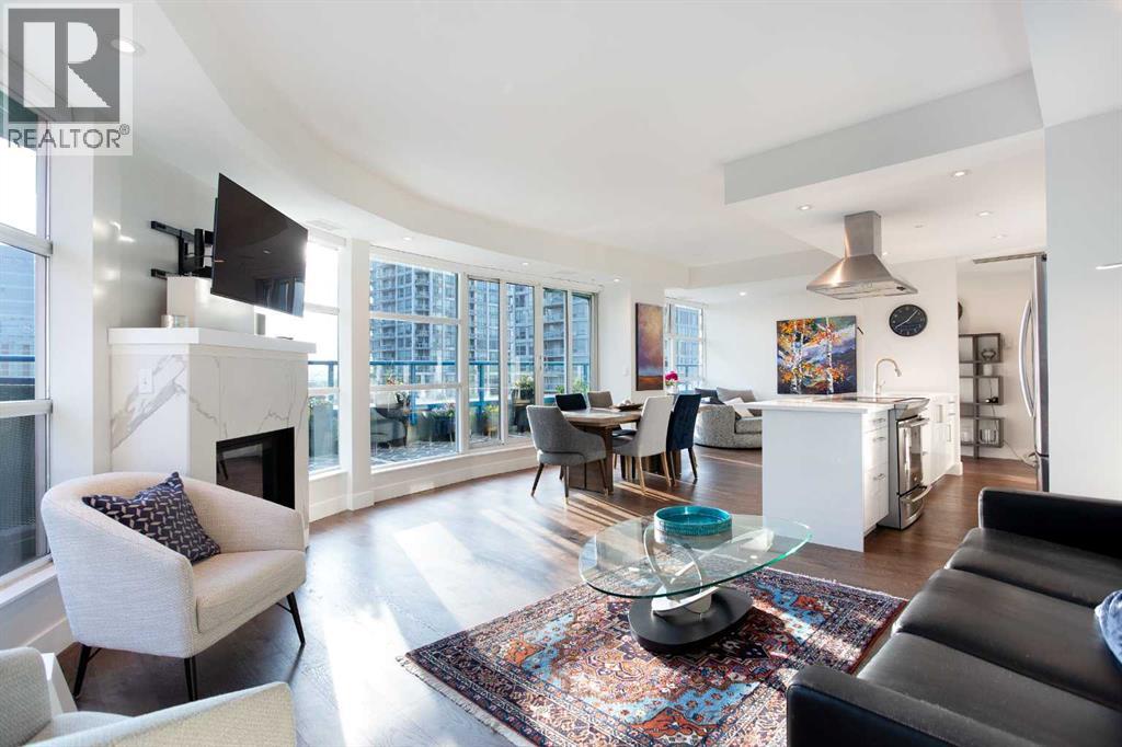 Welcome to your dream downtown retreat, just steps from the Bow River. This fully renovated sub-penthouse offers near 1,400 square feet of beautifully designed living space, featuring 2 bedrooms and 2 bathrooms, all tucked into one of Calgary’s most vibrant and walkable communities.As you enter, you're welcomed by luxury hardwood flooring that flows throughout the home, creating a seamless and contemporary feel. The open concept layout is bright, thanks to the floor-to-ceiling windows that flood the space with south facing light and offer stunning panoramic city views.The chef-inspired kitchen has been completely reimagined with sleek cabinetry, quartz countertops, an induction cooktop, and a modern hood fan. It’s perfect for everything from quick breakfasts to full dinner parties. The adjoining dining and living area is anchored by a beautiful fireplace, making it a cozy yet sophisticated space to entertain or relax.The first bedroom features floor-to-ceiling windows, a large walk-in closet, and a luxuriously renovated ensuite with dual vanities and a walk-in shower. A custom wall-mounted bed adds versatility, allowing the room to transform quickly. The second bedroom is equally flexible, offering floor-to-ceiling windows, a spacious walk-in closet, and easy access to the second fully renovated luxury bathroom, complete with high-end finishes and a stunning bathtub. You will also find a spacious laundry room with built-in, high-end cabinetry that provides extra storage and space.Step outside onto your expansive 300 square foot private terrace—whether you're sipping your morning coffee, hosting friends, this outdoor space is a true extension of your living area that comes with stunning downtown views.Additional features include in-suite laundry, central A/C, secure underground parking, remote controlled blinds, and a full-time concierge for added peace of mind.Situated just steps from the Bow River pathways, and some of Calgary’s top restaurants, cafés, this location offers the perfect blend of nature, and convenience. Whether you're walking your dog along the river or grabbing a latte with friends, everything you need is just outside your door. (31572844)