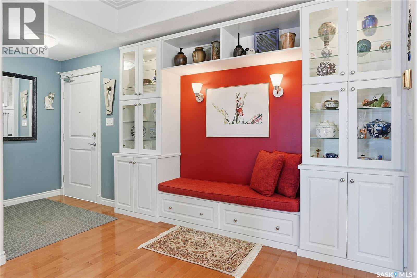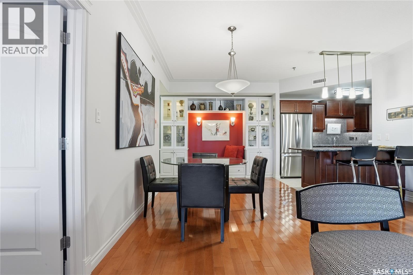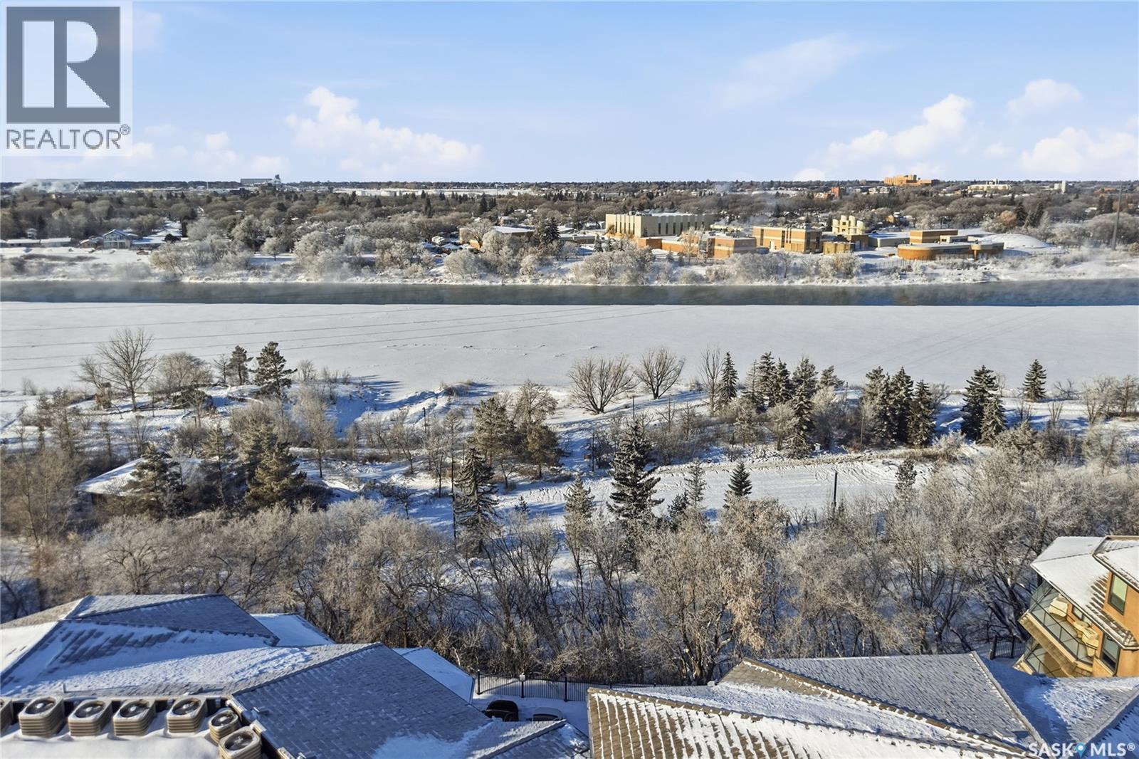 Perched along one of Saskatoon’s most prestigious riverfront addresses on Saskatchewan Crescent West, this 1,079 sq ft executive condo offers a refined blend of calm, privacy, and uninterrupted views across the Meewasin Valley and South Saskatchewan River. Lovingly maintained by the original owner and lightly lived in (approximately four months per year), this home presents in mint condition, with timeless finishes that feel both elevated and enduring. Hardwood flooring and cabinetry, classic tile and grout, and custom built-in seating create a living space designed to be enjoyed fully and relaxed. The kitchen features stainless steel appliances and a thoughtful, functional layout with a large eat-up island that blends seamlessly into the open living and dining areas, ideal for quiet mornings or relaxed evenings at home. Two bedrooms and two bathrooms offer flexibility and comfort, including a river-facing primary suite with a walk-in closet and glass-enclosed walk-in shower. The second bedroom includes a beautiful custom Majestic-built Murphy bed and sits adjacent to a full 4-piece bathroom, making it equally suited to hosting guests or working from home. Central air conditioning, central vacuum, a retractable porch screen door, and underground parking add everyday ease, while the quiet, well-managed building offers premium amenities including a guest suite, amenities room, and exercise room. A refined riverfront lifestyle on where walkability, views, and understated luxury come together, this unit is sure to leave you feeling impressed. Located near nature, bus routes, downtown amenities, and the services on 8th St, you will love the accessibility and flexibility this home offers. Call your Realtor for your own exclusive tour now! (29320179)