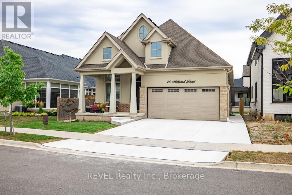 Set on a quiet, refined streetscape in the heart of St. Davids, 75 Millpond Road is a custom-built bungalow by DRT Homes offering over 2,700 sq. ft. of finished living space. The grand foyer with wainscoting opens to a soaring great room with 20-ft ceilings and a dramatic tiled fireplace. The main floor features a spacious primary suite with a walk-in closet and an ensuite, a second bedroom (currently styled as a home office) with its own 3-piece bath, and a bright, neutral kitchen with high-end finishes. Outdoors, a covered patio extends the living space into landscaped surroundings. The lower level is designed for gathering, with an expansive rec room, built-in bar/kitchenette with stone counters, an additional bedrooms and full bath and a spacious home gym. Millpond Road is known for its well-appointed high-end homes and peaceful setting - all within walking distance of Ravine Vineyard, local cafés, and dining in the village of St. Davids. Just minutes away are Old Town Niagara-on-the-Lake, Golf Courses, Shaw Festival Theatre, Queen Street shops and restaurants, The Outlet Collections of Niagara & White Oaks, and of course, the areas many renowned wineries. Particularly convenient about this location is the quick highway access for easy commutes, and close proximity to all that Niagara Falls and St. Catharines have to offer as well. An excellent opportunity to own a thoughtfully designed home in one of Niagara's most desirable communities! (42026421)