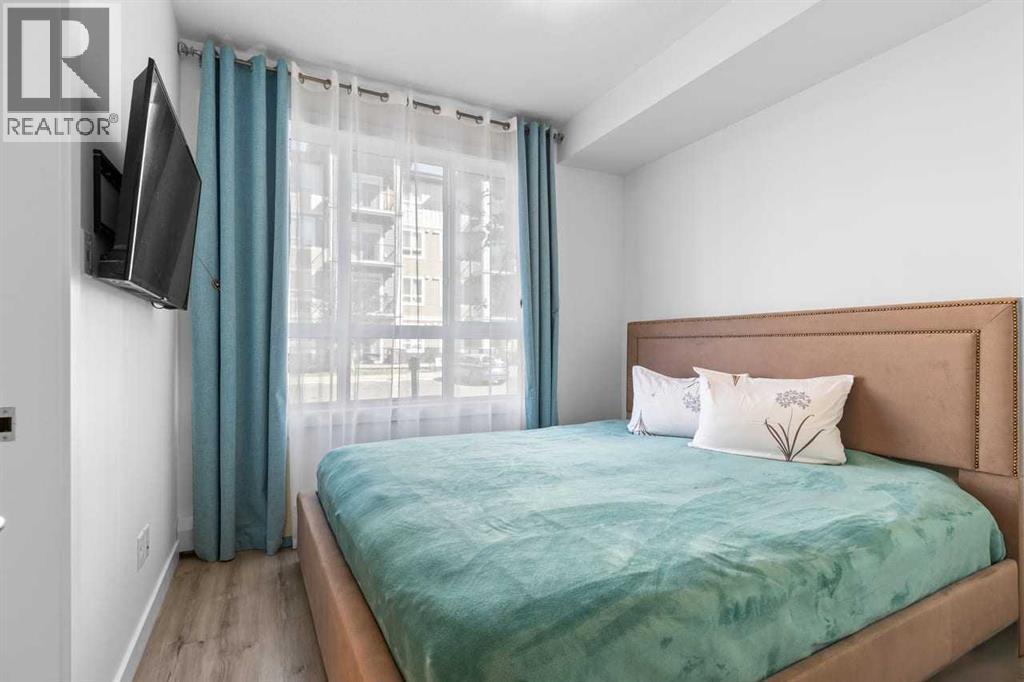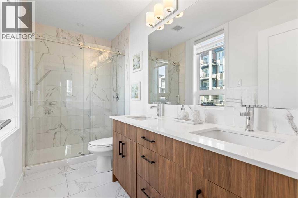 Looking for space + style? This 958 sq. ft. 2 bed/2 bath condo in Walden has tons of upgrades, 2 parking stalls, and a private deck with gate to green space. A true gem in the heart of the community! The unit can be accessed either through the main building entrance or via its own private ground-level entrance. The kitchen and bathrooms showcase custom tilework along with quartz island that comfortably seats four. A chimney-style range hood, counter-depth fridge, smooth cooktop, granite sink, pot lights, and under-cabinet lighting complete this stunning kitchen.The primary bedroom easily fits a king-sized bed and nightstands, and connects to a large walk-through closet leading to a beautiful ensuite with a frameless glass shower, quartz countertops, two sinks and built-in cabinetry. The second bedroom fits a kingsize bed too and offers direct access to the main 4-piece bath. The heated underground stall is conveniently located near the entrance and direct access to the assigned storage locker. With its rare floor plan, extensive upgrades, and unbeatable outdoor space, this condo is truly a gem in family friendly Walden. (31575777)