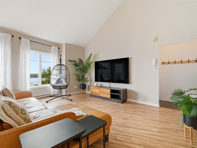Looking for your piece of paradise? This fully renovated condo offers an elegant mezzanine, impressive cathedral ceilings, and a modern kitchen with views of the Chambly Basin. Enjoy two terraces to admire one of the most beautiful views in the area. Located on the top floor, it includes two bedrooms, a separate laundry room, a garage with a installation charging station, and access to the dock directly across the street. Swimming pool in the complex. A unique lifestyle awaits you! (38855636)