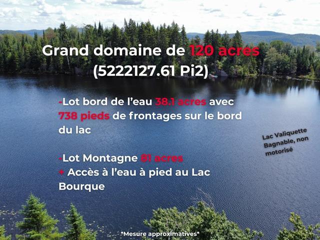 Exceptional ±120-acre estate (485,152 m²) with 738 ft of frontage on Lake Valiquette (swimming dock) and panoramic views in Saint-Adolphe-d'Howard. Rare opportunity for a large private retreat, a thoughtful development, or both, with maple syrup potential. Two separate accesses (municipal and private), partially developed forest roads, and valid permits for a residence and secondary building. Access to multiple lakes, including navigable Lake Saint-Joseph and Lake Bourque within walking distance. Direct access to four-season trail networks. 5 minutes from Hwy 15, between Saint-Sauveur and Tremblant, 1 hour from Montreal. GST/QST must be added to the asking price (39399772)