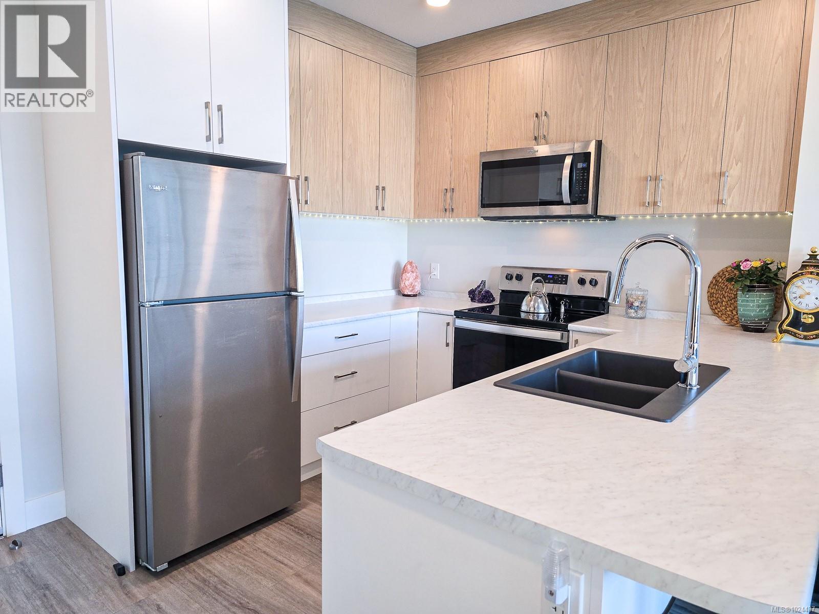 Welcome to The Met — North Nanaimo’s hub of style and convenience. This bright and modern 1-bed 1-bath condo offers contemporary design and unbeatable walkability to over 200 shops, cafés, and restaurants. The open-concept layout features 9-ft ceilings, large windows, and high-end stainless steel appliances, creating a space that feels both spacious and inviting. Enjoy a well-appointed kitchen with two-tone cabinetry and an eating peninsula, a comfortable living area that opens to your private balcony, and a cozy bedroom with ample closet space. A separate laundry room with stacking washer and dryer adds practicality. This unit includes one secure underground parking stall and a storage locker, with pet-friendly bylaws allowing two pets of any size. Whether you’re a first-time buyer, investor, or looking to downsize in style, The Met offers the perfect blendof urban convenience and West Coast comfort. Don’t miss your chance to live in one of North Nanaimo’s most desirable communities! (30320267)