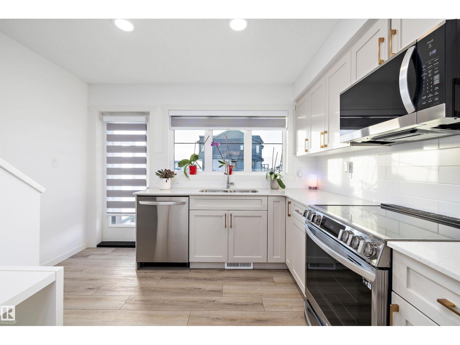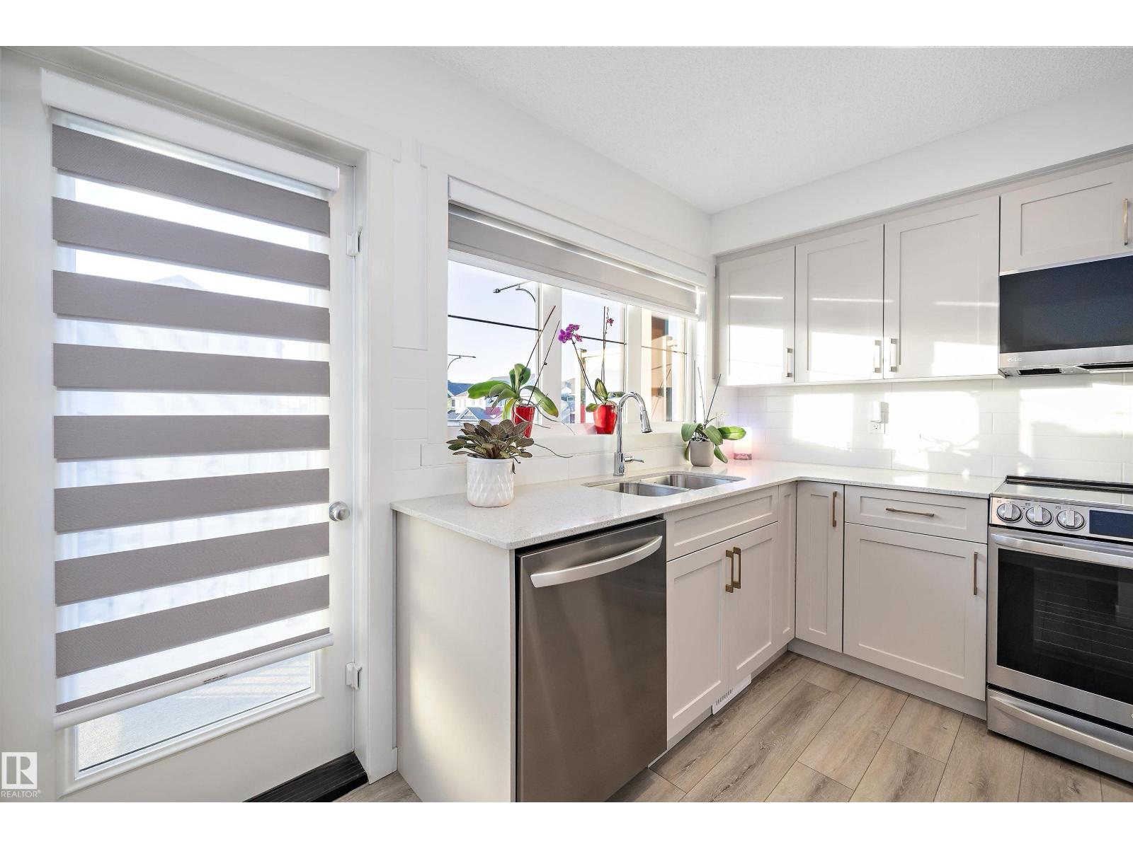 MOVE-IN-READY TOWNHOME IN KINGLET GARDENS WITH MODERN FINISHES & PRIVATE BALCONY. This well-designed 2-storey home delivers bright, functional living anchored by a stylish kitchen with quartz countertops, full-height cabinetry, stainless steel appliances, and excellent natural light. The open main living level is ideal for both daily living and entertaining, while the upper level features well-proportioned bedrooms and modern bathrooms designed for comfort and efficiency. Enjoy a private upper balcony with open sightlines—perfect for evening sunsets—plus the convenience of an attached garage and practical ground-level entry. Set in the Big Lake area, Kinglet Gardens offers a quieter residential setting surrounded by green space, while remaining minutes from West Edmonton, St. Albert, major routes, shopping, and services. An ideal option for buyers seeking newer construction, low maintenance, and long-term value without sacrificing location or livability. (33767340)