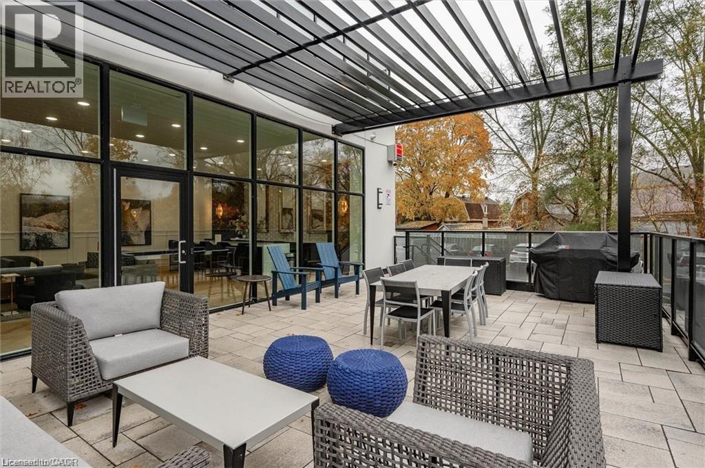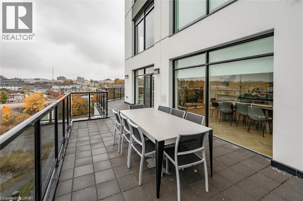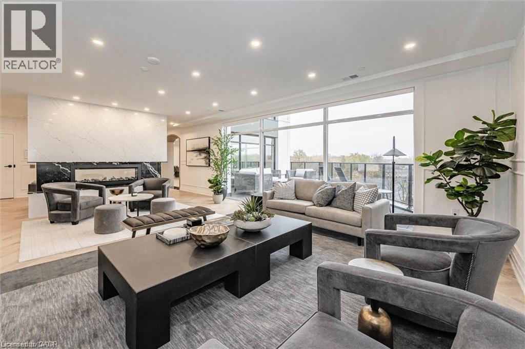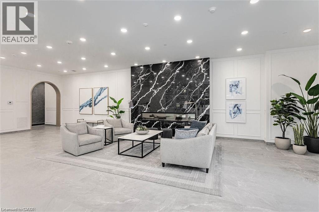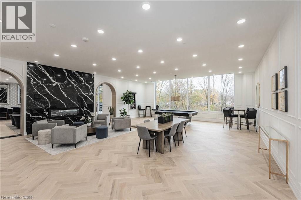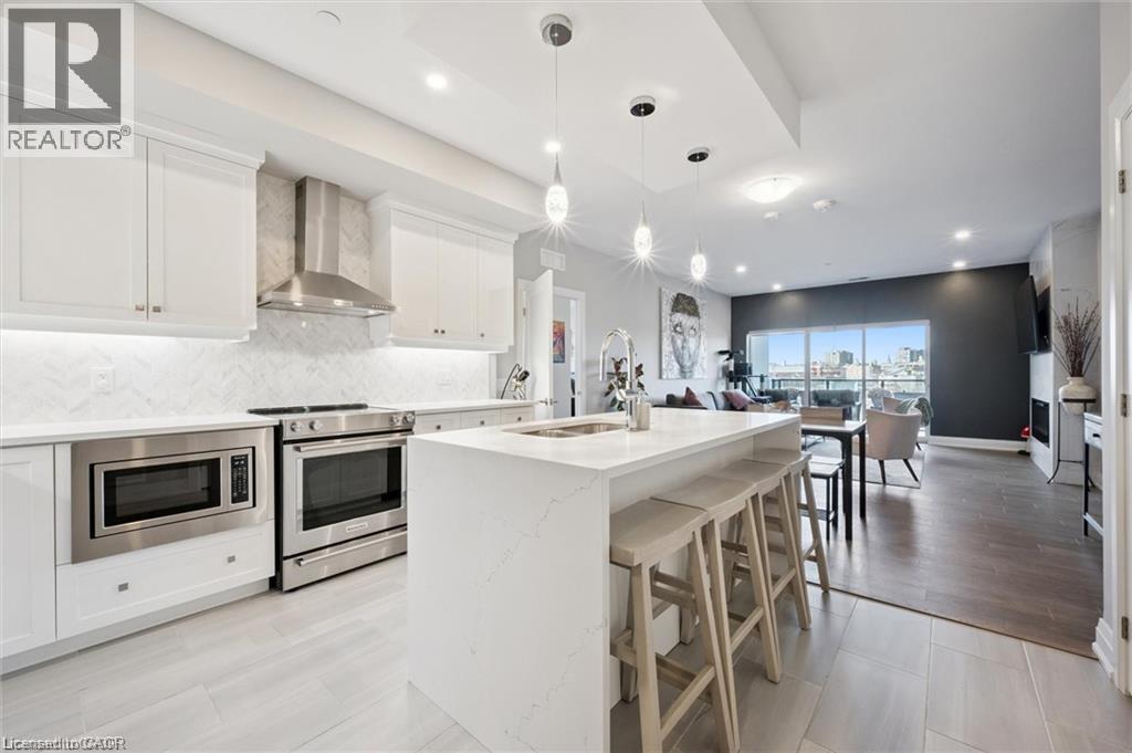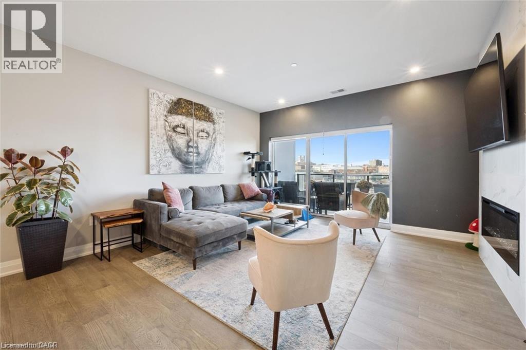 Experience refined condo living at Edgewater Condominium, ideally located along the Eramosa River in the heart of Downtown Guelph. Unit 608 is a well-appointed 2-bedroom, 2-bath suite offering two private balconies and a functional open-concept layout with approx. 1260 square feet of living space. Engineered hardwood flooring extends throughout the living areas and bedrooms. The kitchen features a waterfall island, stone countertops, modern backsplash, and premium appliances, opening to the living and dining areas highlighted by a floor-to-ceiling tiled fireplace and walk-out to a balcony with city views. The primary bedroom includes a walk-in closet, private balcony, and a 5-piece ensuite with freestanding tub, glass shower, and heated floors. A second bedroom, 3-piece bath, and in-suite laundry complete the suite. Large windows provide abundant natural light and neutral finishes throughout. Includes one underground parking space, one storage locker, and access to building amenities including a library, party and media rooms, fitness centre, and guest suites. Steps to downtown amenities, riverfront trails, and GO/VIA Rail access. (70102964)