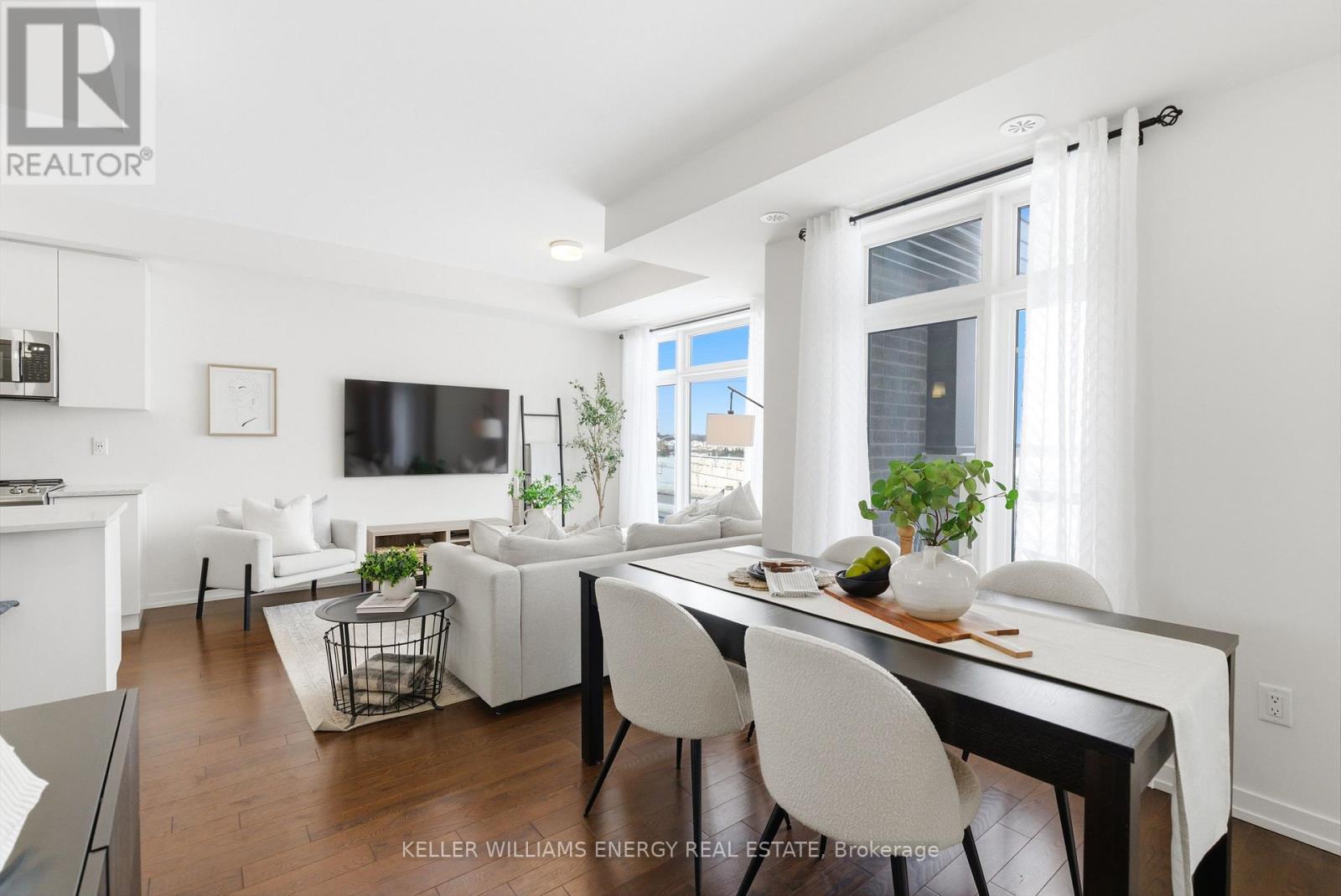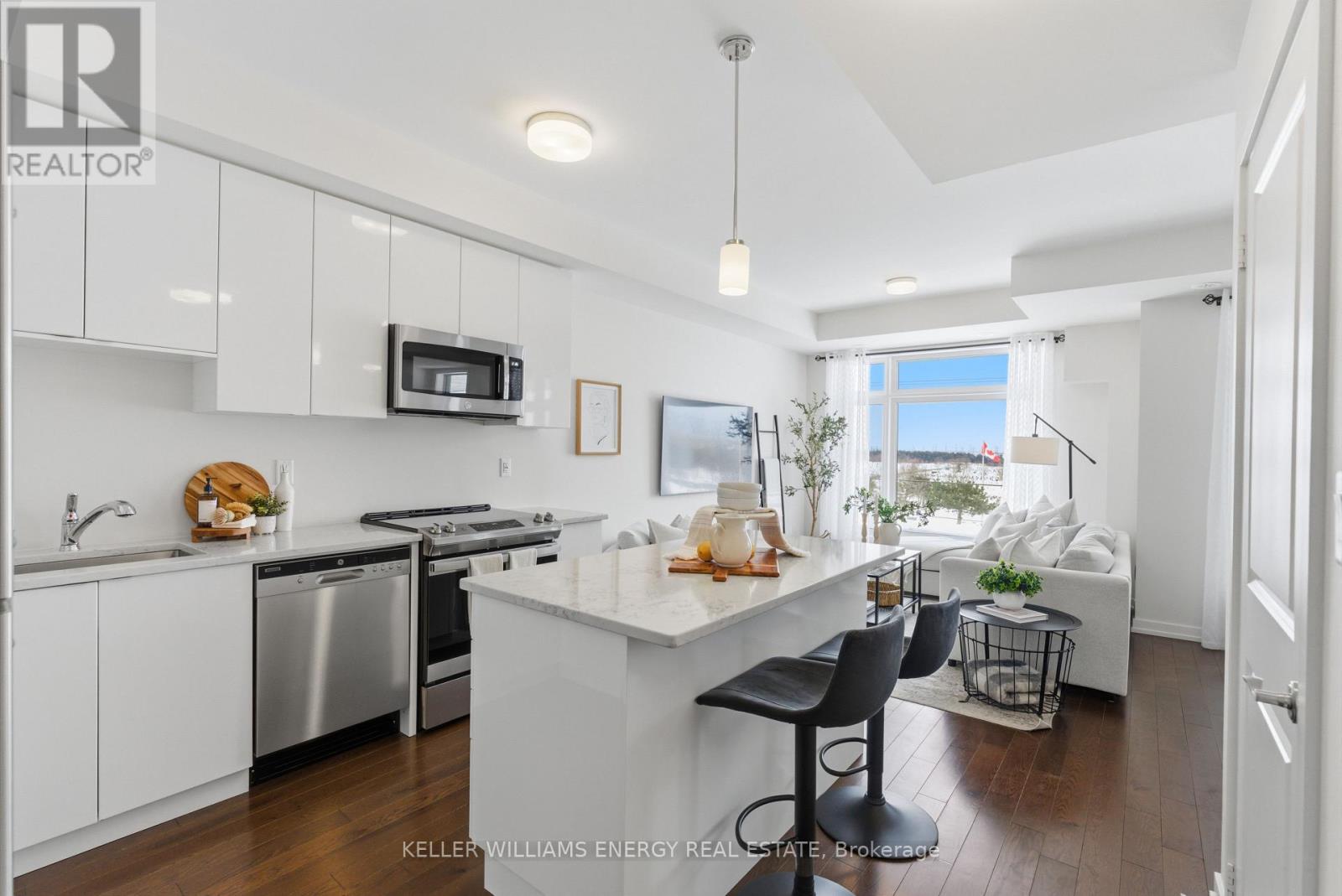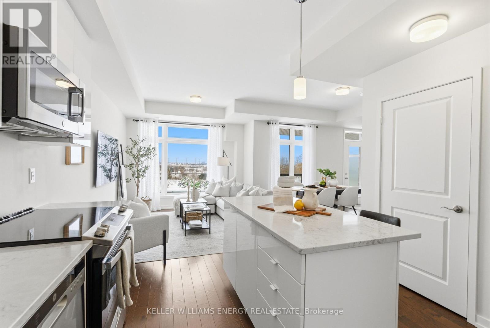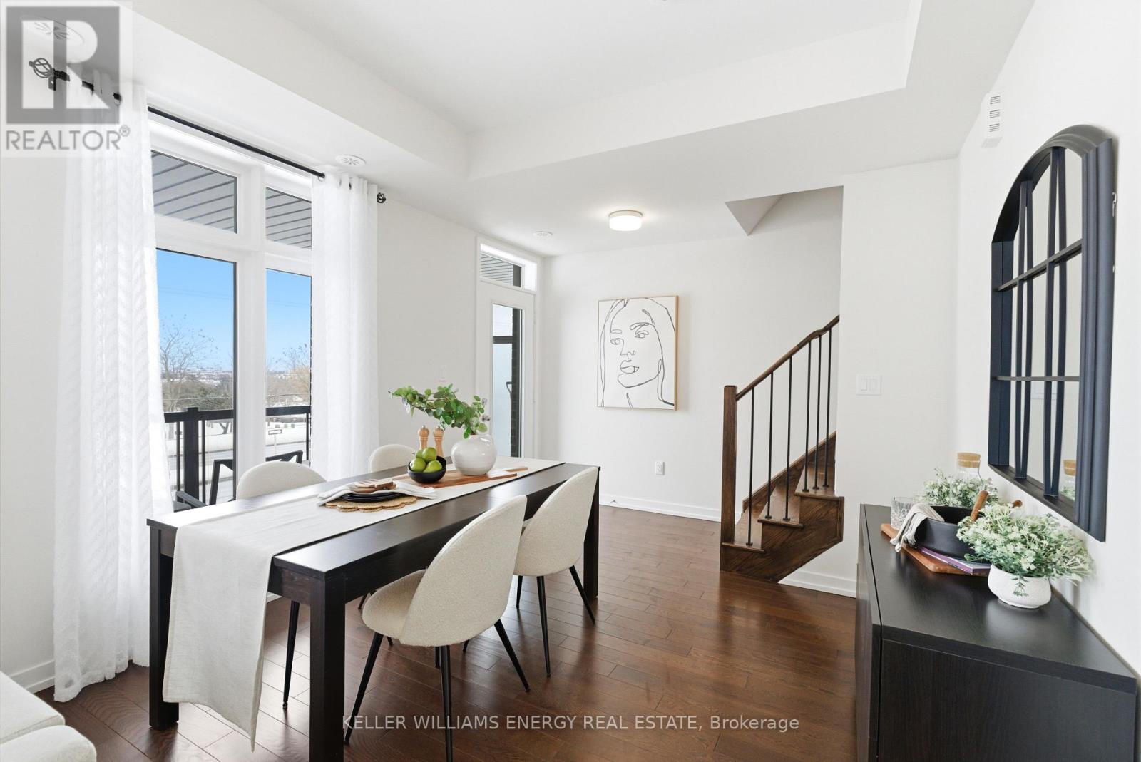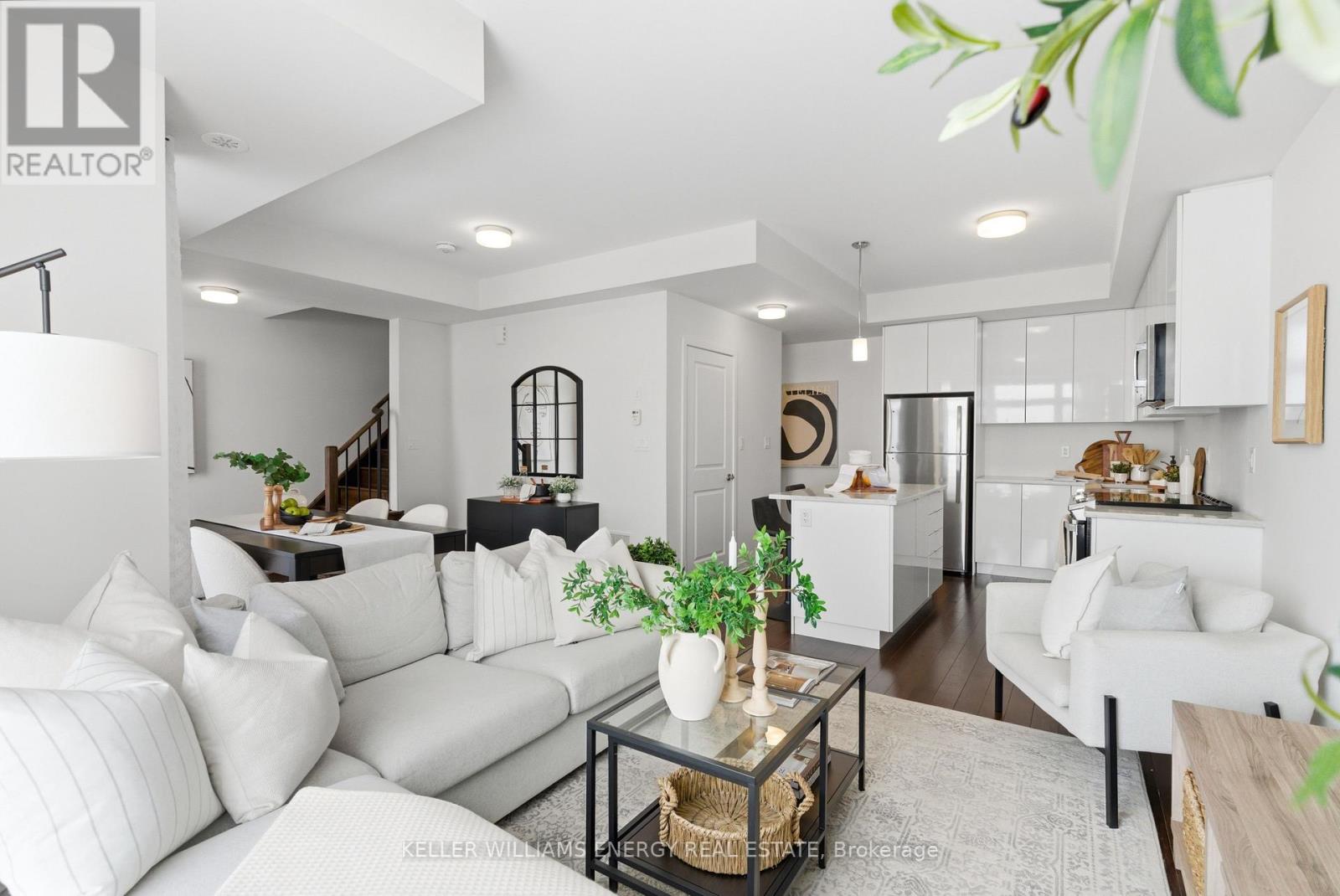 Welcome To This Stunning Home Featuring Modern Upgrades Throughout, Located In The Heart Of Pickering! Step Inside To A Welcoming Entry Level Featuring A Convenient Closet And Direct Access To The Garage. Upstairs, The Bright And Spacious Open-Concept Living Area Impresses With 9-Foot Ceilings, Hardwood Flooring, And An Updated Powder Room. The Modern Kitchen Boasts Stainless Steel Appliances, Quartz Countertops, And A Centre Island With Seating, Seamlessly Flowing Into The Living And Dining Areas. Large Windows Flood The Space With Natural Light And Lead To Your Private Balcony, Perfect For Morning Coffee Or Entertaining Guests. The Upper Level Offers Hardwood Flooring Throughout, Convenient Stackable Laundry, A Stylish Main Bathroom And Two Great Sized Bedrooms, Including A Serene Primary Retreat With 9.5-Foot Ceiling, Large Window, Walk-In Closet, And A Sleek 3-Piece Ensuite With A Walk-In Glass Shower! Outside, Enjoy A Nearby Park And Every Amenity You Could Dream Of Just Steps Away. This Move-In-Ready Home Offers The Perfect Blend Of Comfort, Style, And Convenience, Simply Unpack And Start Enjoying Everything It Has To Offer! Home Was Built In 2021. All Kitchen Appliances (2021), Clothes Washer & Dryer (2021), Powder Room (2025). Monthly Maintenance Fees Include Exterior Window Cleaning, Visitor Parking, Community Space Use & Maintenance (Park) & Garbage Collection. (42041411)