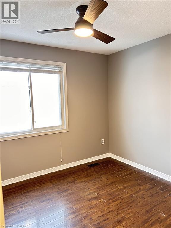 Empty room with dark wood-type flooring, a textured ceiling, and a ceiling fan
