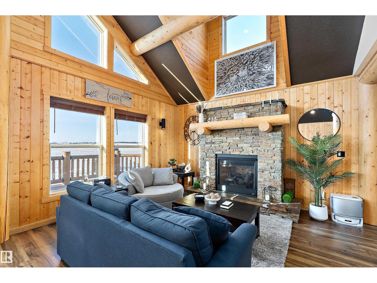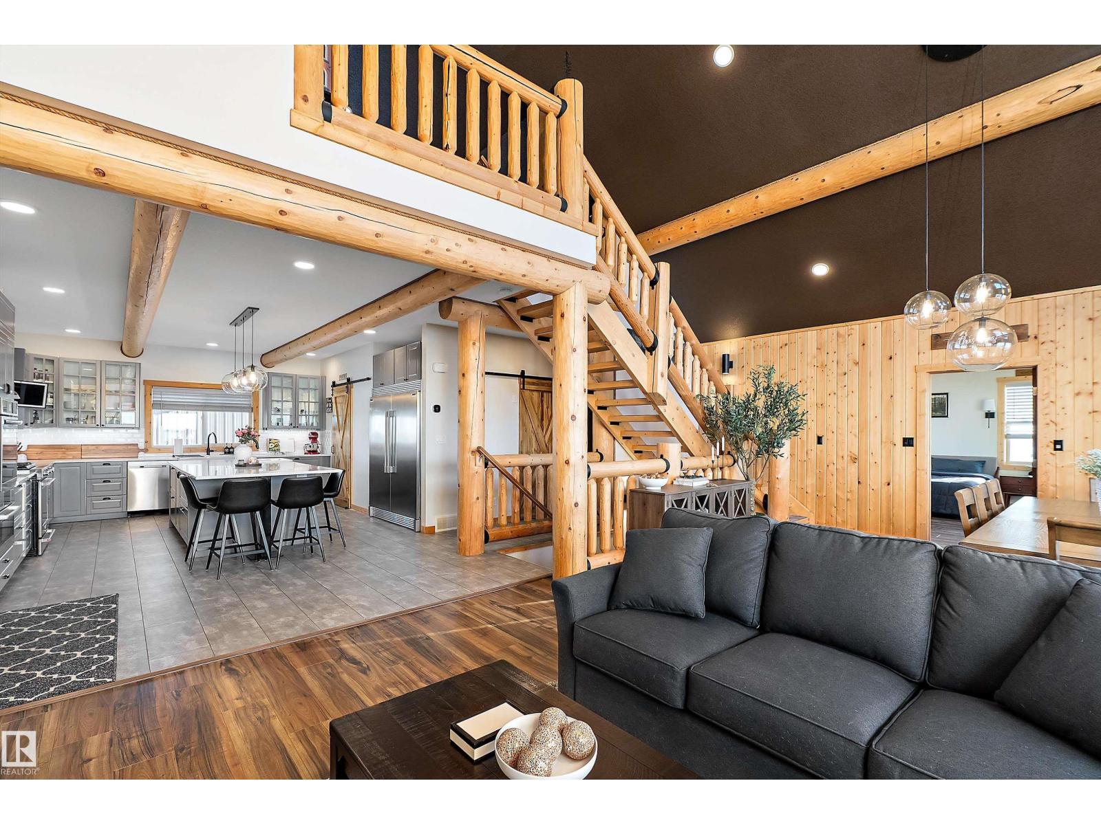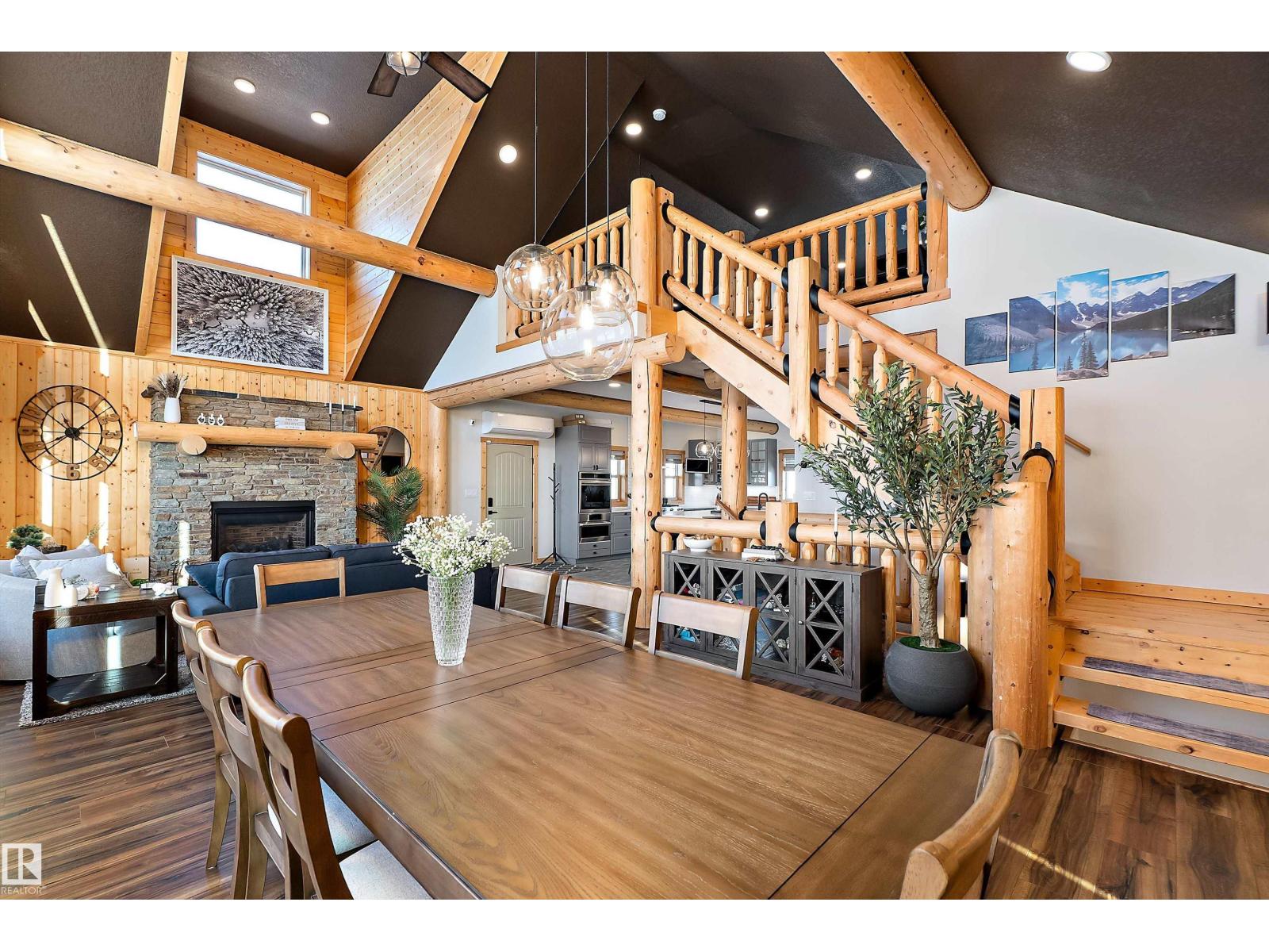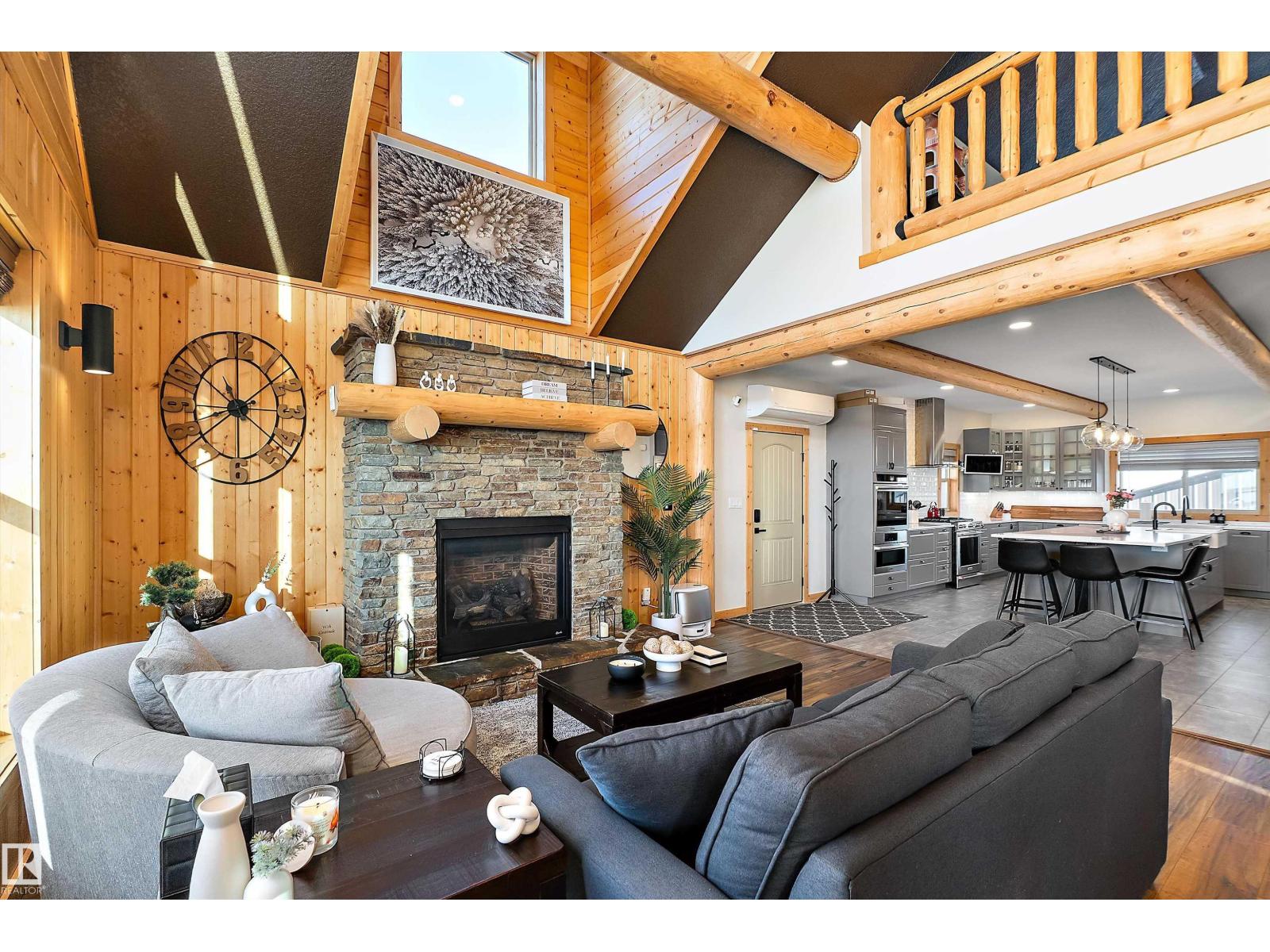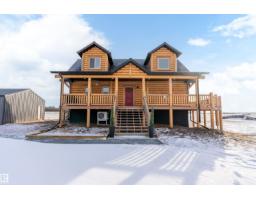 Custom-built Whisper Creek Kodiak Mountain Hybrid on 28.49 acres in Beaver County, blending rustic luxury with modern comfort. This open-concept home features soaring 20’ vaulted ceilings, log accents, expansive windows, and a stunning stone fireplace with log mantel. The loft overlooks the living and dining areas, adding to the grand yet inviting feel. The chef’s kitchen offers soft-close cabinetry, quartz countertops, commercial-size fridge, gas cooktop, walk-in pantry with coffee bar, and a large prep island. The primary suite is a private retreat with a 5-piece ensuite, clawfoot soaker tub, walk-in shower, and 60” electric fireplace. Main floor also includes a spacious mudroom/laundry with locker storage and 2-piece bath. The walkout lower level offers three bedrooms, rec room, kitchenette, 4-piece bath, and access to a covered patio and firepit area. Enjoy wraparound deck, covered front porch, oversized triple garage with subpanel, plus 100-amp RV power—just 30 minutes to Sherwood Park and Edmonton. (33774781)