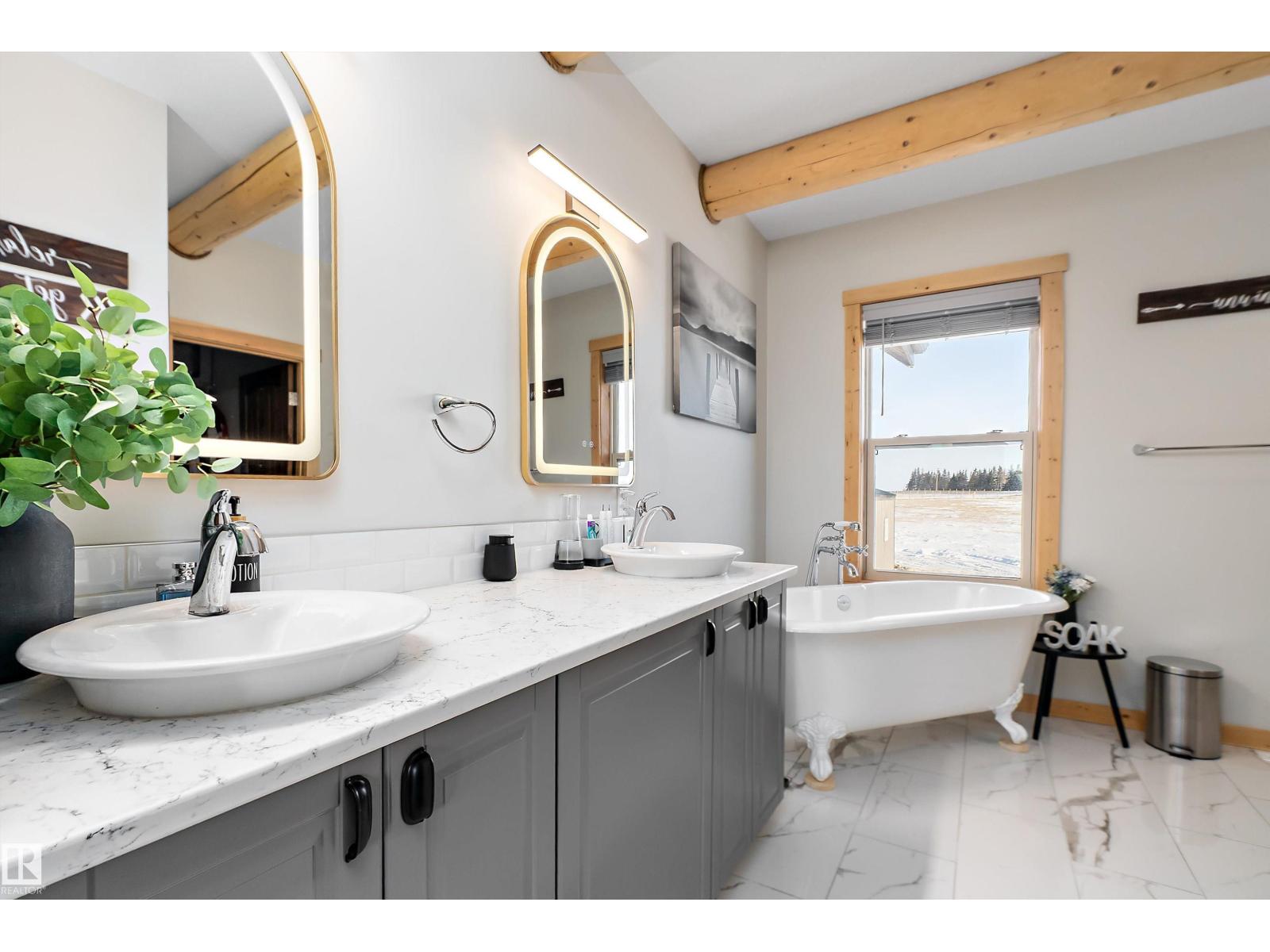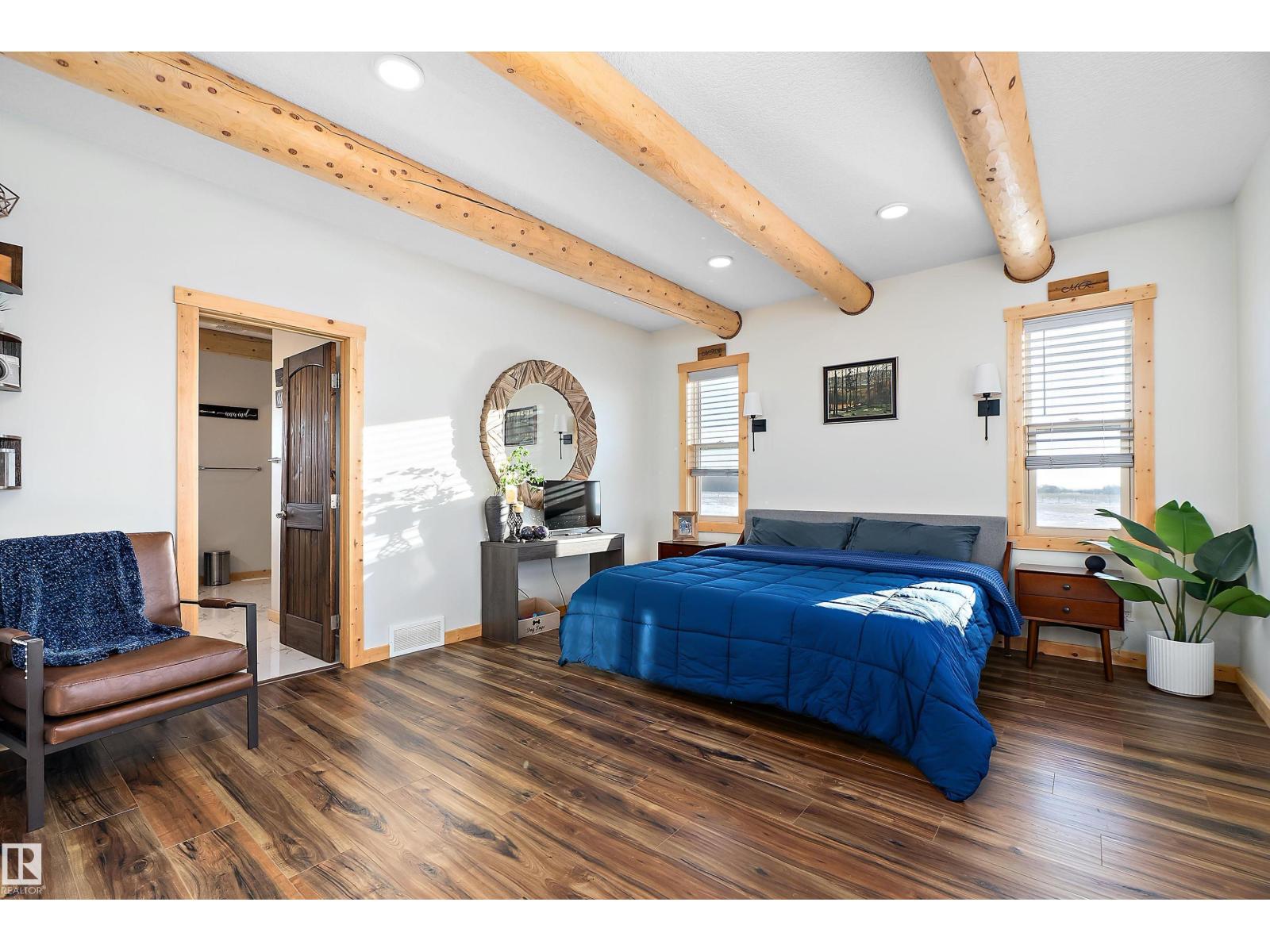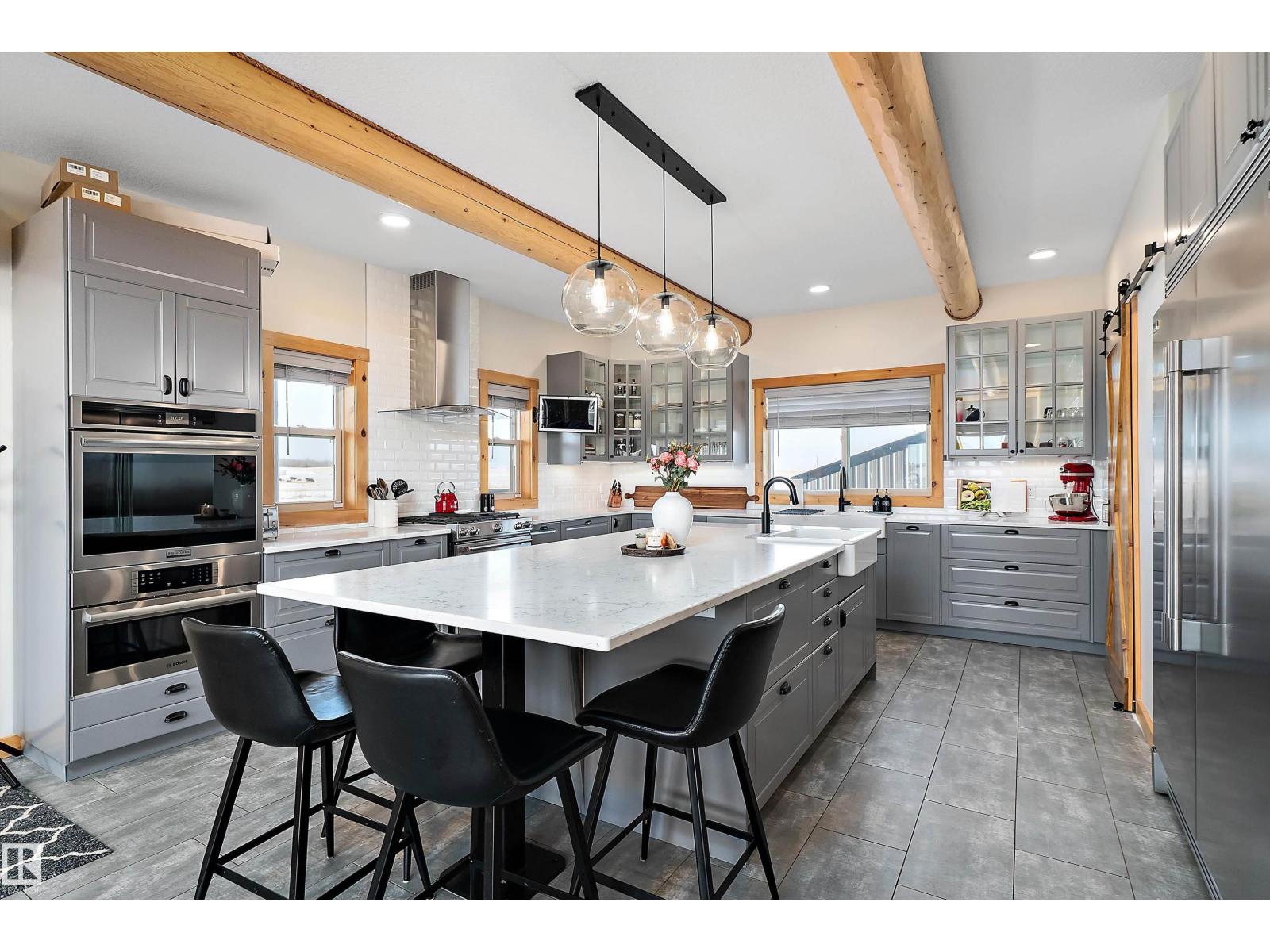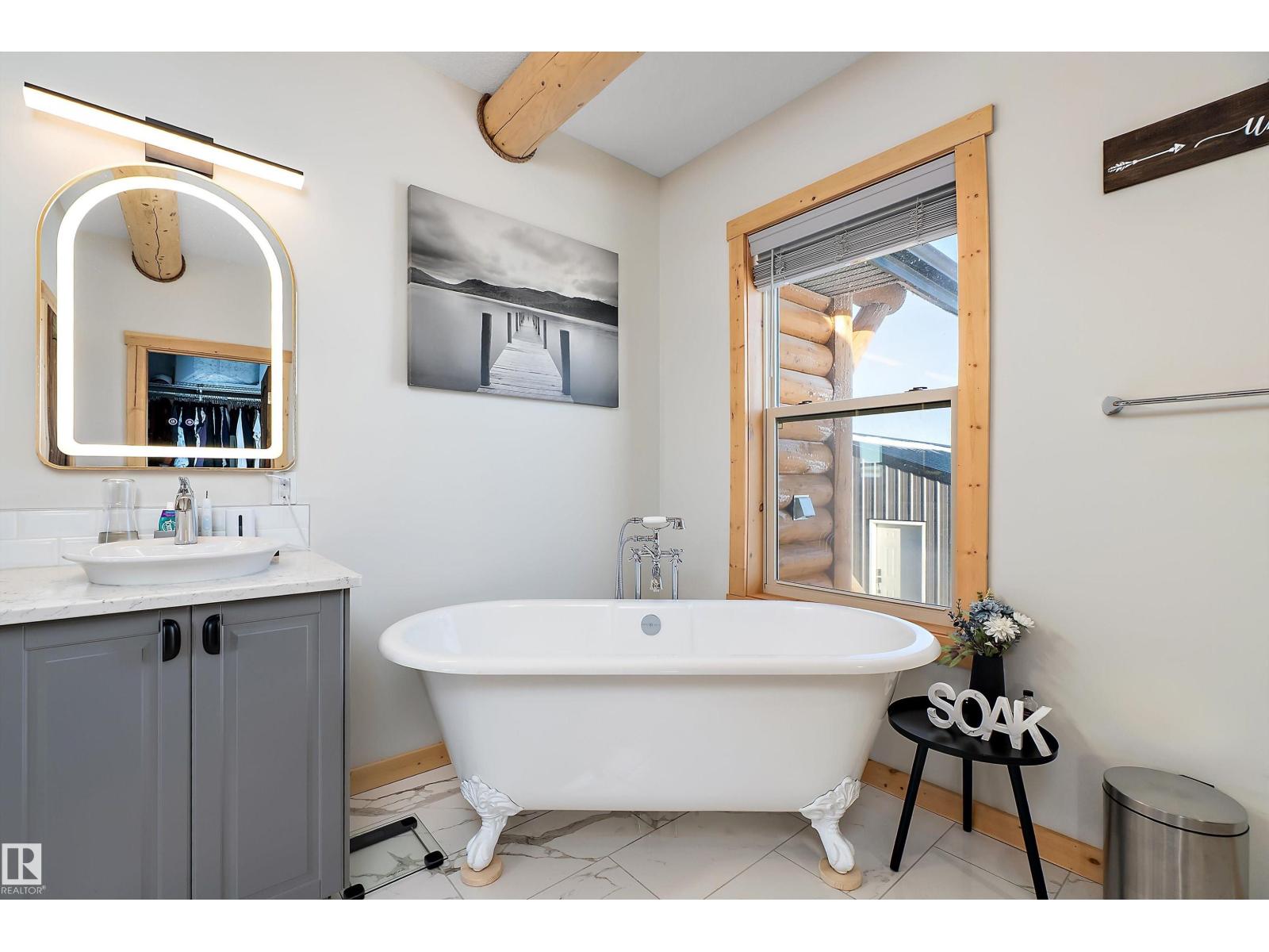 Custom-built Whisper Creek Kodiak Mountain Hybrid on 28.49 acres in Beaver County, blending rustic luxury with modern comfort. This open-concept home features soaring 20’ vaulted ceilings, log accents, expansive windows, and a stunning stone fireplace with log mantel. The loft overlooks the living and dining areas, adding to the grand yet inviting feel. The chef’s kitchen offers soft-close cabinetry, quartz countertops, commercial-size fridge, gas cooktop, walk-in pantry with coffee bar, and a large prep island. The primary suite is a private retreat with a 5-piece ensuite, clawfoot soaker tub, walk-in shower, and 60” electric fireplace. Main floor also includes a spacious mudroom/laundry with locker storage and 2-piece bath. The walkout lower level offers three bedrooms, rec room, kitchenette, 4-piece bath, and access to a covered patio and firepit area. Enjoy wraparound deck, covered front porch, oversized triple garage with subpanel, plus 100-amp RV power—just 30 minutes to Sherwood Park and Edmonton. (33774781)