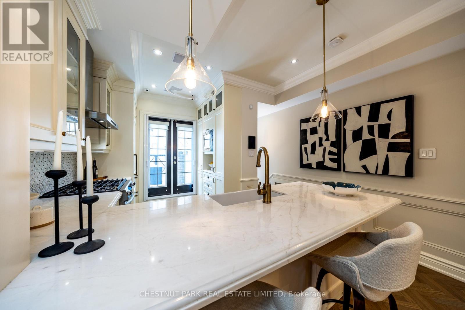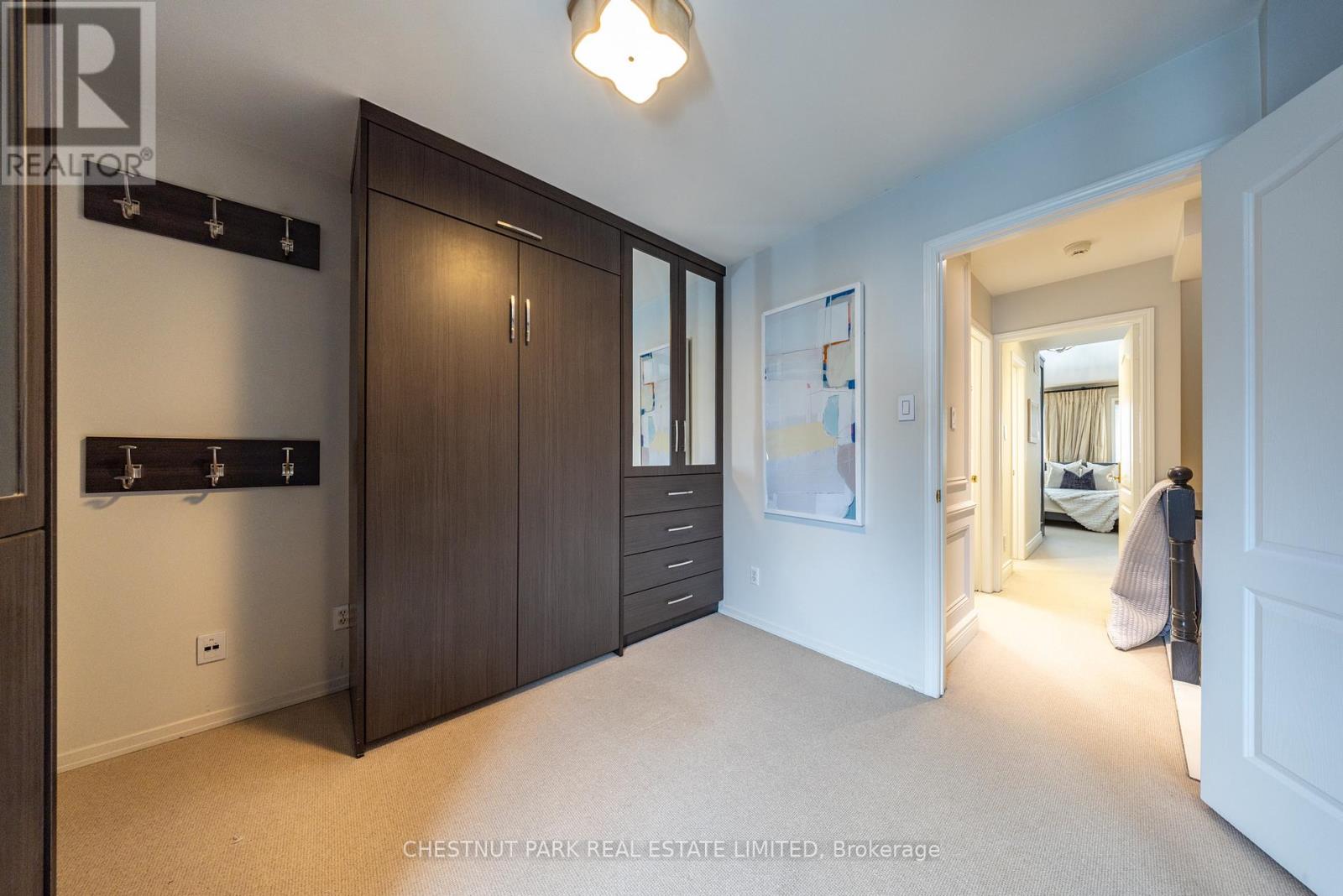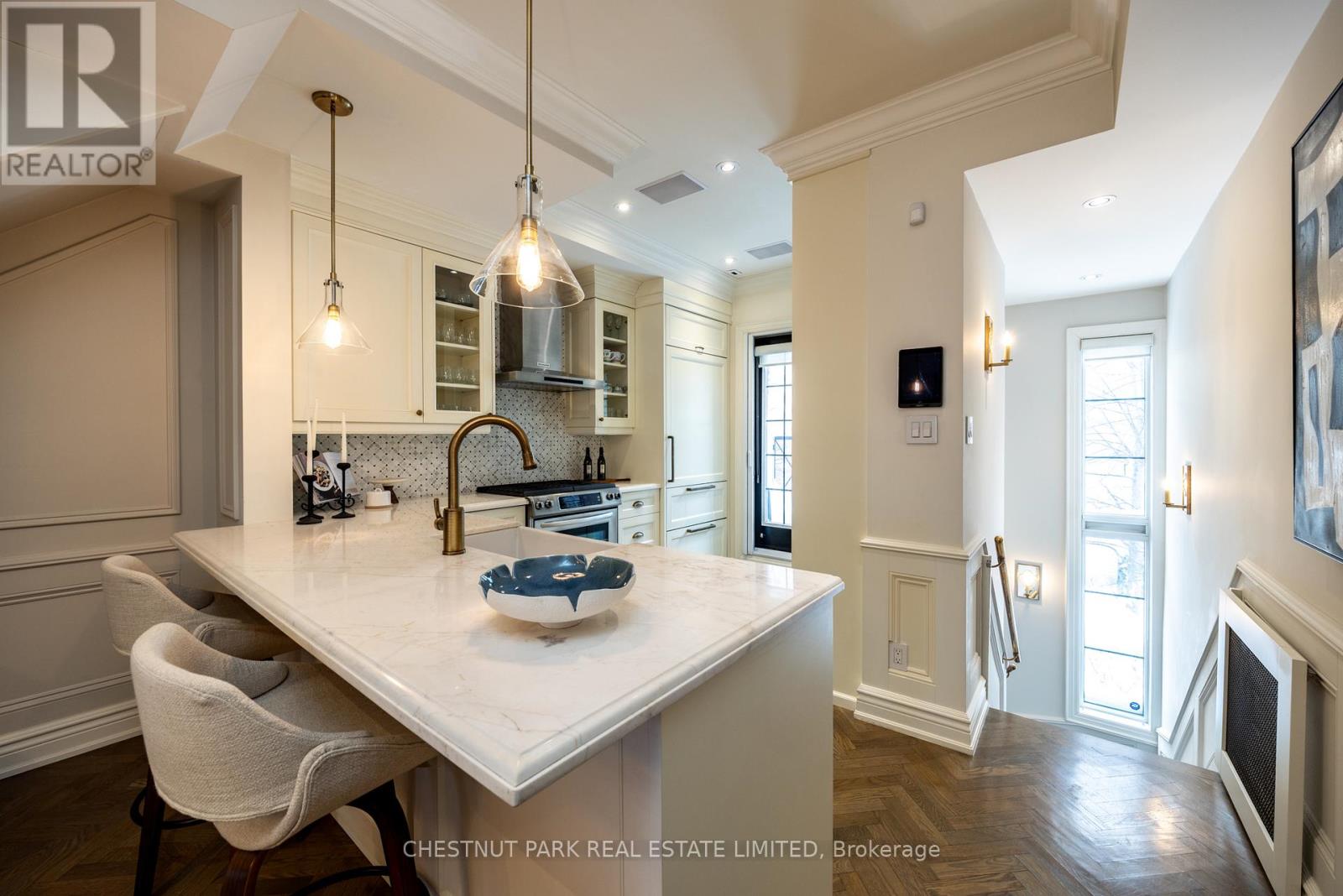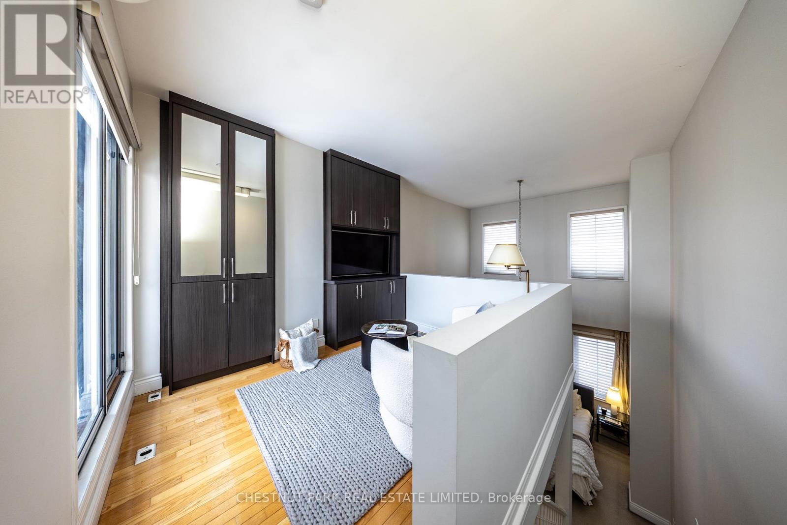Location and value don't get better than this! With approximately 1400 sq ft of living space, this beautifully renovated townhouse will tick all of the checkboxes on your list. The landscaped common courtyard is a lovely spot to reflect as you make your way to your wrought iron gate and private front door. With custom closets and storage, heated basketweave marble tile floor and powder room, the Entry is the perfect spot to take off your coat and put down your worries from the day. The open concept layout of the main living floor is designed and finished for easy living. The kitchen feels like a French bistro with marble countertops, marble tile backsplash, a breakfast bar, and French doors opening to a sunny deck with gas line for BBQs. Charming and inviting the living and dining areas have been finished with wainscotting and paneling, complementing the hardwood floors. In the living area a gas fireplace is set in a wall of marble and flanked by cabinets with glass display shelves for show and cabinets for storage of the Sonos components as well as other tech best tucked away. Upstairs, the double height primary bedroom is finished with wall to wall to wall built-in closets and drawers. The four piece semi-ensuite bathroom is picture perfect with double floating vanities, a glass shower enclosure and marble tile floors and surround. The second bedroom features even more storage with a double closet, wall to wall built-ins and a Murphy bed. Topping off the layout, private stairs lead from the sleeping of the primary bedroom area to a loft with further built-in cabinets perfect for a TV nook, office or home gym. Sliding doors open to the rooftop deck for additional outside space. The lower level is one of the prettiest laundry/utility rooms on record and provides direct access to the underground garage and parking spot. (42043743)