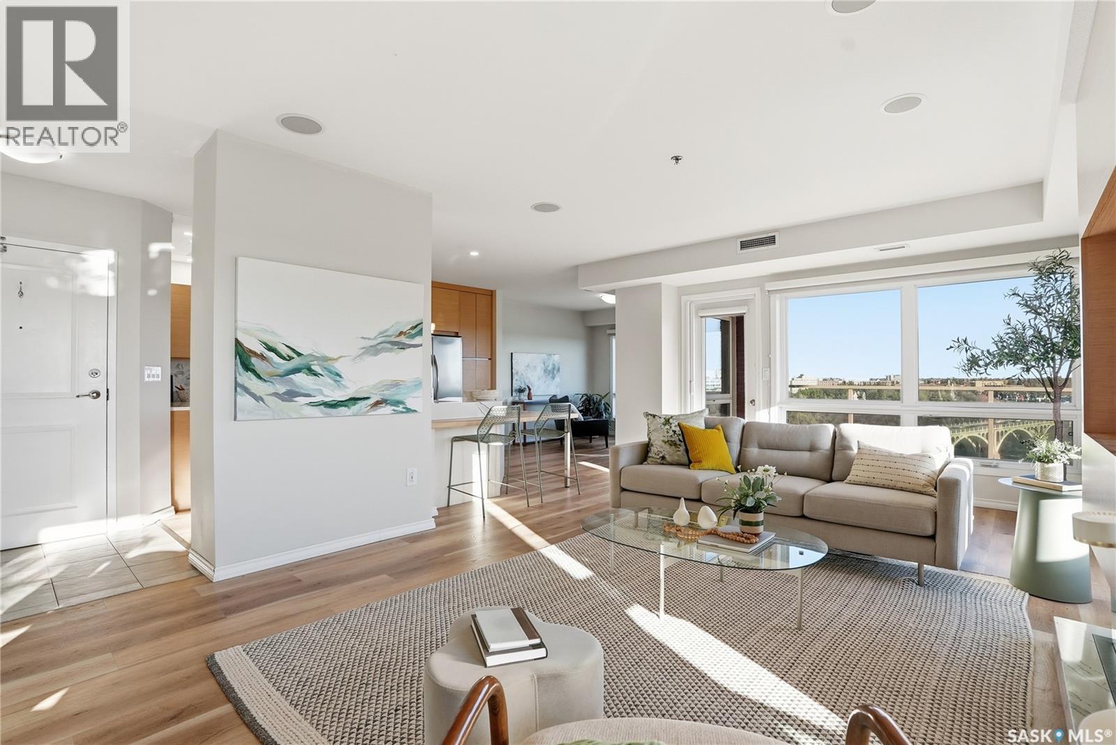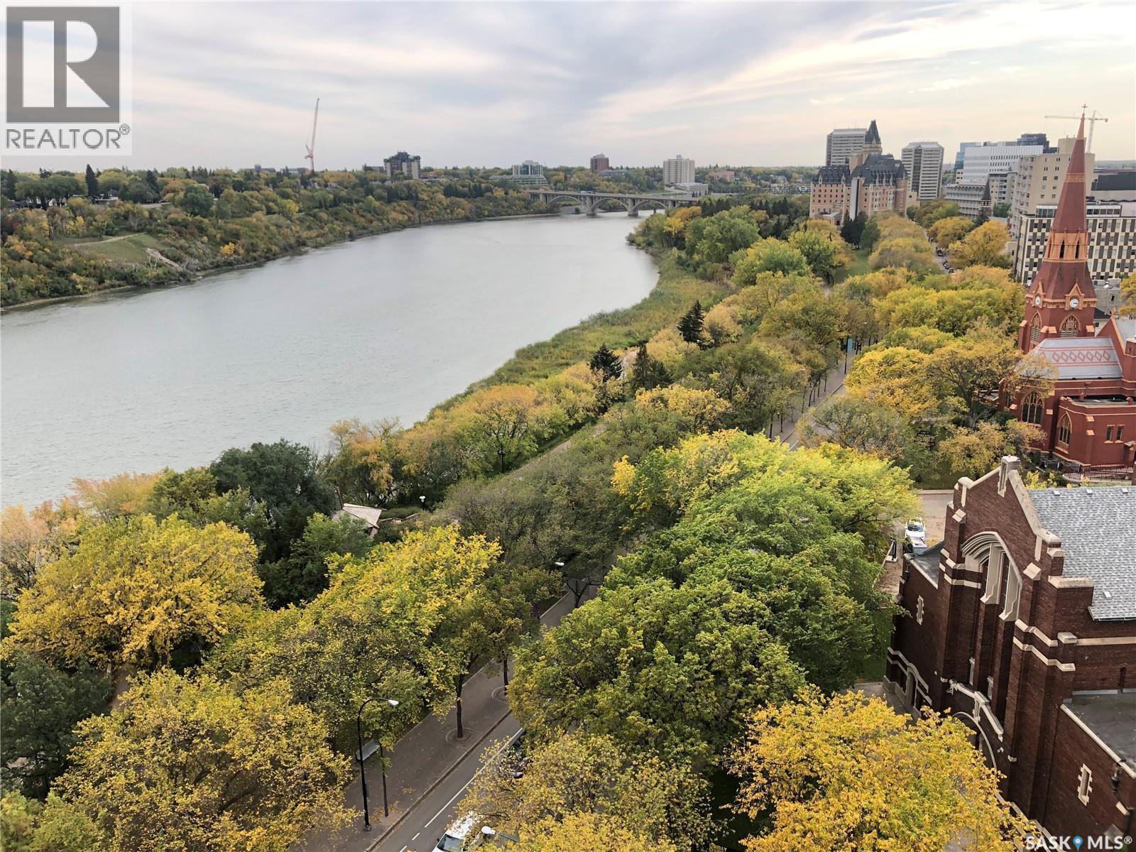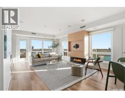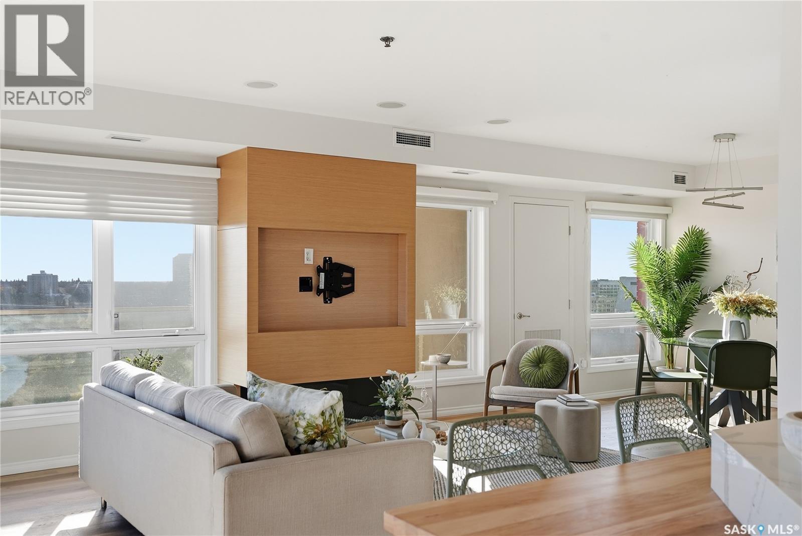One of the best views in the city. This beautiful luxury condo has it all: a million dollar view, premium upgrades, and impressive size. Since its purchase in 2018 over $150,000 in renovations have been invested. Updates include a custom kitchen, a redesigned living room with fireplace feature wall, and modern bathroom cabinetry, lighting, blinds, built in shelving in the closets, luxury vinyl floors. Enjoy unmatched south and east-facing panoramic views from the wraparound deck, complete with upgraded tile flooring and a natural gas BBQ hookup. The gorgeous living room showcases sweeping views of the South Saskatchewan River from every angle, creating a bright and peaceful atmosphere. The modern kitchen features contemporary cabinetry, stylish countertops, a functional island, and stainless steel appliances,perfectly designed for both cooking and entertaining. Every room offers breathtaking views: use the sunny corner as your home office or a relaxing sitting area.The master bedroom includes a spacious walk-in closet and a stunning three-piece ensuite with a steam shower and heated tile floors for ultimate comfort. The second bedroom features a smart built-in desk within the closet, ideal for a work-from-home setup.Additional highlights include a built-in sound system throughout the unit and balcony, one underground parking stall, and a storage unit. The fireplace, originally gas, is now electric but can easily be reconnected to gas. This well-managed, quiet concrete building is pet-friendly (with Board approval) and offers top-tier amenities: a gym, amenities/meeting room, guest suites, on-site maintenance, and garbage chutes on every floor. Located in the heart of Downtown Saskatoon, you’ll enjoy front-row views of the city skyline, with walking access to the University of Saskatchewan, restaurants, hospitals, and river trails.Large windows throughout create a scenic, light-filled living experience the perfect blend of luxury, comfort, and location. (29331766)