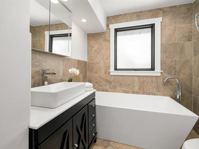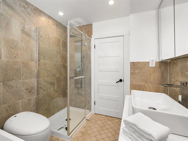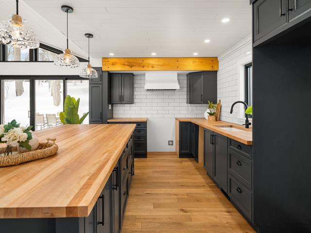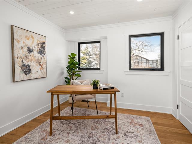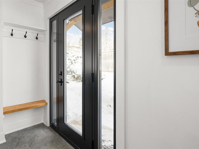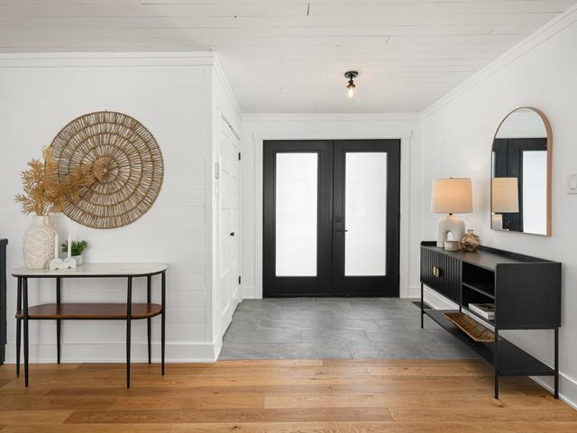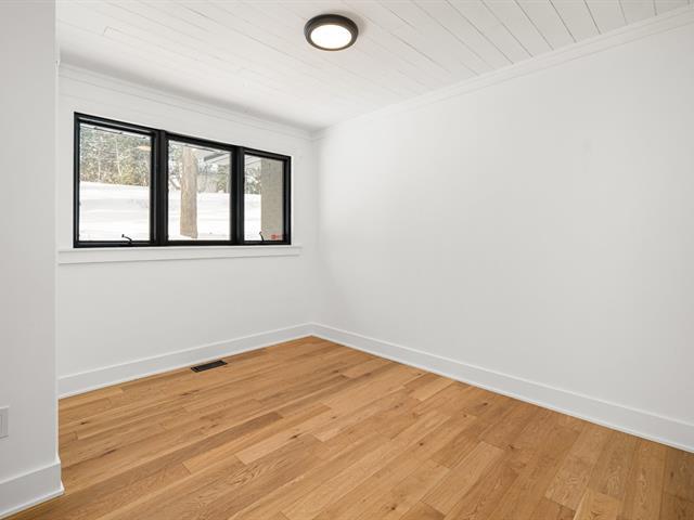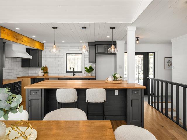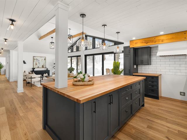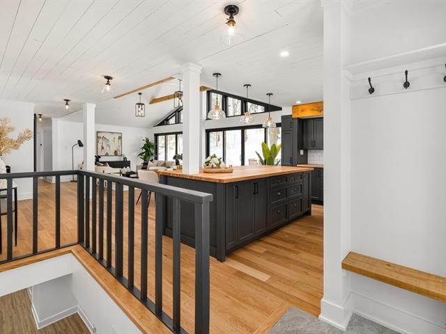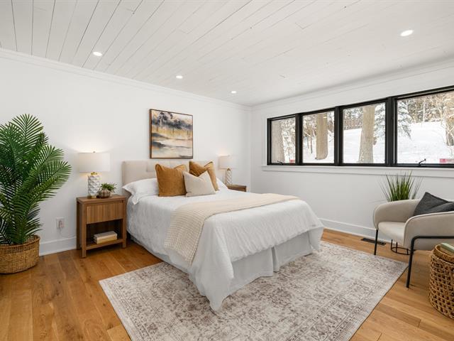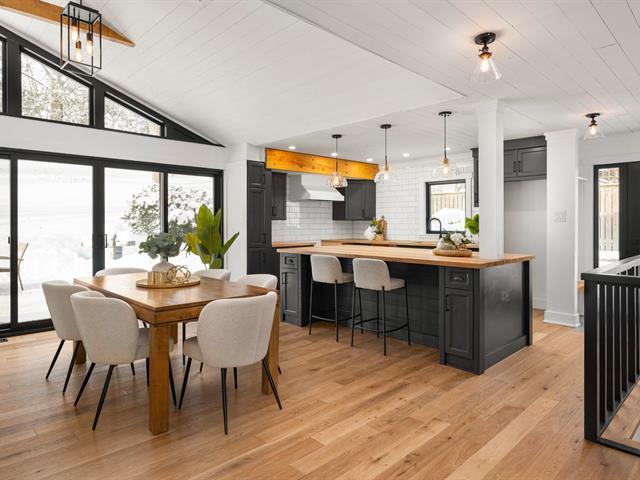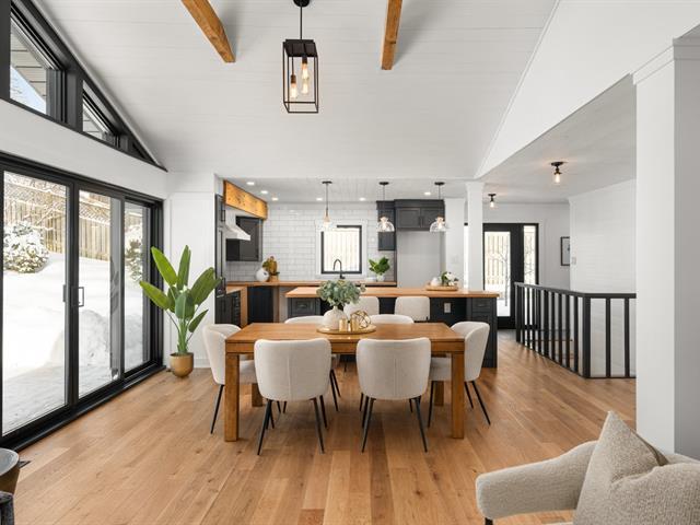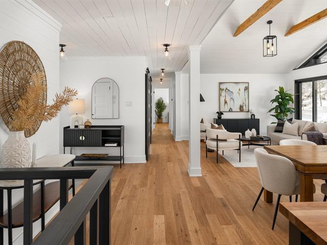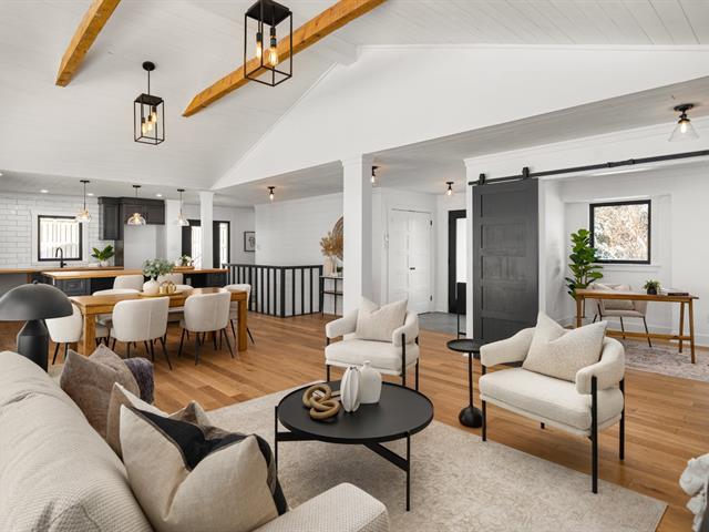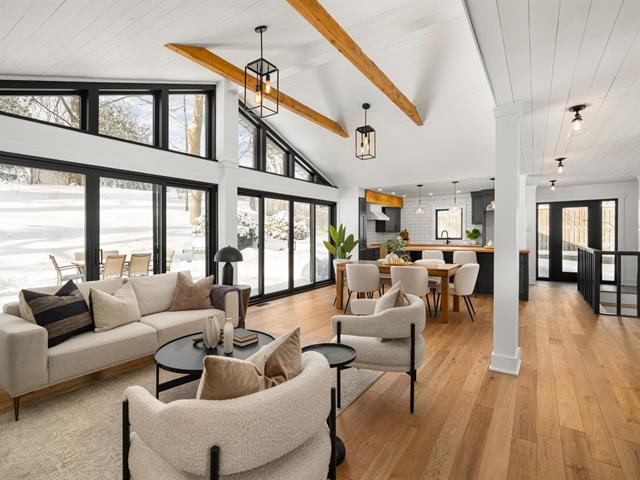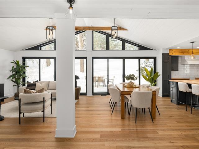 Turn key 3+1 bedroom 3 full bathroom bungalow on a quiet crescent steps from Balsam Park in sought after Baie-D'Urfe. This bright, open-concept home is where timeless design meets everyday comfort. Vaulted ceilings with exposed wood beams, wide plank white oak floors, and oversized black-framed windows overlooking the west facing garden create a warm yet striking atmosphere throughout the main living space. A rare blend of style, function, architectural details and warmth. (56108842)
