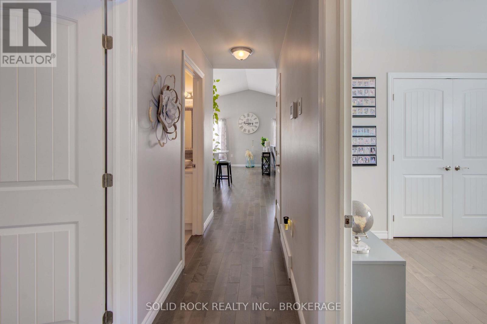 Peaceful country living just 15 minutes north of Kingston! This meticulously maintained, 4-bedroom, 3-bath elevated bungalow offers space, privacy, and modern comfort. Bright open-concept main level with large windows, quartz kitchen countertops and backsplash, and brand-new hardwood floors throughout. French doors off the dining area lead to a spacious deck for easy indoor-outdoor living, while a custom fireplace adds warmth to the living room. The main floor includes 3 bedrooms, including a primary with ensuite and an additional stylish full bathroom. The fully finished lower level features a large rec room with fireplace, 4th bedroom, and a full bath with walk-in shower - ideal for guests or extended family. Pool table included. Bonus: impressive 36' x 60' Quonset hut perfect for a workshop, oversized garage, storage, or home-based business. Move-in ready with room to live, work, and play. (42046530)
