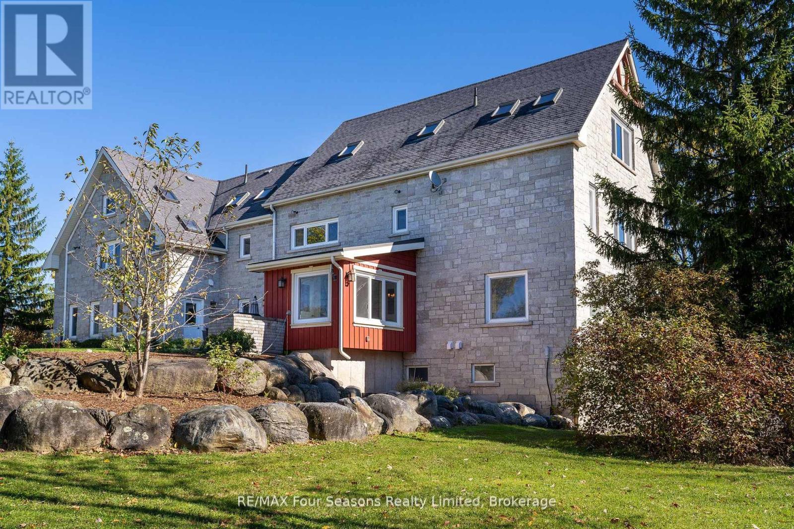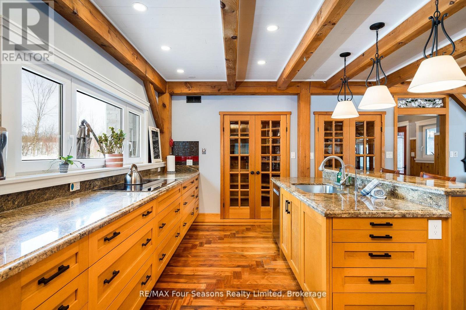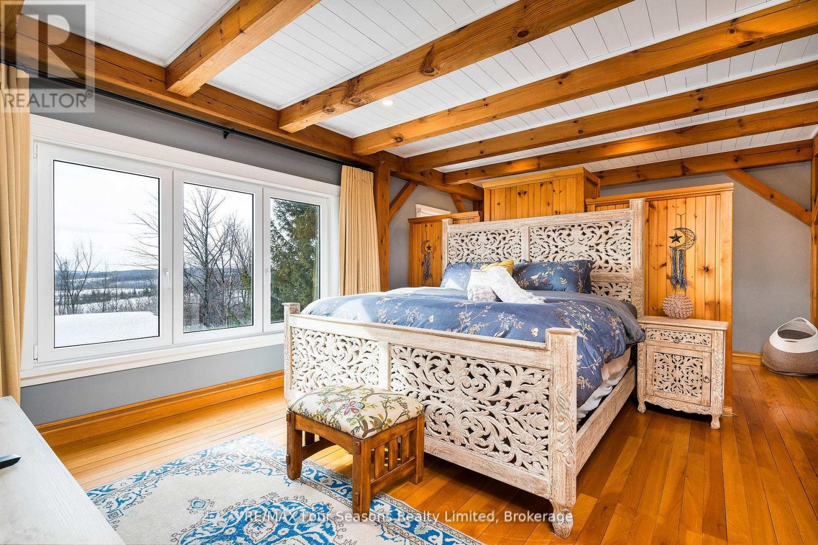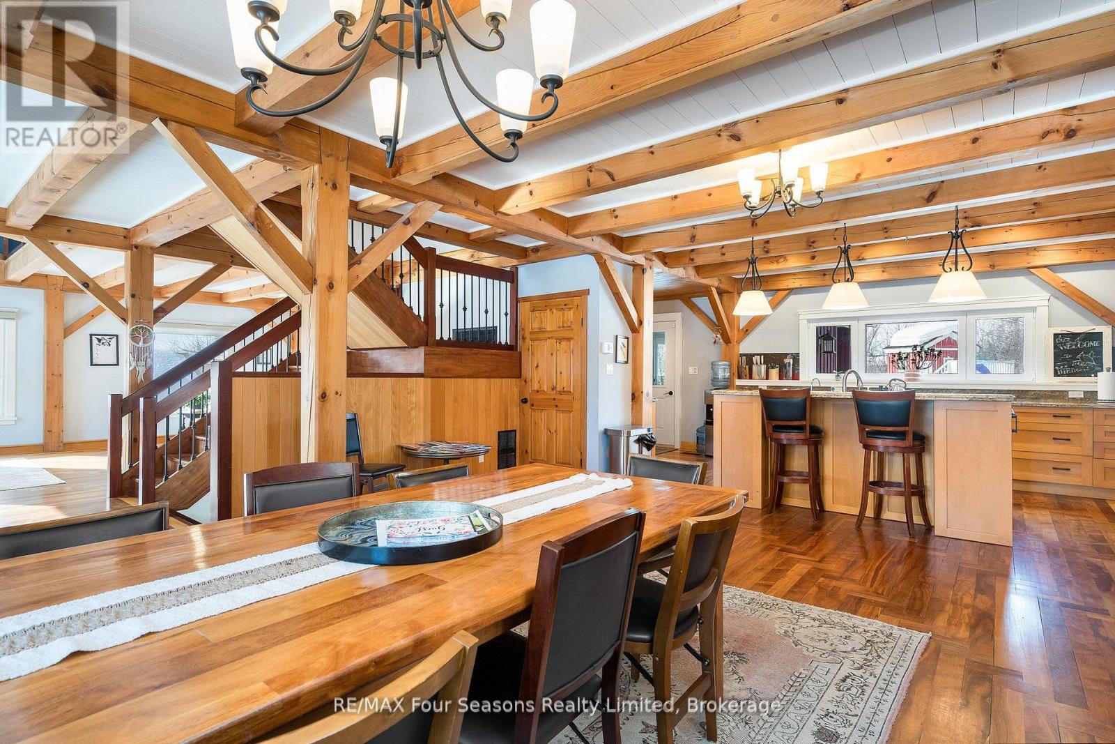Stunning Timber Frame Estate on 2.5 Acres in Thornbury. Exceptional stone-clad timber frame residence offering approximately 6,300 sq. ft. of beautifully crafted living space, set on 2.5 private, fully landscaped acres. Designed for extended family living, entertaining, or use as a luxury short-term rental (Airbnb), this one-of-a-kind property delivers comfort, privacy, and four-season enjoyment. The maintenance-free all-stone exterior provides superior insulation and quiet durability, while the timber frame construction and South American hardwood floors add warmth and character throughout. Expansive, light-filled principal rooms create an inviting atmosphere for both everyday living and hosting larger groups. The home features 6 bedrooms and 6 bathrooms, including a primary suite and guest suite with private ensuites, offering excellent flexibility for family and guests. The chef's kitchen is complemented by a butler's pantry and separate baker's kitchen, ideal for entertaining or catering. European tilt-and-turn windows enhance energy efficiency and indoor-outdoor flow. Resort-style amenities include a 17-foot indoor swim spa and sauna, geothermal heating and cooling, and radiant in-floor heating throughout. Multiple living areas provide ample space and privacy, making the layout well suited for short-term rental use. Additional highlights include a 36' x 24' heated workshop with separate driveway, perfect for hobbies, storage, or a home business, and a 26' diameter dome greenhouse for year-round gardening. Furnishings are negotiable, offering potential for a turnkey rental opportunity. Ideally located minutes from Thornbury and Meaford, and a short drive to Blue Mountain Village and private ski clubs, this chalet-inspired estate offers an outstanding opportunity to enjoy a premium recreational lifestyle or generate income in a sought-after four-season destination. (42047589)