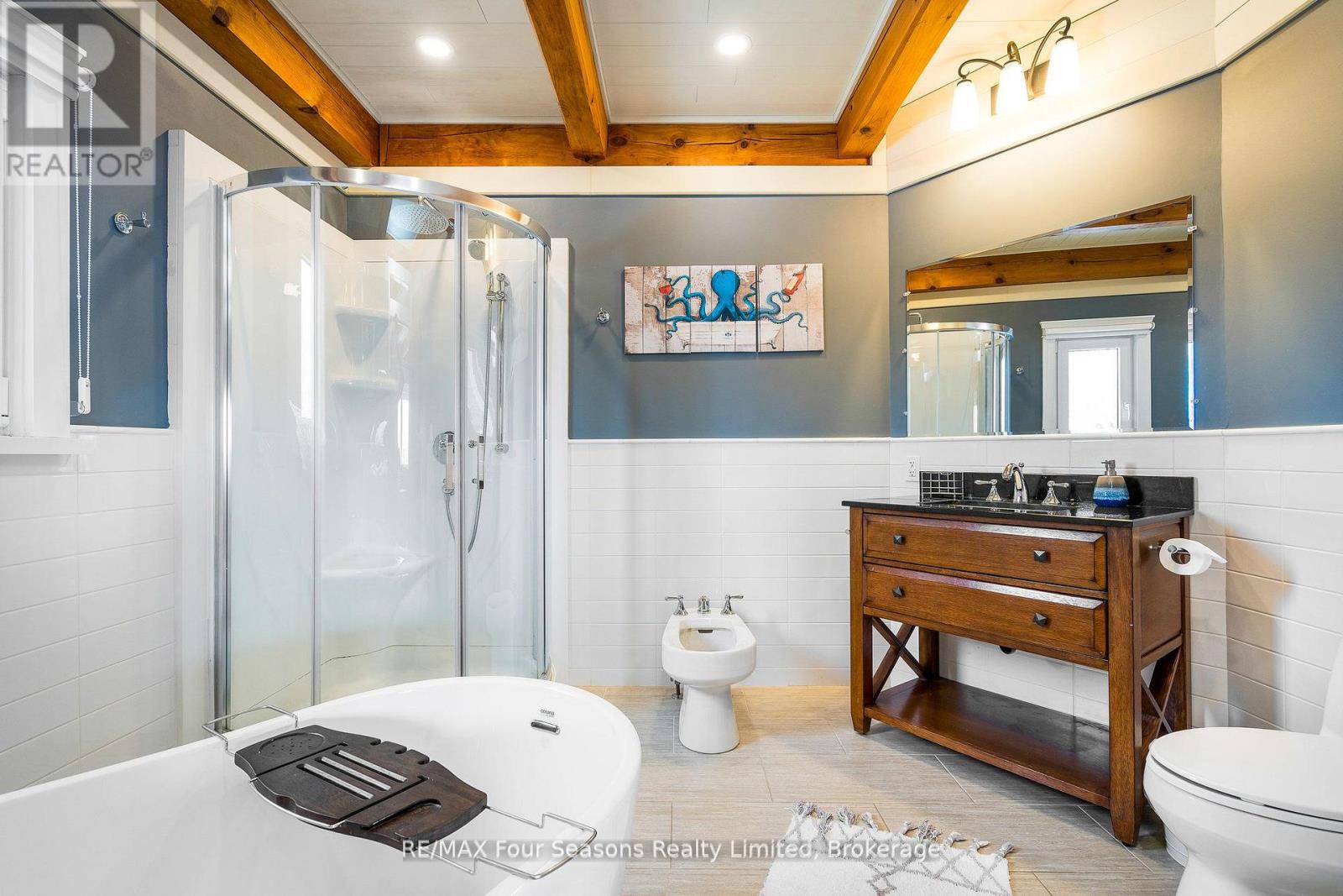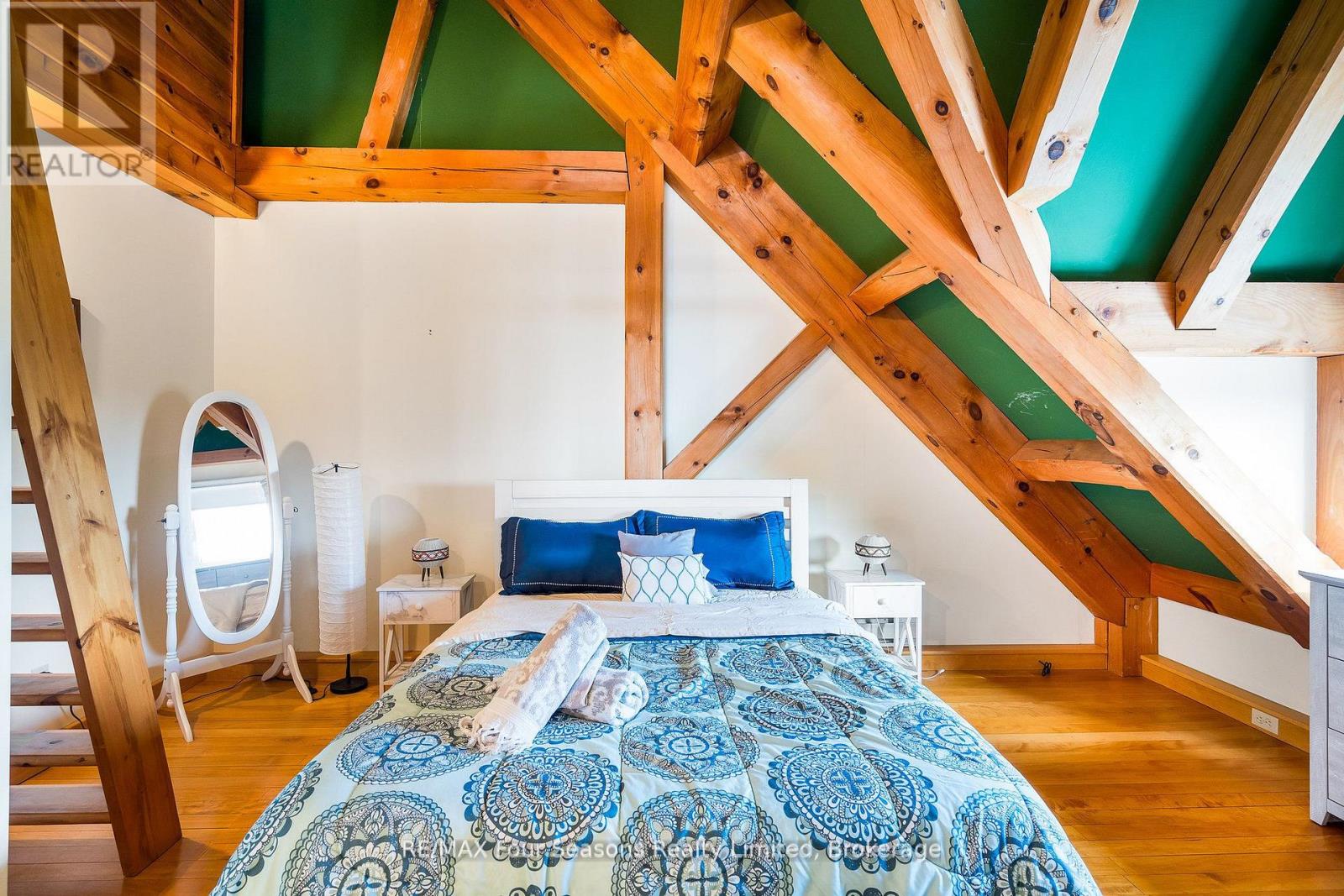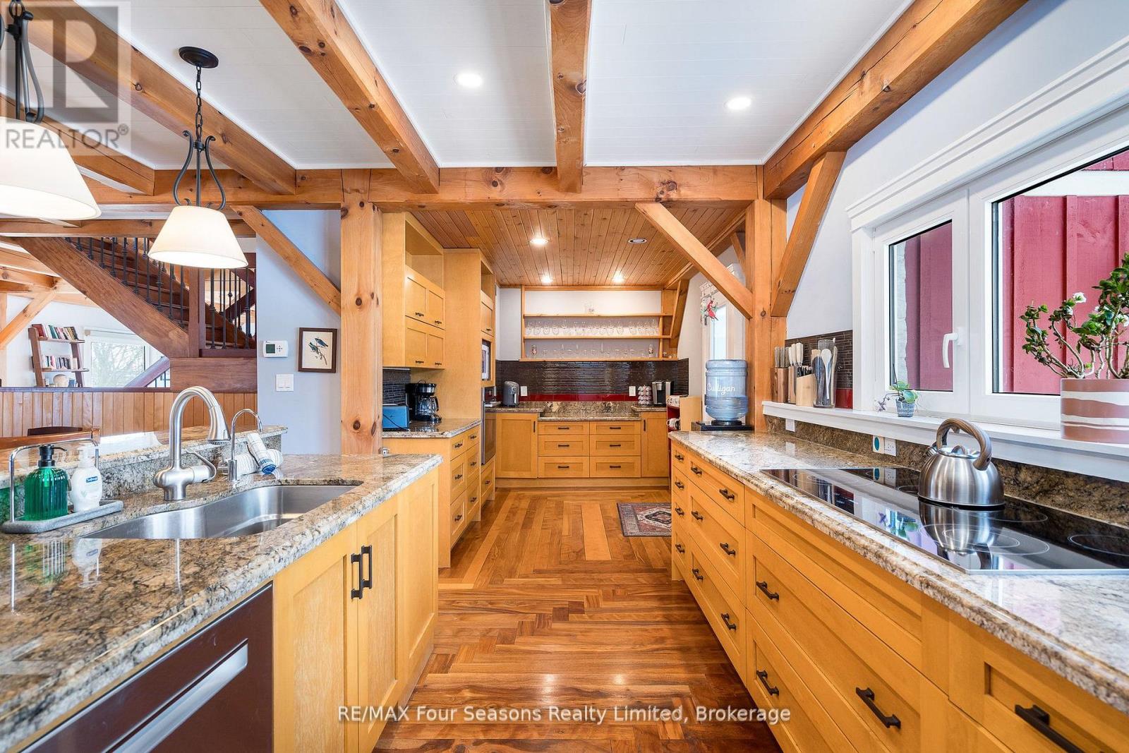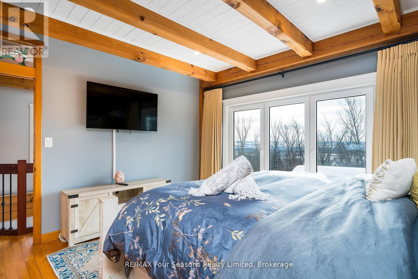 Stunning Timber Frame Estate on 2.5 Acres in Thornbury. Exceptional stone-clad timber frame residence offering approximately 6,300 sq. ft. of beautifully crafted living space, set on 2.5 private, fully landscaped acres. Designed for extended family living, entertaining, or use as a luxury short-term rental (Airbnb), this one-of-a-kind property delivers comfort, privacy, and four-season enjoyment. The maintenance-free all-stone exterior provides superior insulation and quiet durability, while the timber frame construction and South American hardwood floors add warmth and character throughout. Expansive, light-filled principal rooms create an inviting atmosphere for both everyday living and hosting larger groups. The home features 6 bedrooms and 6 bathrooms, including a primary suite and guest suite with private ensuites, offering excellent flexibility for family and guests. The chef's kitchen is complemented by a butler's pantry and separate baker's kitchen, ideal for entertaining or catering. European tilt-and-turn windows enhance energy efficiency and indoor-outdoor flow. Resort-style amenities include a 17-foot indoor swim spa and sauna, geothermal heating and cooling, and radiant in-floor heating throughout. Multiple living areas provide ample space and privacy, making the layout well suited for short-term rental use. Additional highlights include a 36' x 24' heated workshop with separate driveway, perfect for hobbies, storage, or a home business, and a 26' diameter dome greenhouse for year-round gardening. Furnishings are negotiable, offering potential for a turnkey rental opportunity. Ideally located minutes from Thornbury and Meaford, and a short drive to Blue Mountain Village and private ski clubs, this chalet-inspired estate offers an outstanding opportunity to enjoy a premium recreational lifestyle or generate income in a sought-after four-season destination. (42047589)
