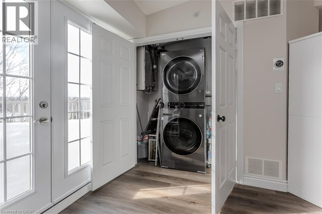 Welcome to a beautifully upgraded condo retreat backing onto a tranquil park, nestled in the highly sought-after Glen Abbey neighbourhood. Surrounded by scenic trails and green spaces, yet just minutes to highways and everyday essentials, this location strikes the perfect balance between convenience and calm—ideal for first-time buyers and downsizers alike. Inside, the space is bright, fresh, and thoughtfully updated throughout. Newer laminate flooring (2024), fresh paint, and upgraded light fixtures create a modern, move-in-ready feel, while vaulted ceilings in the main living area add an airy sense of volume. The open-concept layout flows effortlessly from the living and dining areas into a stylish, upgraded kitchen featuring quartz countertops (2024), a classic subway tile backsplash, custom cabinetry (2024), stainless steel appliances (2024), and a peninsula with breakfast bar—perfect for casual meals or entertaining. A walkout leads to a private balcony overlooking the park, offering a peaceful outdoor escape. The spacious primary bedroom features a large window and a 4-piece ensuite with an upgraded vanity. A second bedroom provides flexibility for guests, a home office, or hobby space, while the 3-piece main bath impresses with a walk-in shower and upgraded vanity. In-suite laundry with newer machines (2024) adds everyday ease. Complete with one underground parking space and a storage locker, this well-managed building also offers fantastic amenities including a clubhouse with gym and sauna, plus a convenient underground car wash. A perfect opportunity to enjoy low-maintenance living in a prime, park-side setting. (70108221)