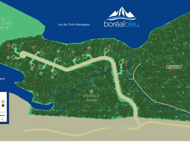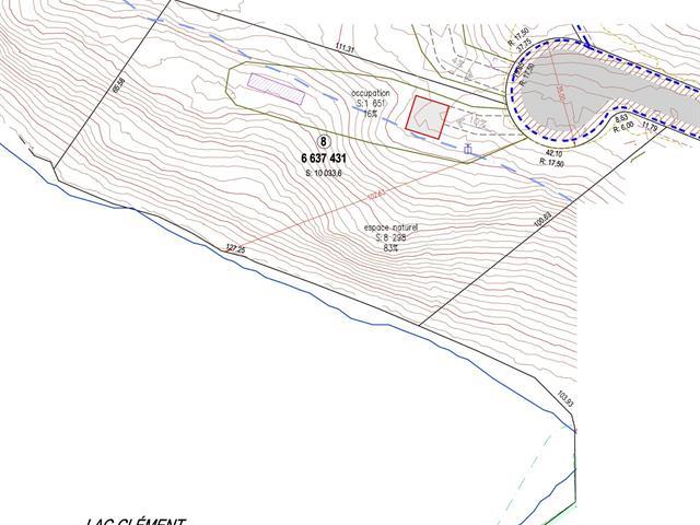 Boreal Bleu Phase 2 - Lot #8. Unique opportunity to acquire a very large 107,955 square foot (2.4 acres) lot directly on the shore of beautiful Lake Clement in La Conception. Superb sunny southwest orientation. Peaceful lake with no motorboats and excellent water quality. 127 meters (417 feet) of shoreline! The ideal location to build your dream property. A new road (included) is being built built from Route des Érables. You don't want to miss this! GST/QST must be added to the asking price (46119084)