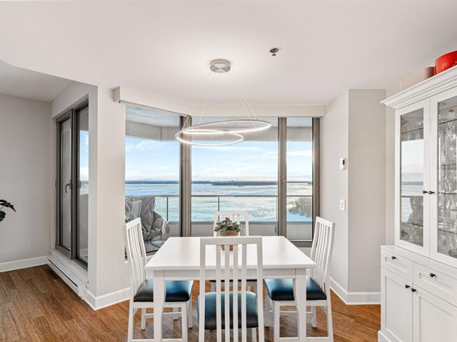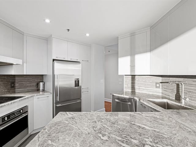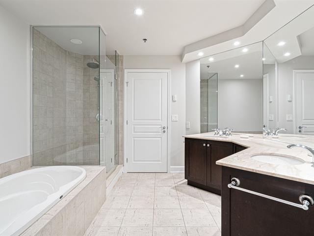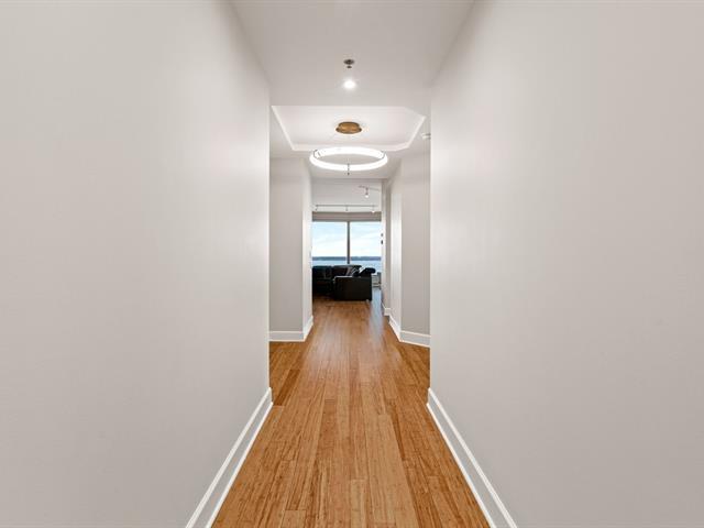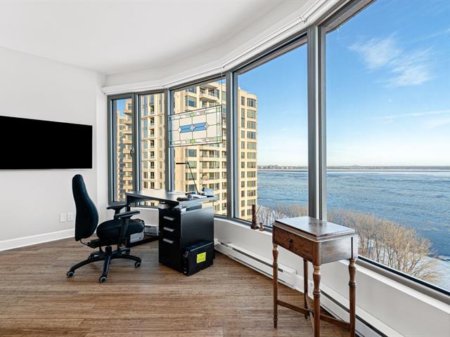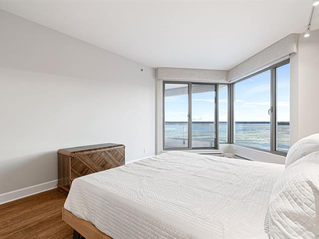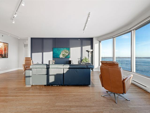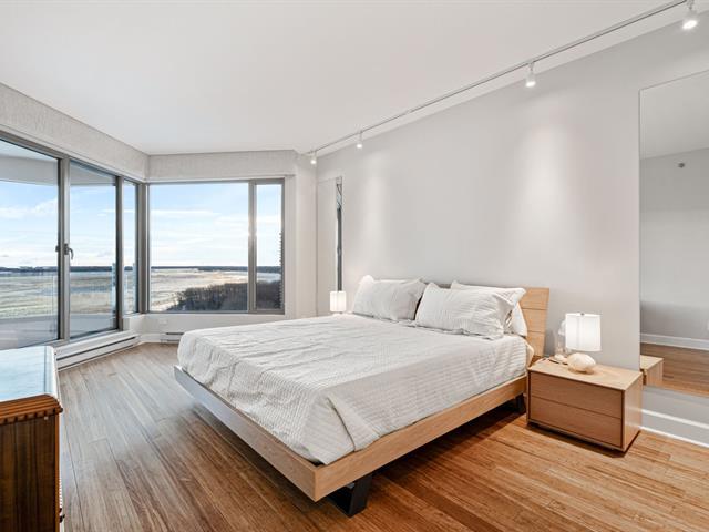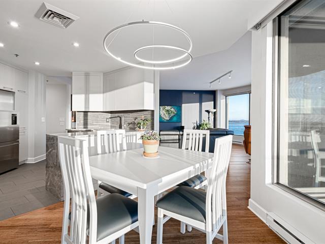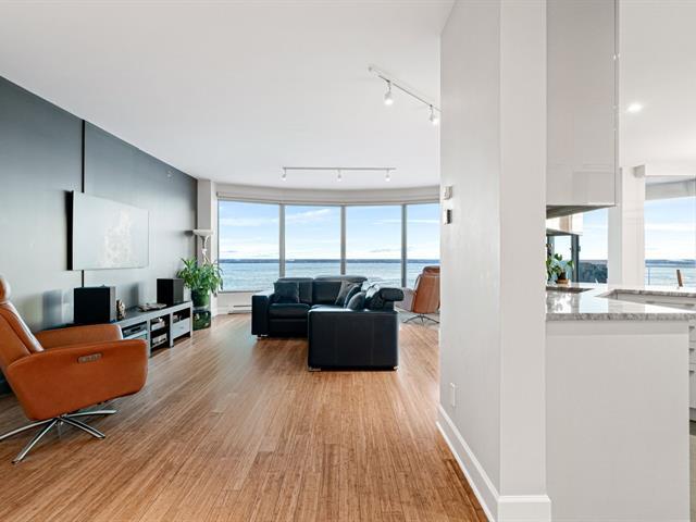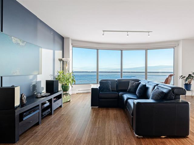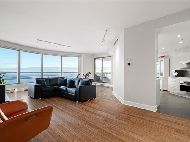 Prestigious condo located at Les Sommets sur le Fleuve -- Phase IV, in the heart of the Pointe-Sud, offering spectacular panoramic views of the river and the Lachine Rapids. Bright open-concept unit featuring generous floor-to-ceiling windows and exceptional natural light. Three bedrooms, including a primary suite with walk-in closet, and two bathrooms. Fully renovated kitchen, modern and functional, high-end finishes and hardwood floors. Large private balcony. Includes two garage spaces and storage. Building amenities include 24-hour security, indoor and outdoor pools, spa, gym, sauna, and landscaped trails along the waterfront. (47122833)
