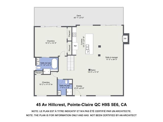 Welcome to 45 Hillcrest, a beautifully renovated turnkey bungalow on a quiet cul-de-sac in sought-after Pointe-Claire. Bright open-concept living with a modern kitchen, oversized island, and inviting living room with built-in fireplace. The home offers 5 generously sized bedrooms, including a spacious primary bedroom with ensuite bathroom and patio doors leading to a large balcony. Large finished basement, spacious backyard, garage and parking for up to 4 cars. Steps from the waterfront, Lakeside Park, schools, shops, and easy access to Highway 20. (47812439)