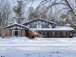 Classic Tudor-style home offering 3+2 bedrooms and three fireplaces, ideally located on a quiet, private crescent with easy highway access. Features a grand main entrance and a spectacular living/dining area with 14-ft ceilings, stone fireplace and triple patio doors leading to a three-season solarium. Main floor office/family room with wood burning fireplace. Fully finished basement includes playroom, den, two bedrooms and ample storage. Property also includes heated inground pool (45'X18') and fully fenced yard. A definite must see! (50333159)