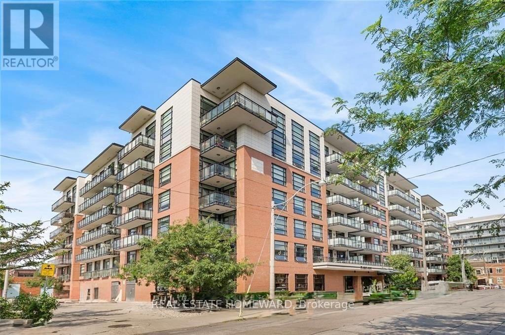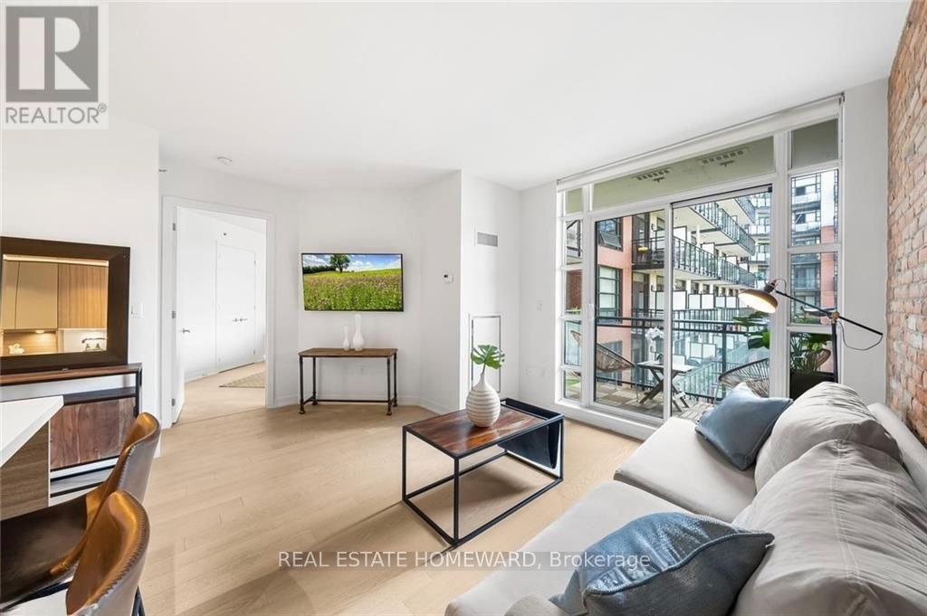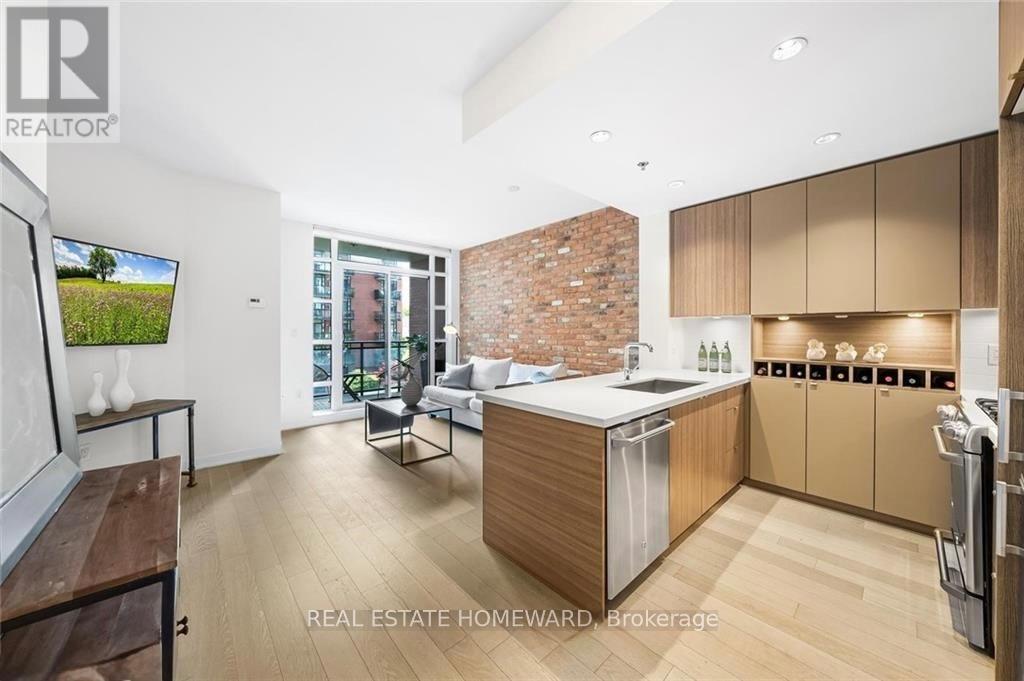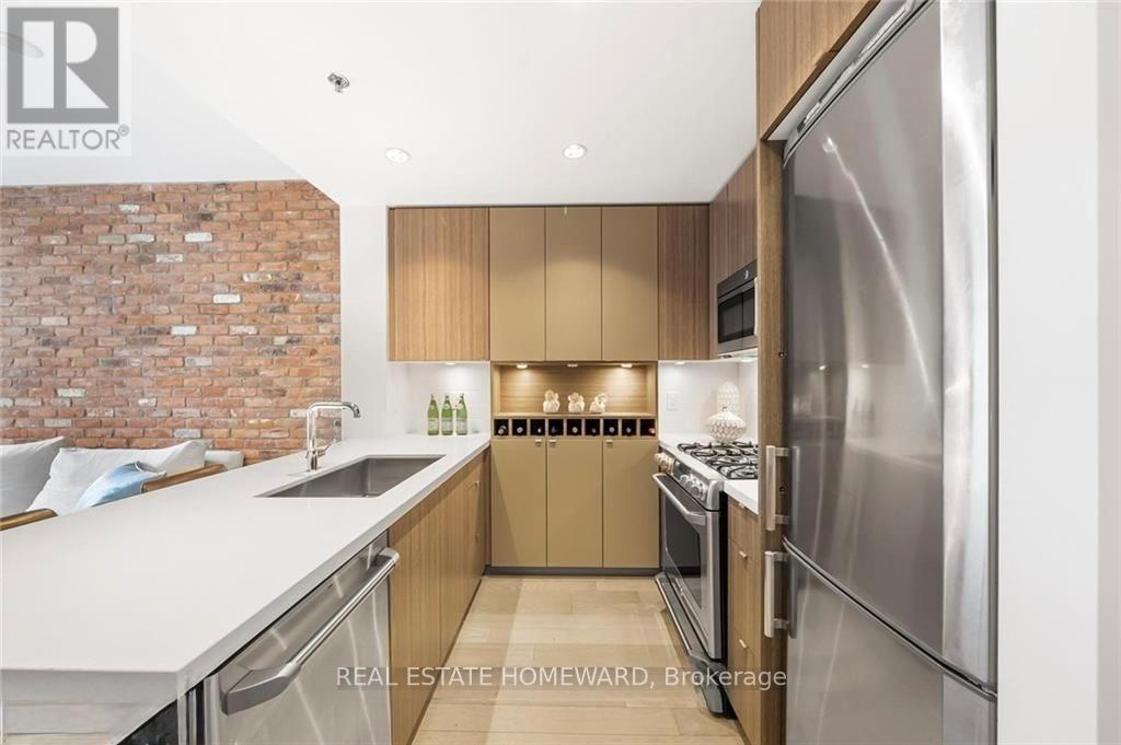 Set in the heart of Leslieville, Showcase Lofts puts you right where you want to be-steps to Queen Street East, local coffee spots, indie shops, neighbourhood favourites, and easy TTC access. Whether you're heading downtown or out of the city, the DVP and Gardiner are close at hand.This one-bedroom condo offers 635 sq. ft. of smart, well-finished living space with a 40 sq. ft. balcony. The open layout features a reclaimed-brick accent wall, floor-to-ceiling windows, high ceilings, wide-plank hardwood floors, and a balcony overlooking the courtyard-perfect for a quiet coffee or evening wind-down.The kitchen blends style and function with woodgrain cabinetry, under-cabinet lighting, quartz countertops, built-in wine storage, an island with seating, pot lights, and stainless steel appliances. In-suite laundry with a stacked washer and dryer keeps things easy.The bedroom is spacious, with a walk-in closet and its own walkout to the balcony. The four-piece bathroom is clean and modern, finished with quartz counters and a deep soaker tub with shower.One parking space and one locker are included for ultimate convenience. Residents also have access to concierge service, a fully equipped gym, media and party rooms, guest suites, and a ground-level patio. (42053621)
