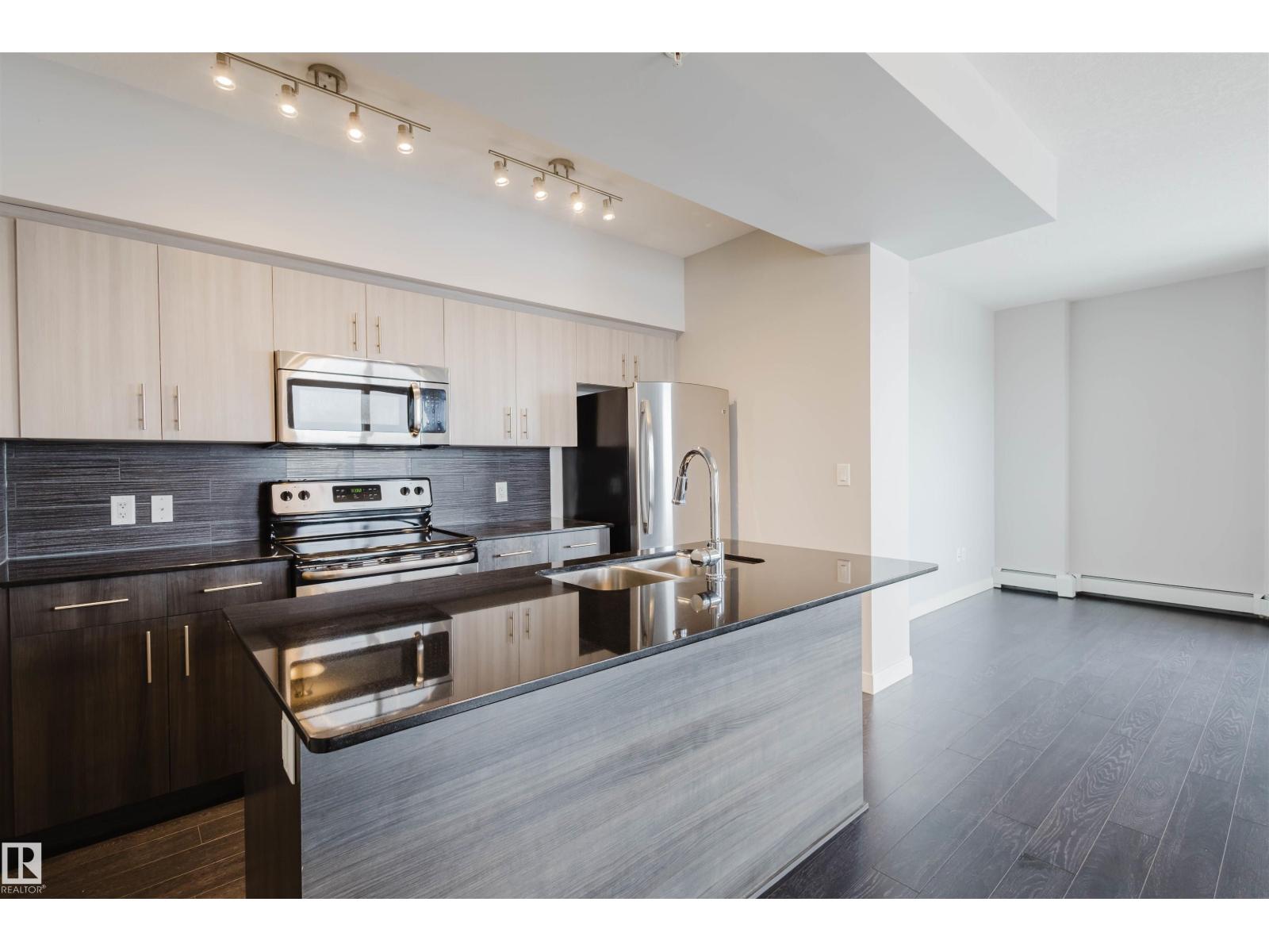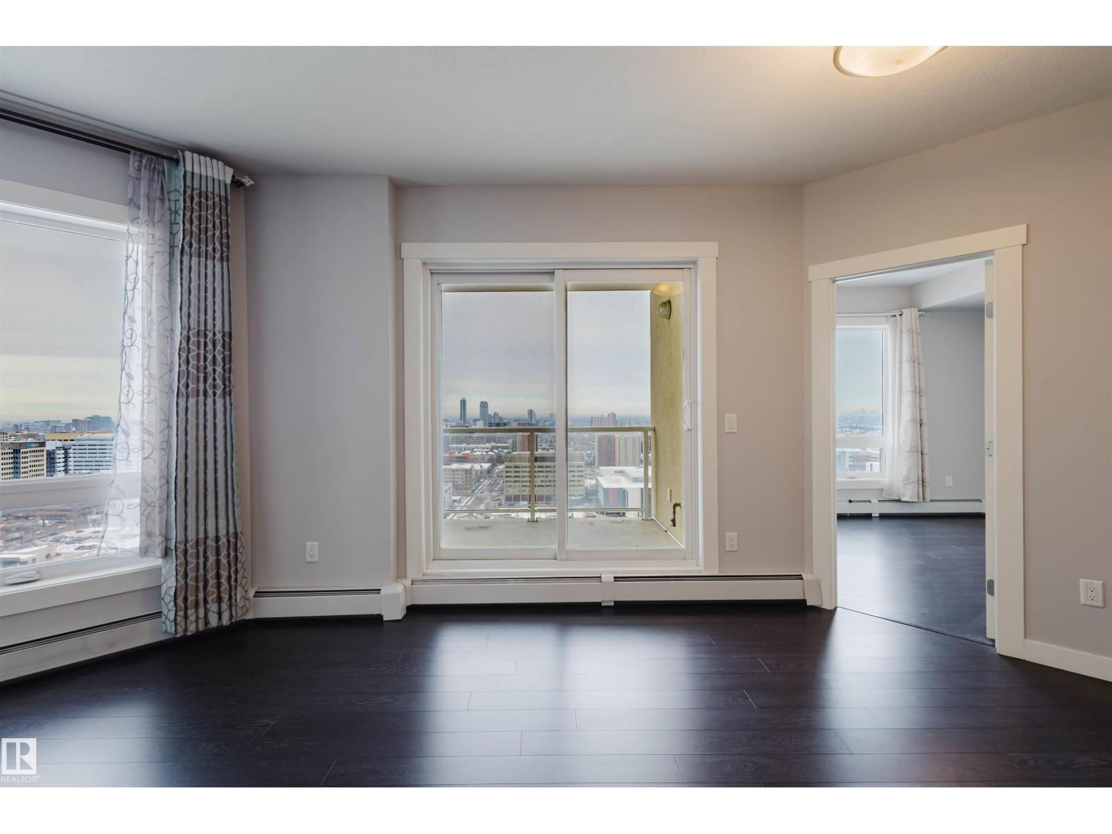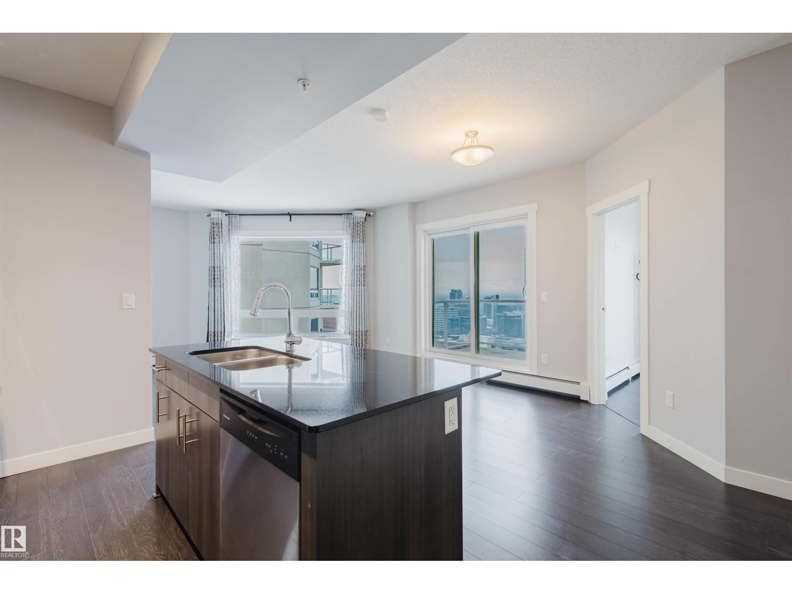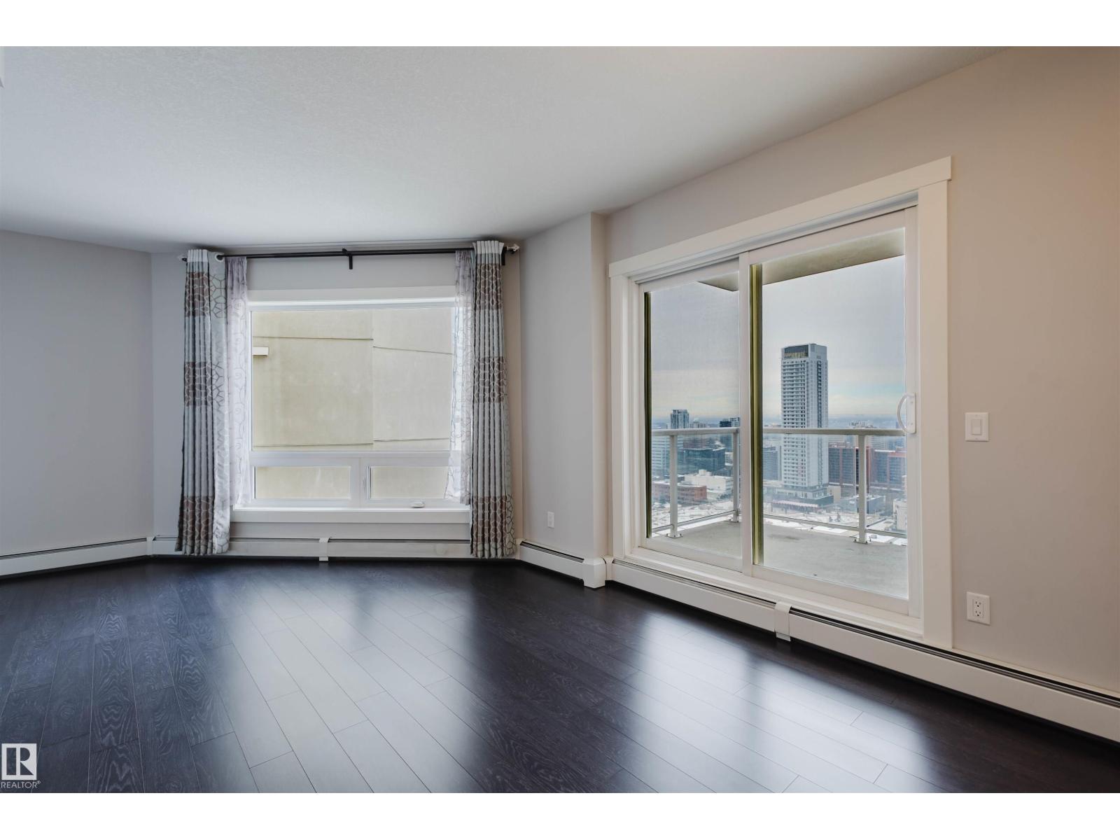 Imagine walking to an Oilers game, then unwinding on your WEST-facing balcony while reflecting on an exciting overtime win while watching the stunning night city skyline? Welcome to this 22nd-floor condo in FOX ONE, offering 2 bedrooms, 2 full baths, and underground TANDEM double parking stalls. The bright open-concept layout features rich laminate flooring throughout. The gourmet kitchen is equipped with quartz countertops, stainless steel appliances, and contemporary cabinetry—perfect for everyday living and entertaining. The primary suite provides a peaceful retreat with a 4-piece ensuite and walk-through closet. A spacious second bedroom features a large west-facing window, filling the space with natural light. Enjoy breathtaking city views from your private west-facing balcony with BBQ gas line. Unbeatable downtown location—steps to Rogers Place, MacEwan University, LRT, restaurants, and shopping. Experience vibrant downtown living at its best! (33780822)