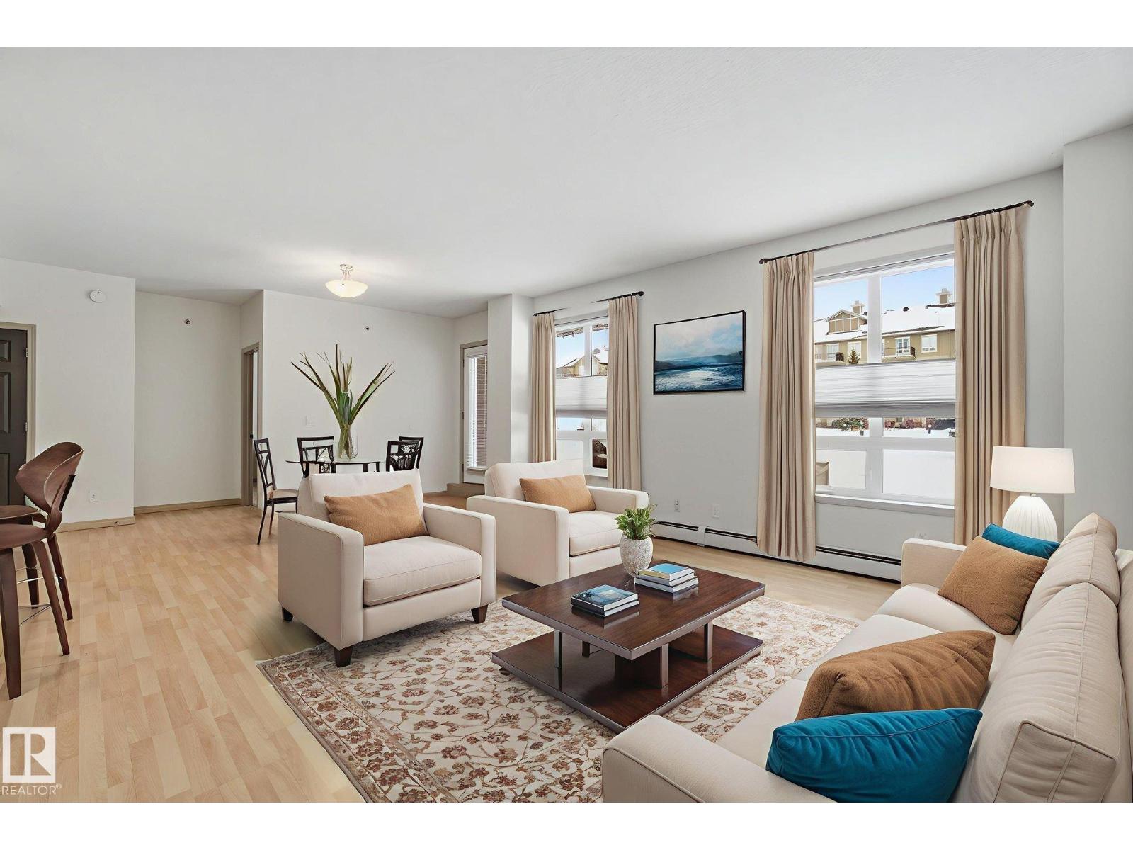 Perched on the main floor of the solid, quiet concrete Holland Gardens, this corner 2-bedroom, 2-bathroom home offers a rare and inviting lifestyle. Step directly onto your private patio, overlooking a lush, park-like central courtyard—an ideal setting includes a natural gas hook-up. Inside, an exceptionally bright and airy atmosphere is created by 9-foot ceilings and an abundance of oversized windows. The open-concept layout is perfect for daily living and entertaining, flowing from the spacious living and dining area into a charming kitchen featuring cork flooring, a generous breakfast bar, and plenty of cabinetry. The primary suite is a true retreat with a walk-through closet leading to a private 4-piece ensuite. A second, generously-sized bedroom, in-suite laundry, and a large entry closet complete this thoughtful floor plan. Your ownership includes TWO underground parking stalls and a storage locker. Unbeatable value: $699 condo fee COVERS ELECTRICITY, heat, water & sewer. Truly a MUST-SEE!!! (33780911)