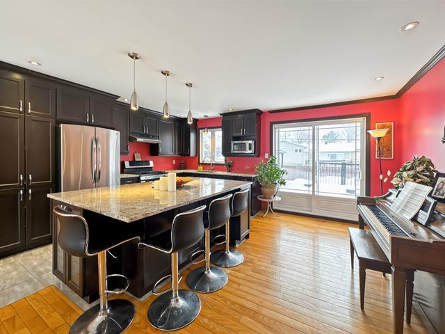 Generous volumes, a warm atmosphere, and versatile spaces define this property, ideal for modern family life. * Open and bright main floor * Huge split-level living room * Kitchen with a large work surface and quartz countertops, including a spacious island with a breakfast nook * 2+1 bedrooms and the possibility of a 4th * Comfortable family room, enhanced by a brick wall and a gas stove * The lower level features two multi-functional spaces with a second access to the basement and backyard * A superb, inviting landscaped backyard with terraces and a pool completes this sought-after living environment in Boucherville * Welcome home :) (40365394)