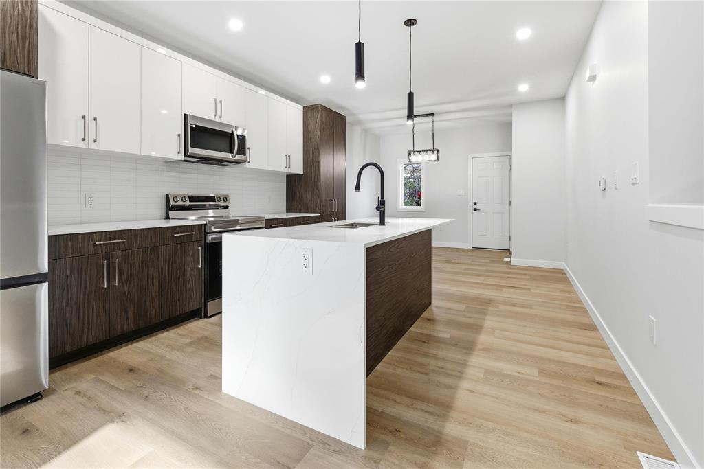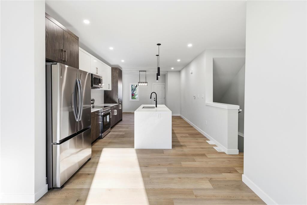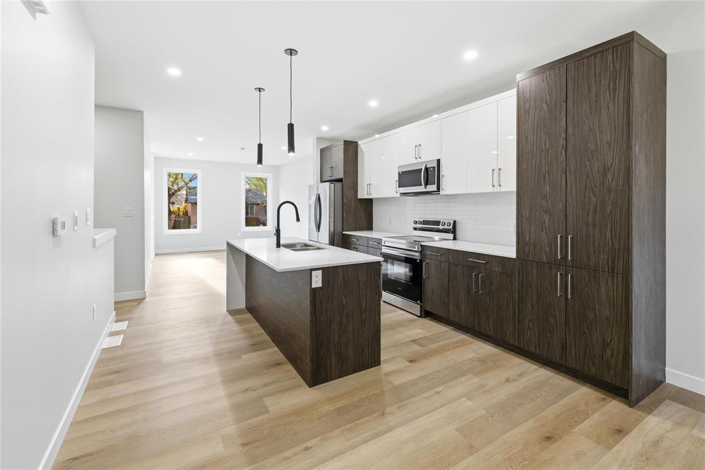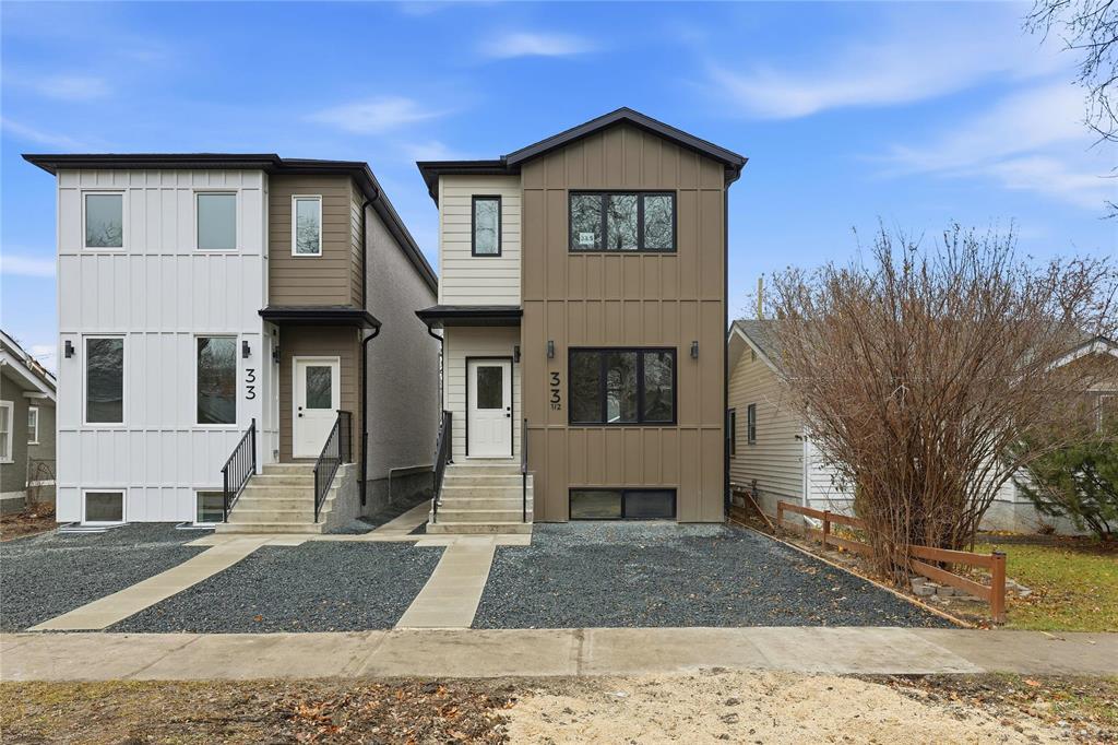 2D//Winnipeg/Ready to move in Duplex built by Galaxy Custom Homes, and ideally located on a quiet street in the desirable St. Vital neighbourhood. Designed with comfort and functionality in mind, this property is the perfect investment opportunity. The main unit spans 1,497 sq ft over the main floor and basement, offering 9-foot ceilings, stylish luxury vinyl plank flooring, and a bright, open-concept layout. The main level features a spacious dining area, a modern eat-in kitchen with quartz countertops and custom cabinetry, and a convenient 2-piece bathroom. The lower level includes a large primary bedroom with a walk-in closet and 4-piece ensuite, two additional bedrooms, a 3-piece bathroom, and in-suite laundry. The secondary suite, located on the upper level, offers 740 sq ft of well-lit living space with vaulted ceilings, an open-concept living area, an eat-in kitchen, two bedrooms, a 4-piece bath, and private laundry. Each unit has its own entrance, meters, and A/C. Concrete parking also included. Covered by a New Home Warranty, this property is also a fantastic income generator, with estimated rental potential of $2,200 for the main unit and $1,700 for the secondary suite. Don t miss out reach out today! (231912247)