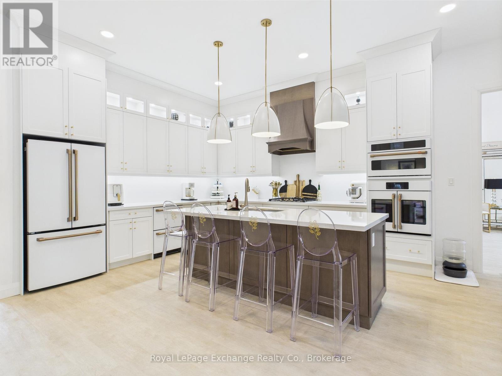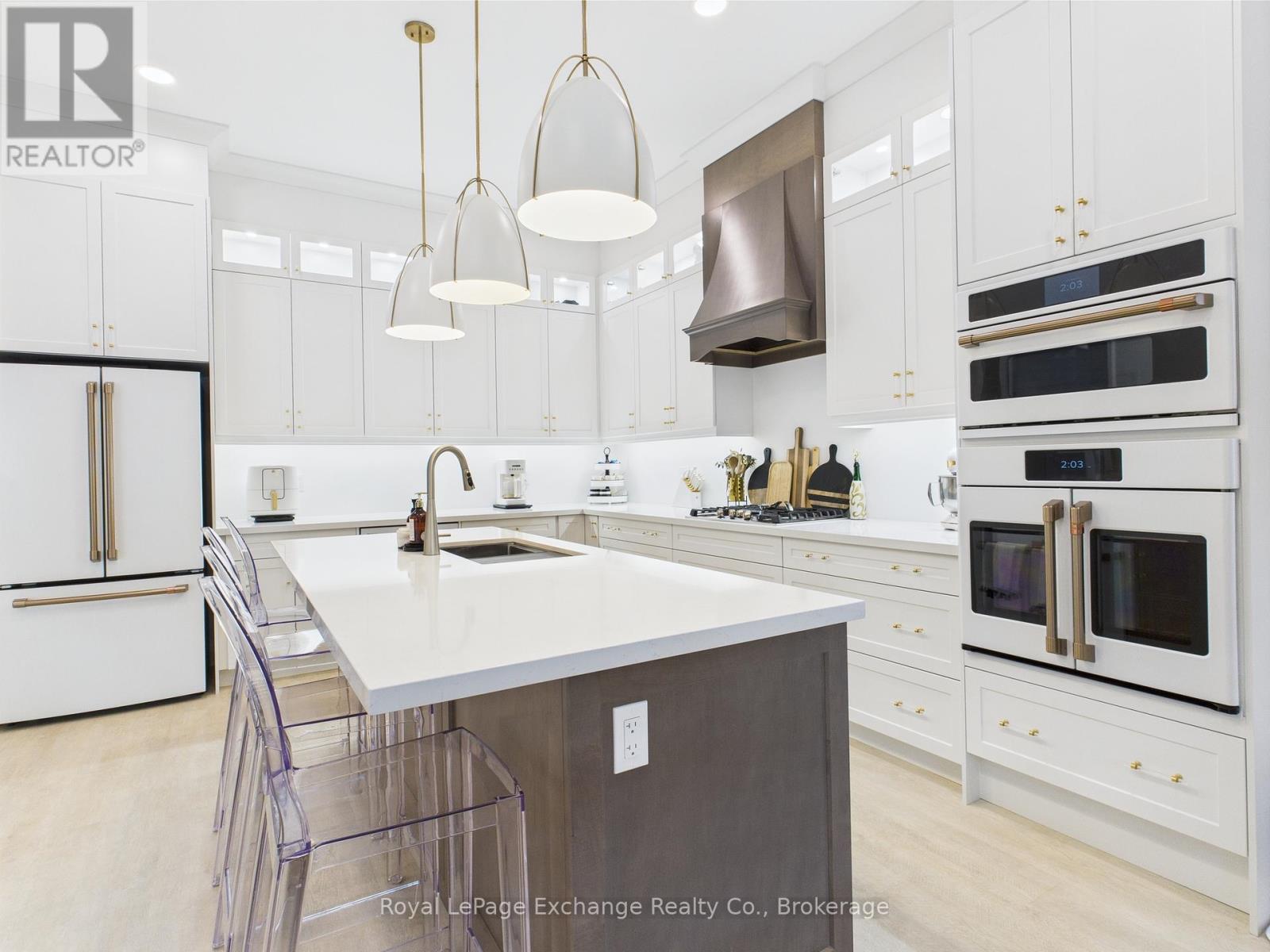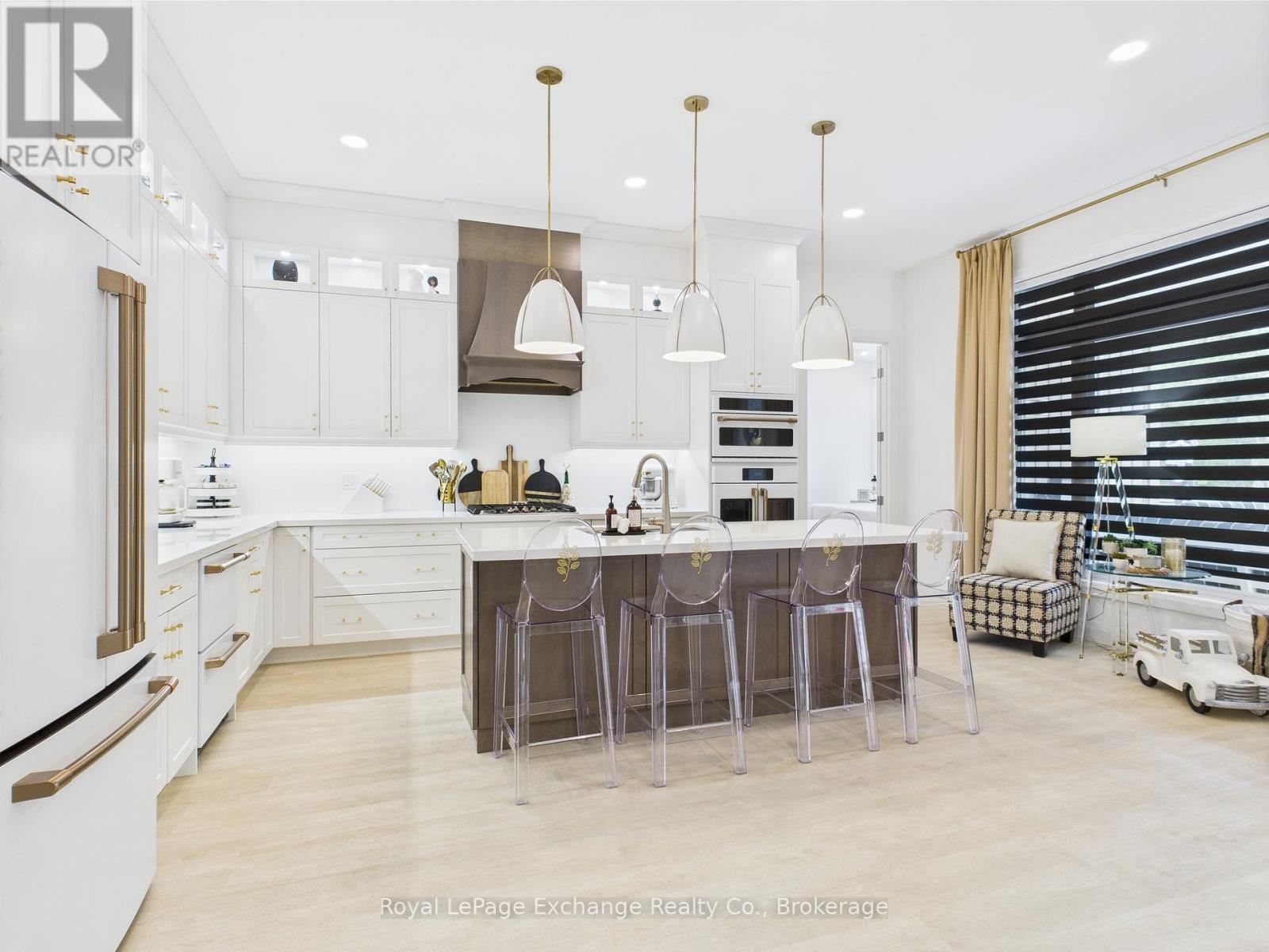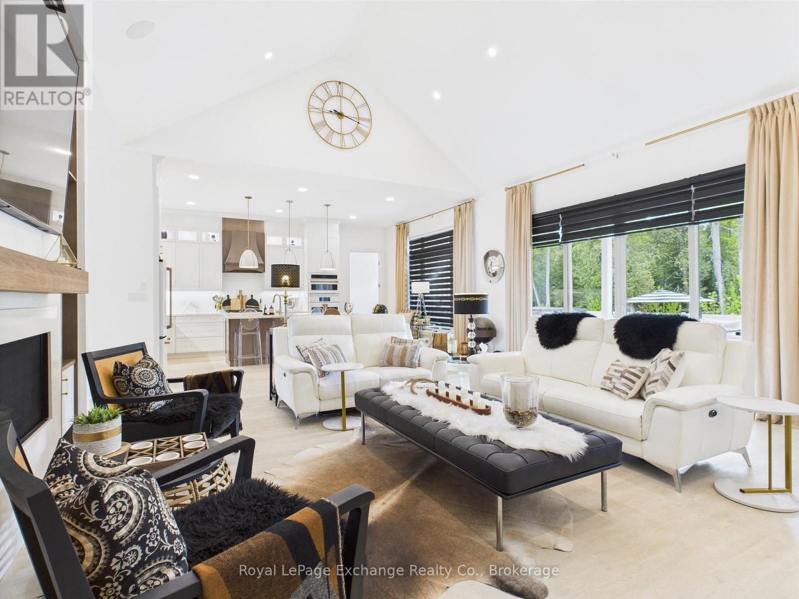 Experience luxury, comfort, and modern design in this executive bungalow just a short walk from the shores of Lake Huron in Point Clark. Exceptional curb appeal highlights the stone and brick façade, welcoming covered porch with extra-height front door, and triple-car garage complete with EV charger.Inside, the grand foyer opens to soaring 10' ceilings, an open-concept layout filled with natural light, and stylish LVP flooring. The dining room features a tray ceiling and dual-sided fireplace shared with the great room, which offers a cathedral ceiling, ceiling speakers, patio doors, and included 80" LG TV. The chef-inspired kitchen boasts extended-height cabinetry, quartz countertops, a large island, Café appliances, and a walk-in pantry.The primary suite is a private retreat with a spa-like ensuite and spacious walk-in closet. Two additional bedrooms each feature walk-in closets and private ensuites. Step outside to a fenced backyard oasis with covered porch, ceiling speakers, lounge areas, and a swim spa. Smart home features complete this exceptional property near the lake. (42057077)