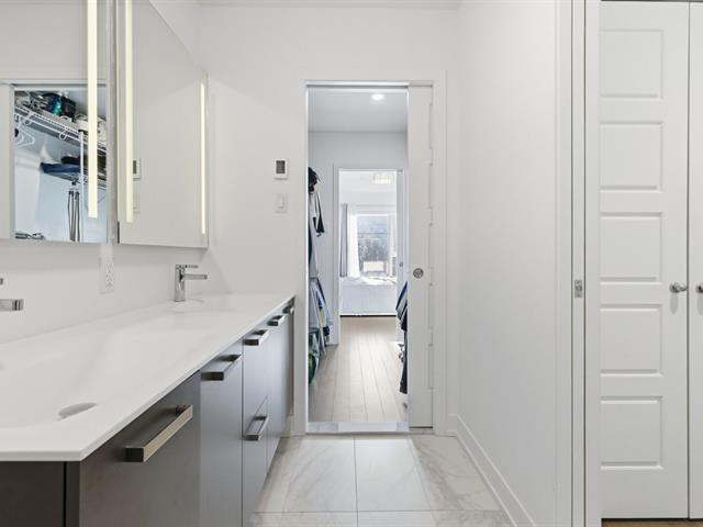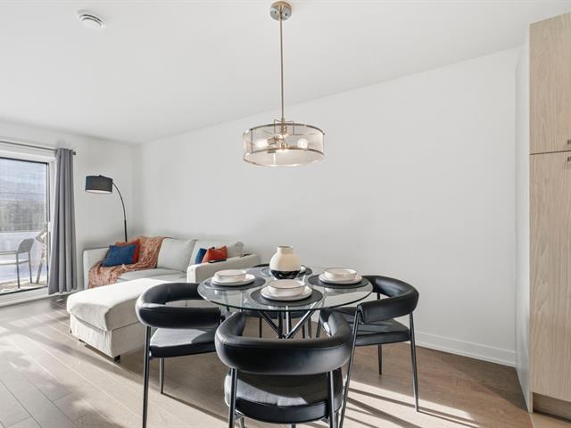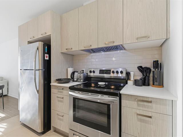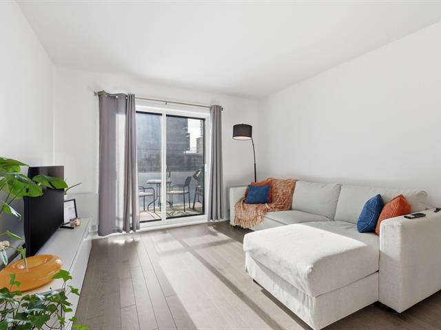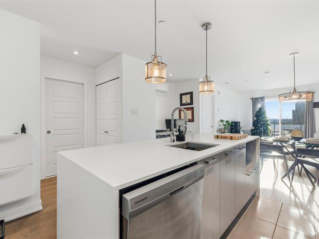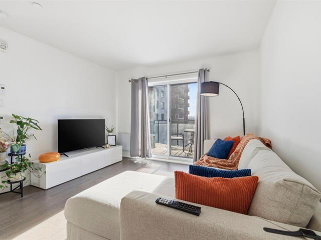 Located on the 7th floor of a sought-after contemporary building, this spacious and sun-filled 1-bedroom unit faces south and offers unobstructed views of Mount Royal and Saint Joseph's Oratory. It features a modern kitchen with a quartz island and stainless steel appliances, an open living room leading to a private balcony, a bedroom with walk-in closet connecting to a refined bathroom with double vanity and heated floors, a dedicated office nook ideal for working from home, a closed laundry area, indoor parking with storage, access to a landscaped private garden, and a secure building just steps from Montmorency metro. (46077617)